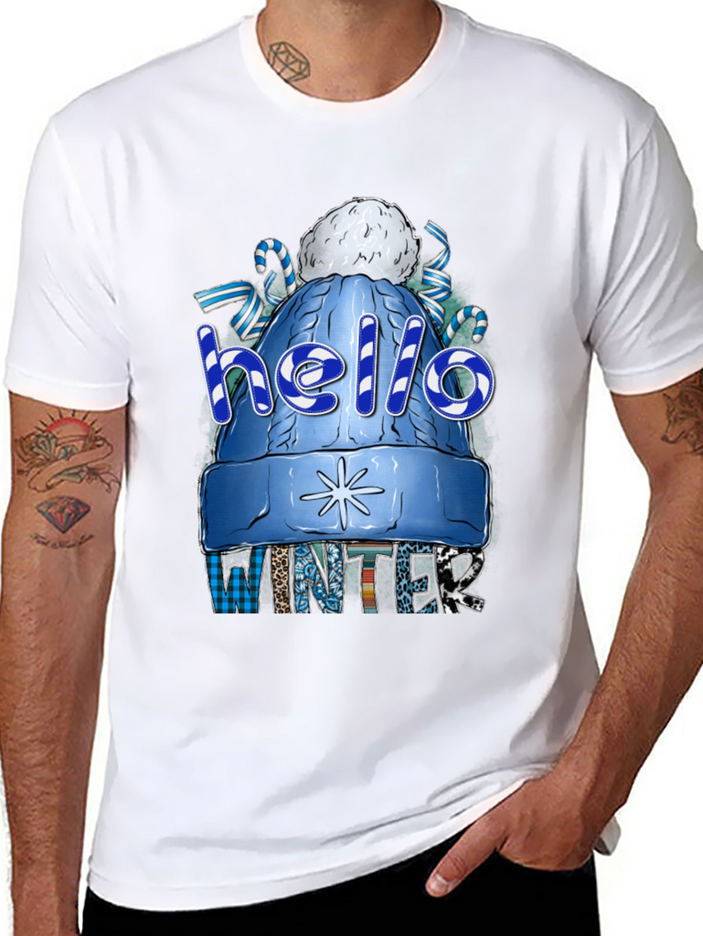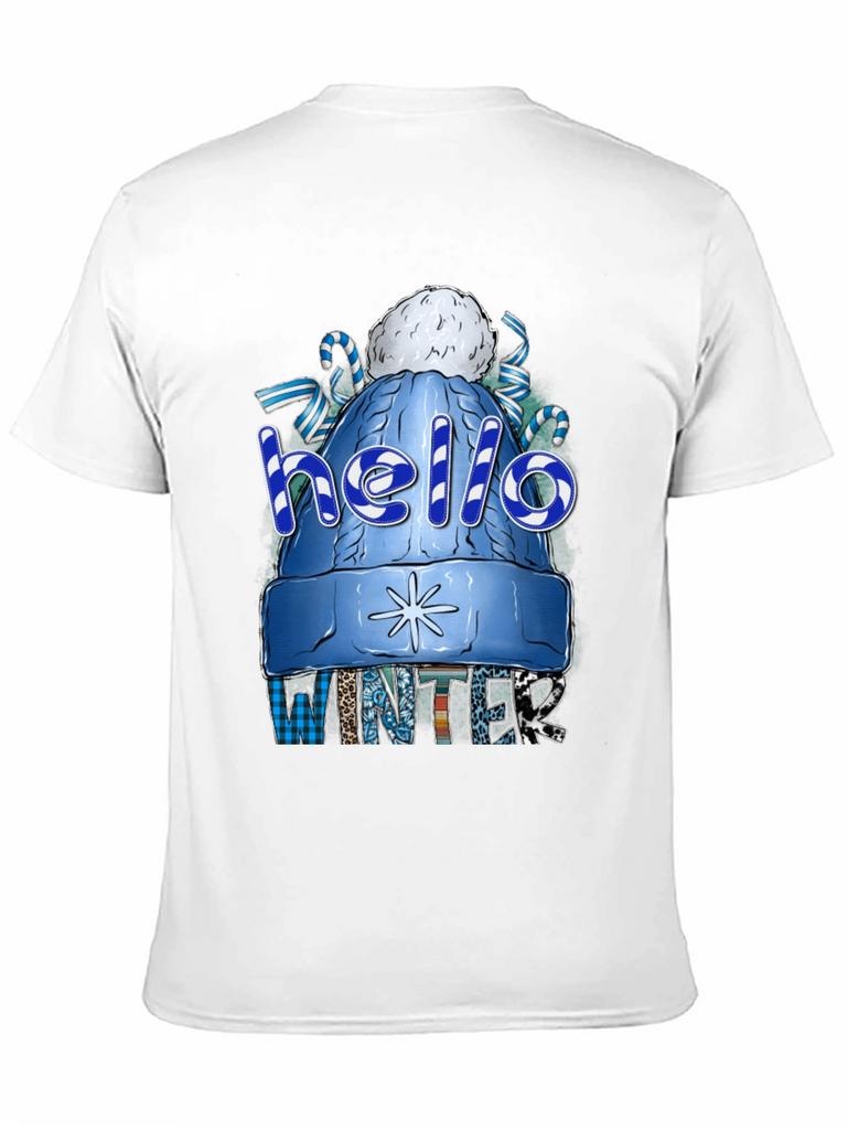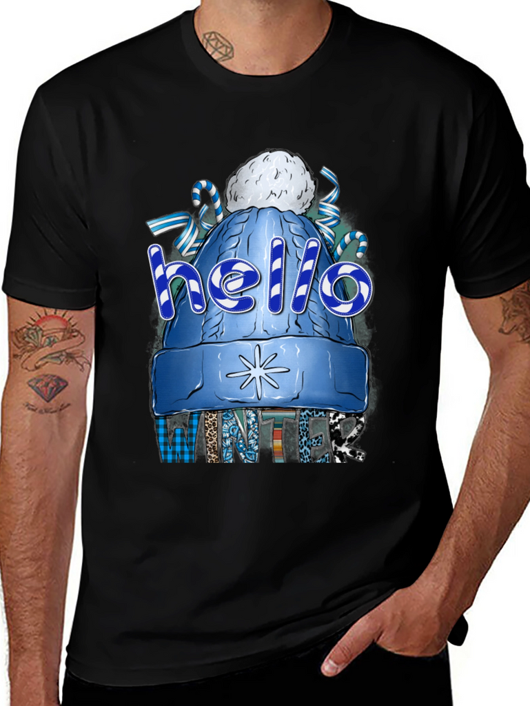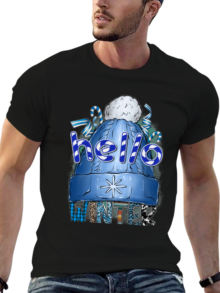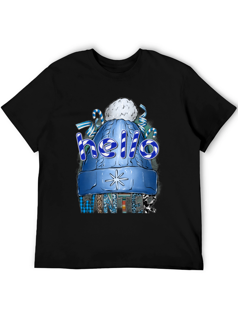 Embrace the winter season with this unique black graphic tee. It features a stylized image of a blue winter hat, complete with a fluffy white pompom. The word 'Hello' is creatively incorporated into the hat's design, while the brim displays the word 'Winter' in a variety of fun patterns. Perfect for casual wear during the colder months, this t-shirt offers a comfortable fit and a touch of seasonal charm. Made from a soft and breathable fabric, it's ideal for layering or wearing on its own. Show off your love for winter with this eye-catching and stylish tee.