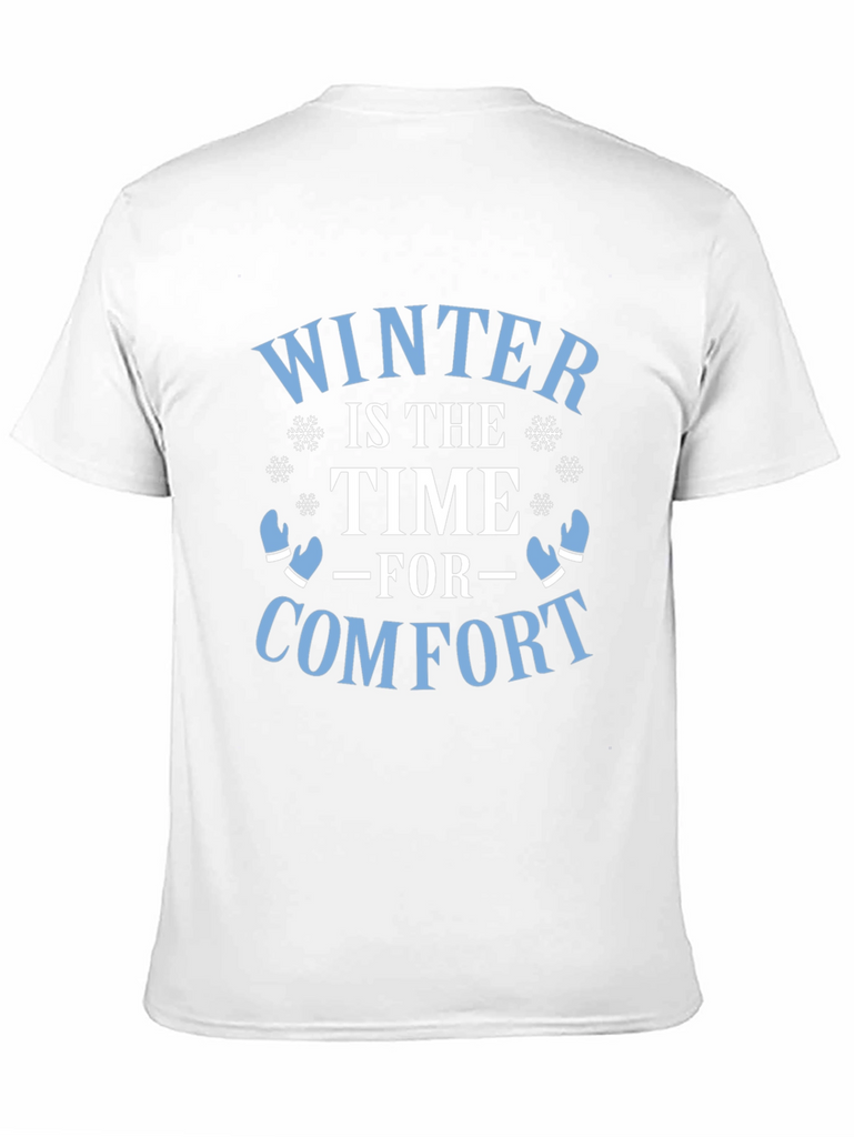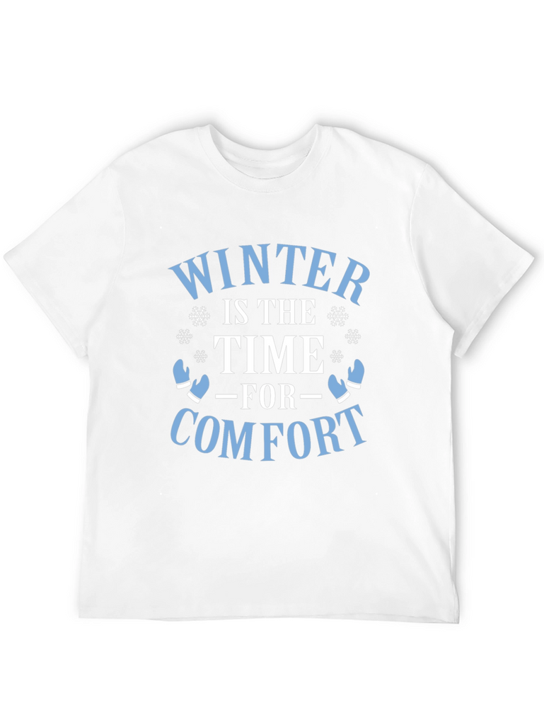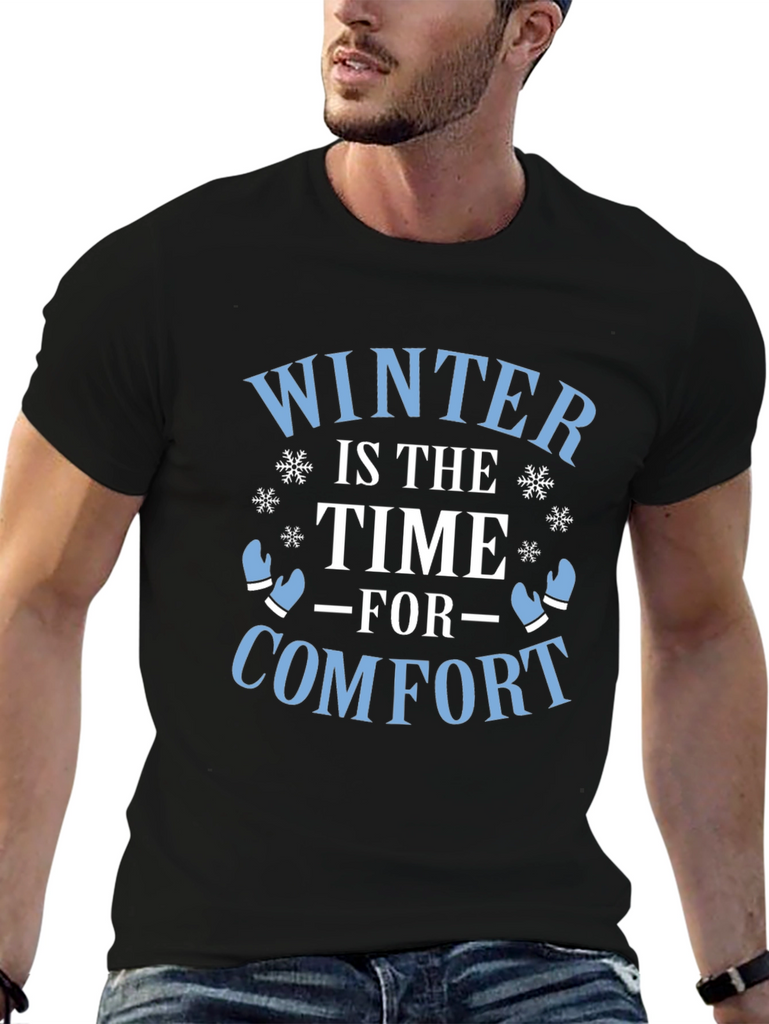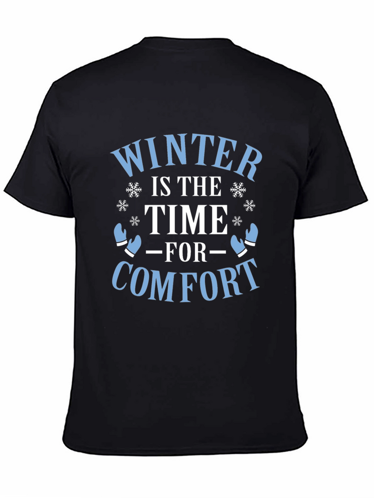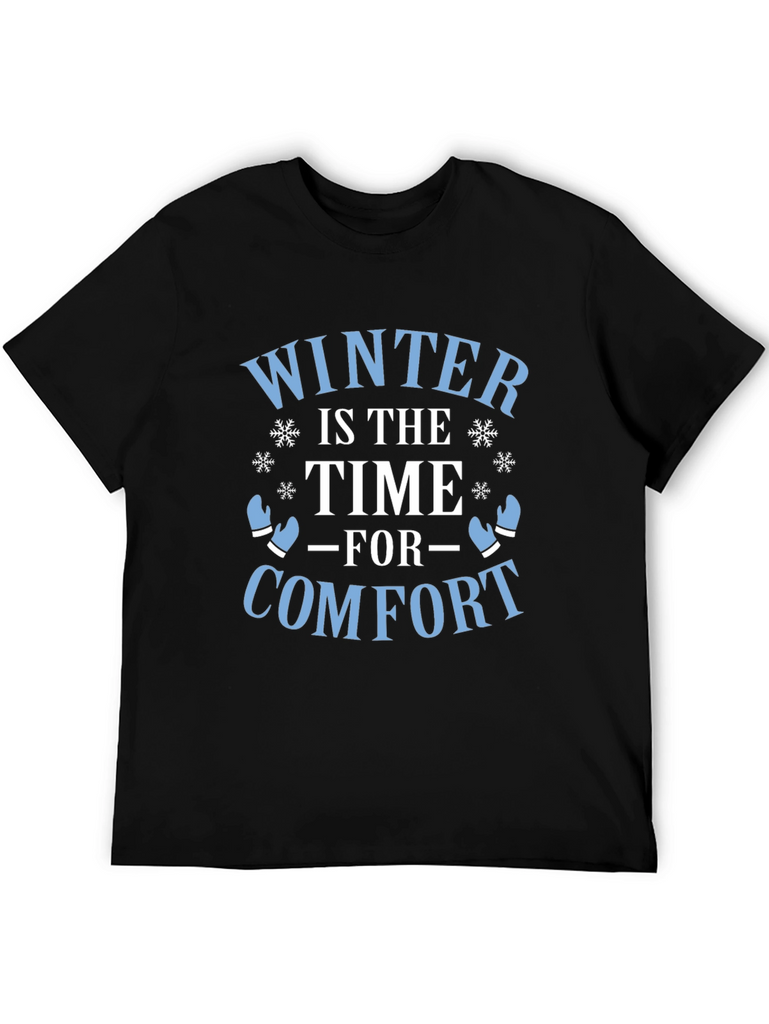 Stay cozy this winter with our stylish black t-shirt! Featuring a playful design with the phrase "Winter is the time for comfort" in a light blue font, adorned with snowflakes and mitten graphics, this tee combines comfort and seasonal charm. Made from a soft-looking fabric, it's perfect for layering or wearing on its own during those chilly days. Show off your love for the winter season in style! Makes a great gift!