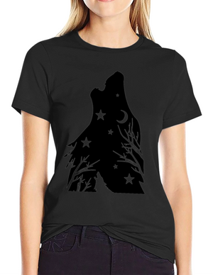 Wolf Howling Moon Star Graphic Print Tee - Black