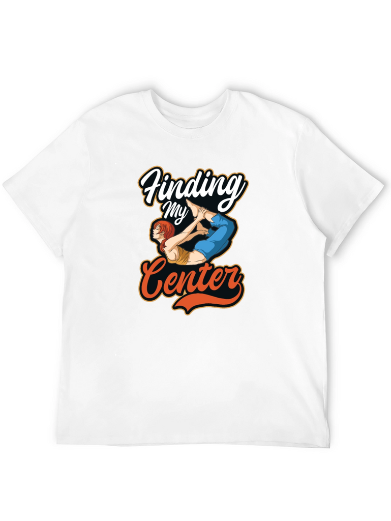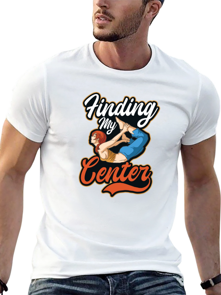 Find your inner peace with this stylish black t-shirt. Featuring a unique design of a woman in a yoga pose alongside the words 'Finding My Center', it perfectly captures the essence of mindfulness and well-being. Made from soft and breathable fabric, this tee offers all-day comfort whether you're hitting the yoga mat, running errands, or just relaxing at home. Its classic crew neck and short sleeves make it a versatile addition to your wardrobe. Express your passion for yoga and promote a positive message with this eye-catching and comfortable t-shirt.
