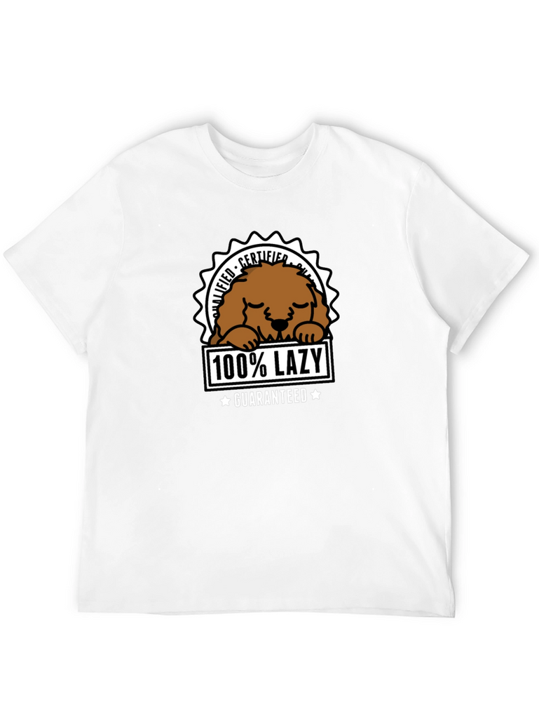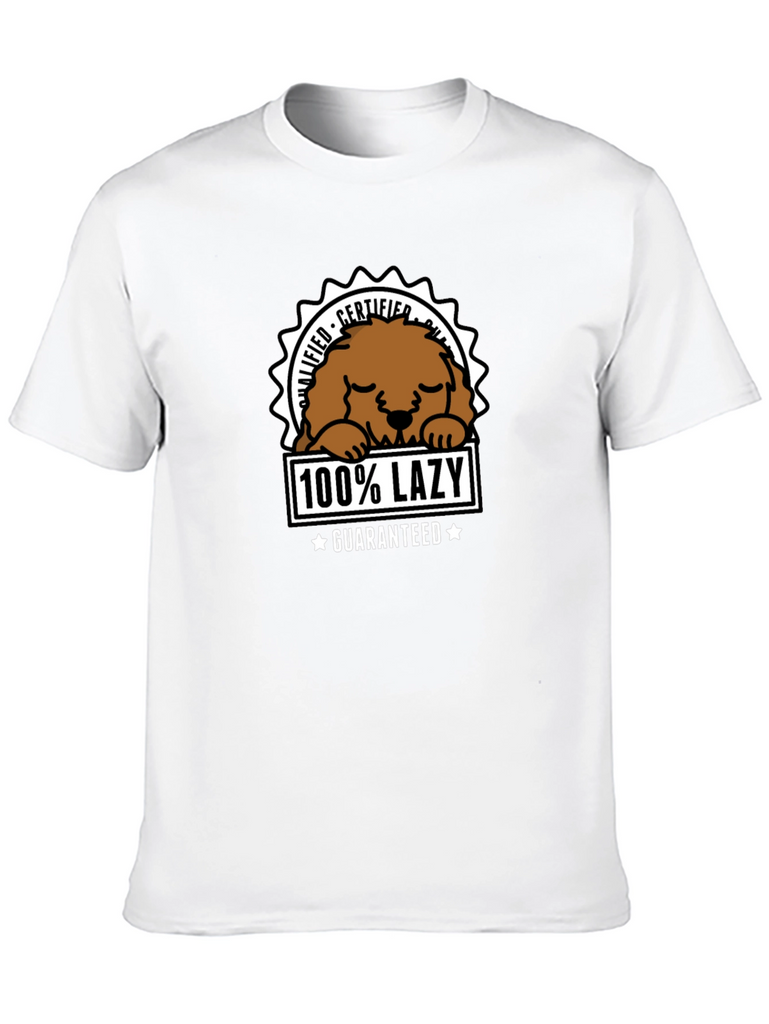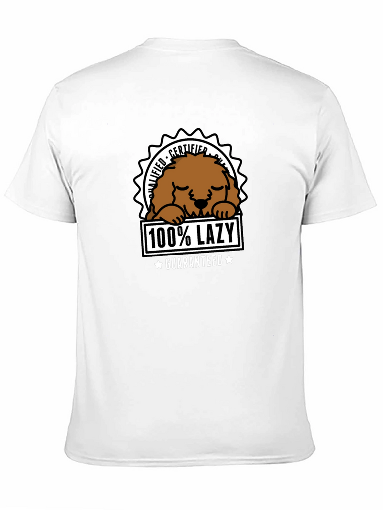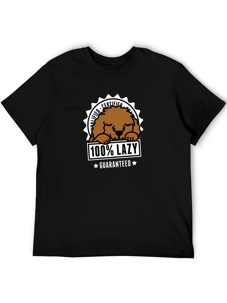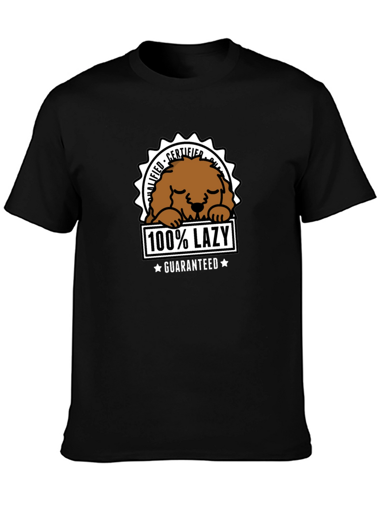Showcase your love for lounging with this fun and comfy black t-shirt. The design features a cute, brown cartoon dog resting under a '100% Lazy Guaranteed' banner, surrounded by a 'Certified Qualified' seal. This playful graphic adds a touch of humor to your wardrobe. Perfect for casual wear, lounging at home, or as a gift for dog lovers with a laid-back attitude. Soft and breathable, this shirt is made for ultimate comfort and style. Guaranteed to make you smile!