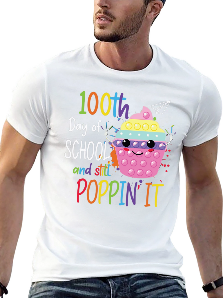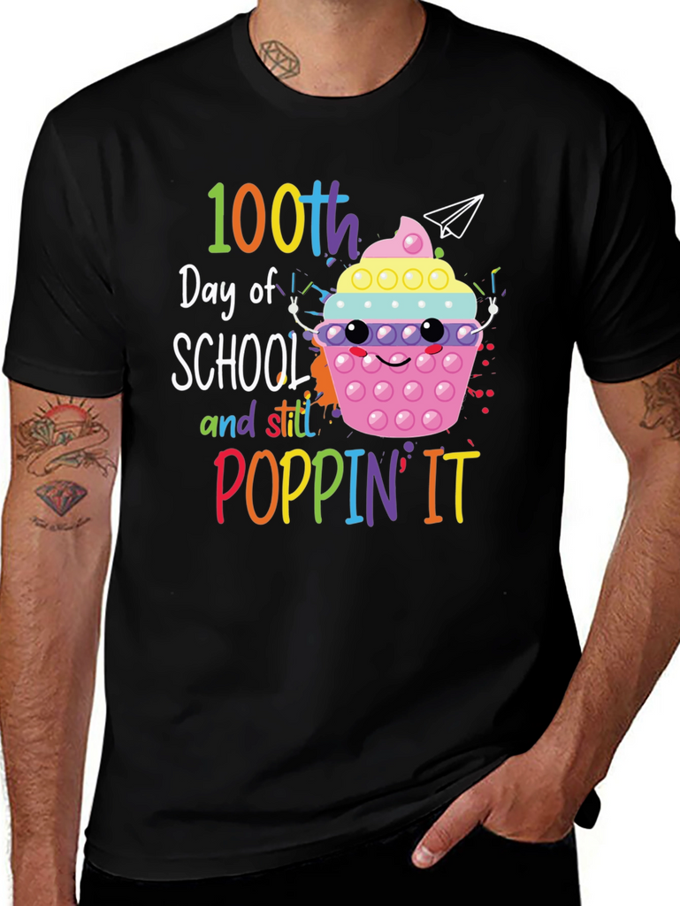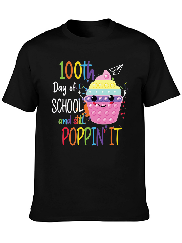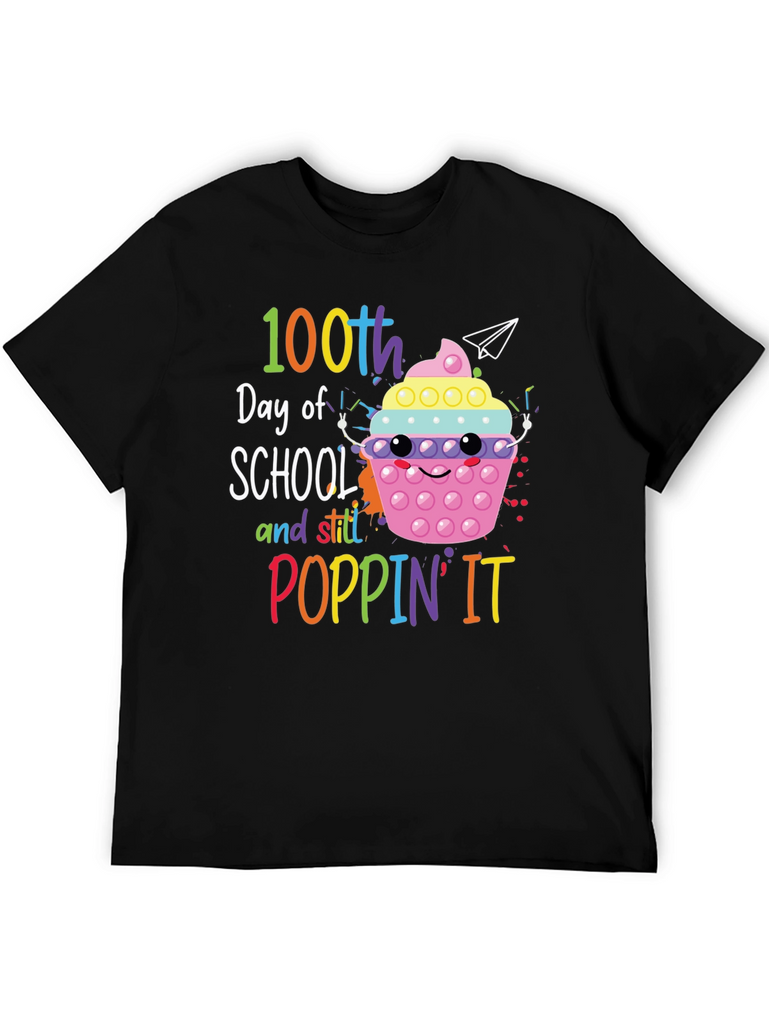 Celebrate the 100th day of school with this fun and vibrant t-shirt! This black t-shirt features a colorful design with the phrase "100th Day of SCHOOL and still POPPIN' IT". The design includes a cartoon-style cupcake decorated with multi-colored circles, resembling a popular sensory toy. Bright, eye-catching lettering in various hues of the rainbow adds to the playful aesthetic. This shirt is perfect for students, teachers, or anyone who wants to commemorate this special milestone with style and humor. Great for everyday wear or school events. A memorable way to show school spirit!