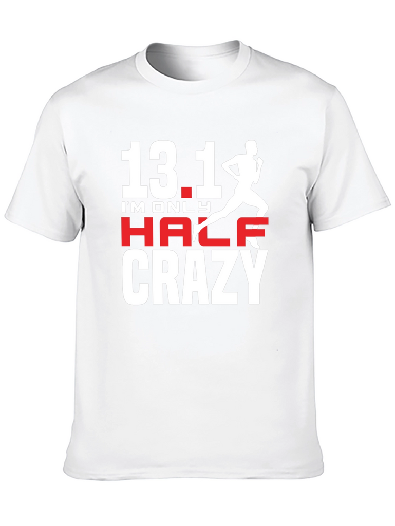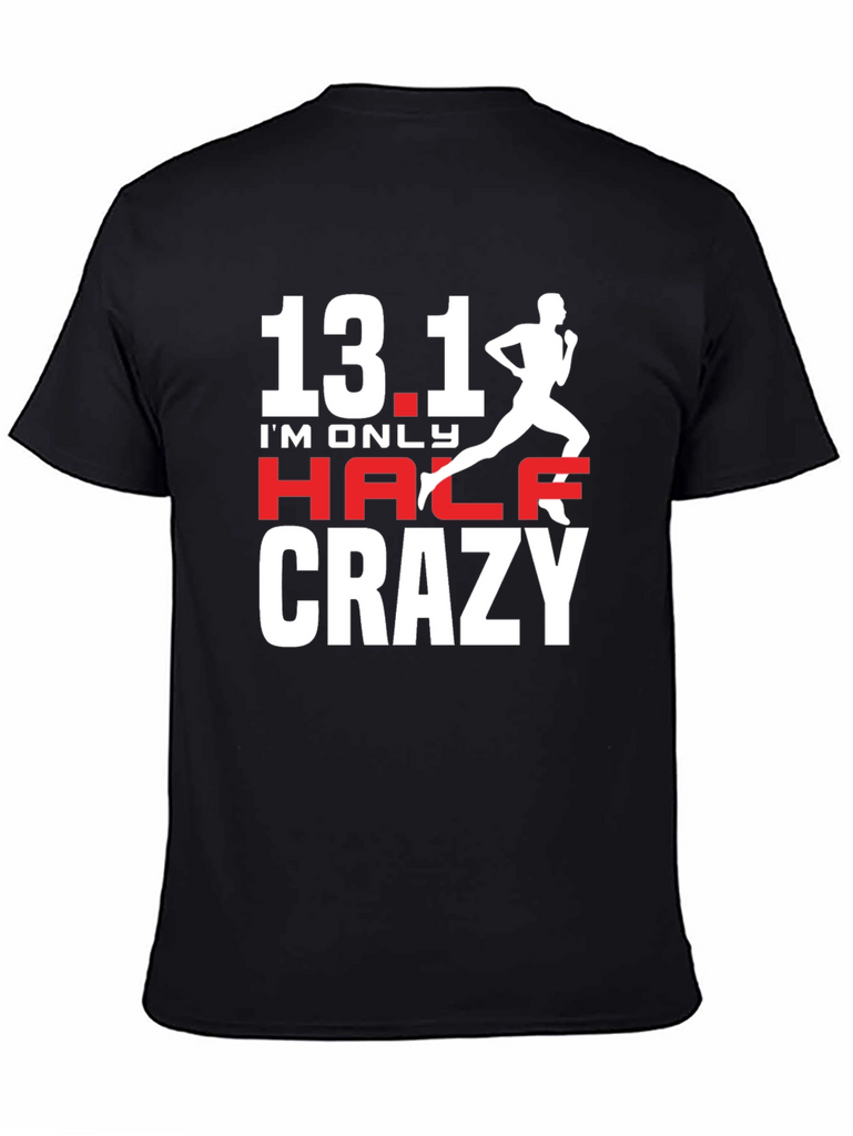 Show off your love for running with this stylish black t-shirt. Featuring the design "13.1 I'm Only Half Crazy" in white and red lettering, this tee is perfect for marathon runners and enthusiasts. A runner silhouette completes the design, adding a sporty touch. Made from soft and comfortable fabric, it's ideal for everyday wear or your next race. Whether you're training for a marathon or cheering from the sidelines, this t-shirt is a great way to express your passion. Get yours today and let everyone know you're only half crazy!