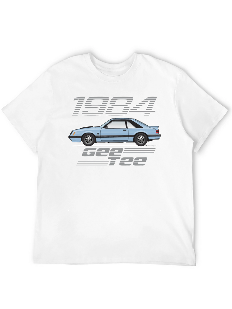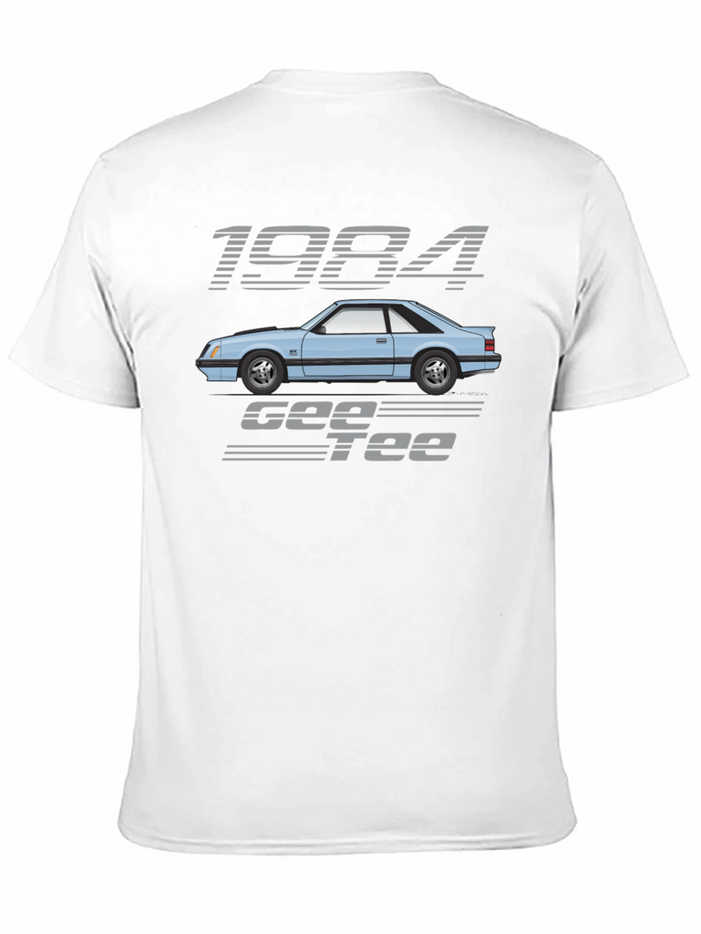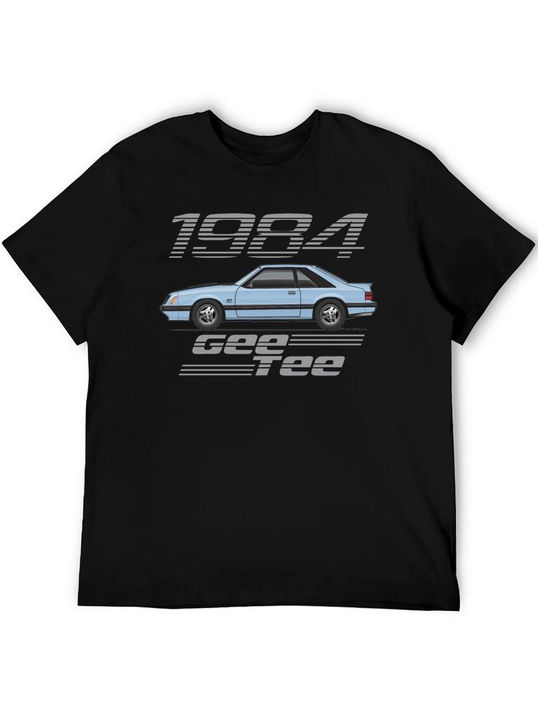 Show off your classic style with this sleek black t-shirt featuring a vintage-inspired graphic. The design showcases a light blue 1984 car, accented by the words '1984' and 'GEE TEE' in a stylish, retro font. The graphic has subtle horizontal lines in order to appear as it is a screen print. This tee is perfect for car enthusiasts, vintage lovers, or anyone who appreciates a cool and comfortable casual look. Made from a soft, breathable fabric, it's ideal for everyday wear. Pair it with jeans or shorts for a relaxed and stylish outfit.