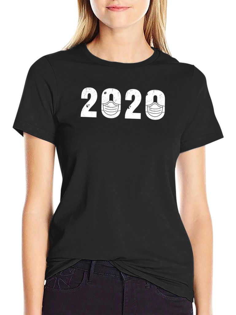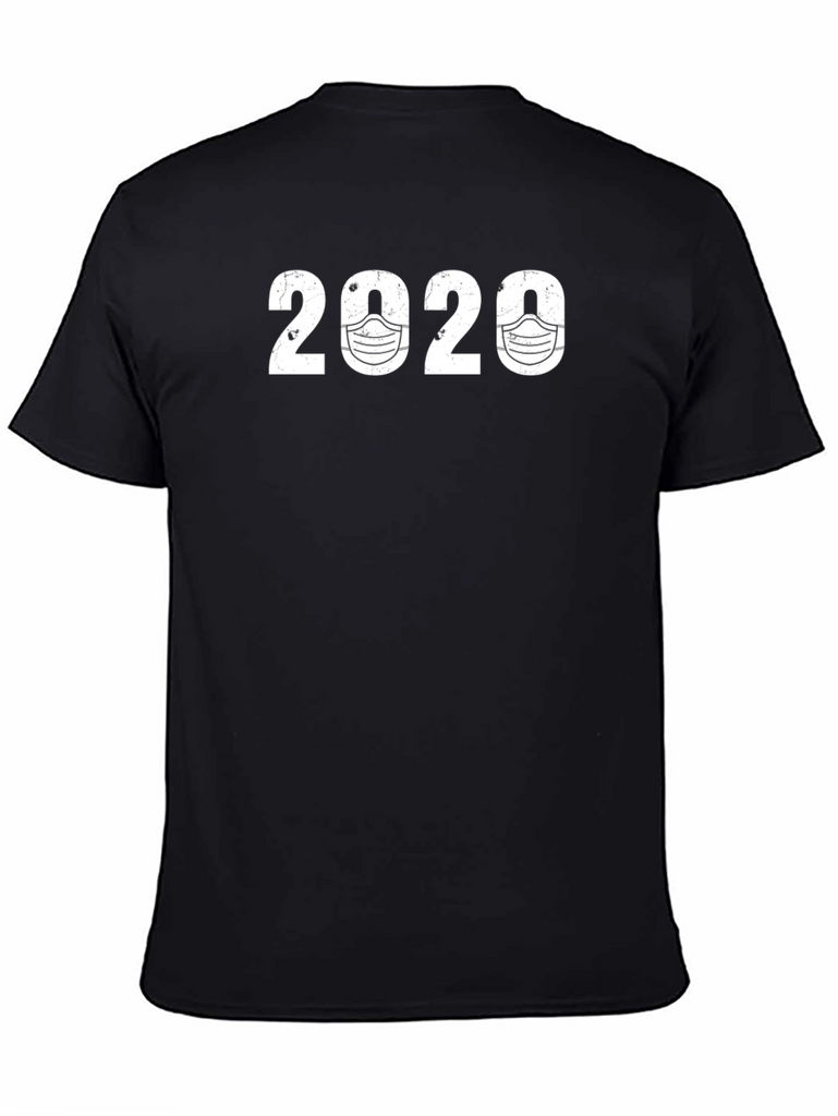 This unique black t-shirt features a clever novelty design, replacing the zeros in '2020' with illustrations of face masks. Made from a comfortable-looking fabric, this short-sleeved shirt is perfect for casual wear. The graphic is distressed, giving it a vintage or worn-in feel. It's a fun and topical way to commemorate or poke fun at the year 2020 and the prevalence of face masks. Ideal for everyday wear, social gatherings, or as a conversation starter, this tee combines comfort with a touch of humor and historical relevance. A must-have for those who want to remember or make light of a unique period in time.