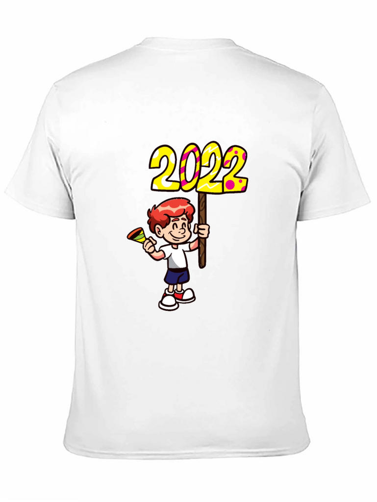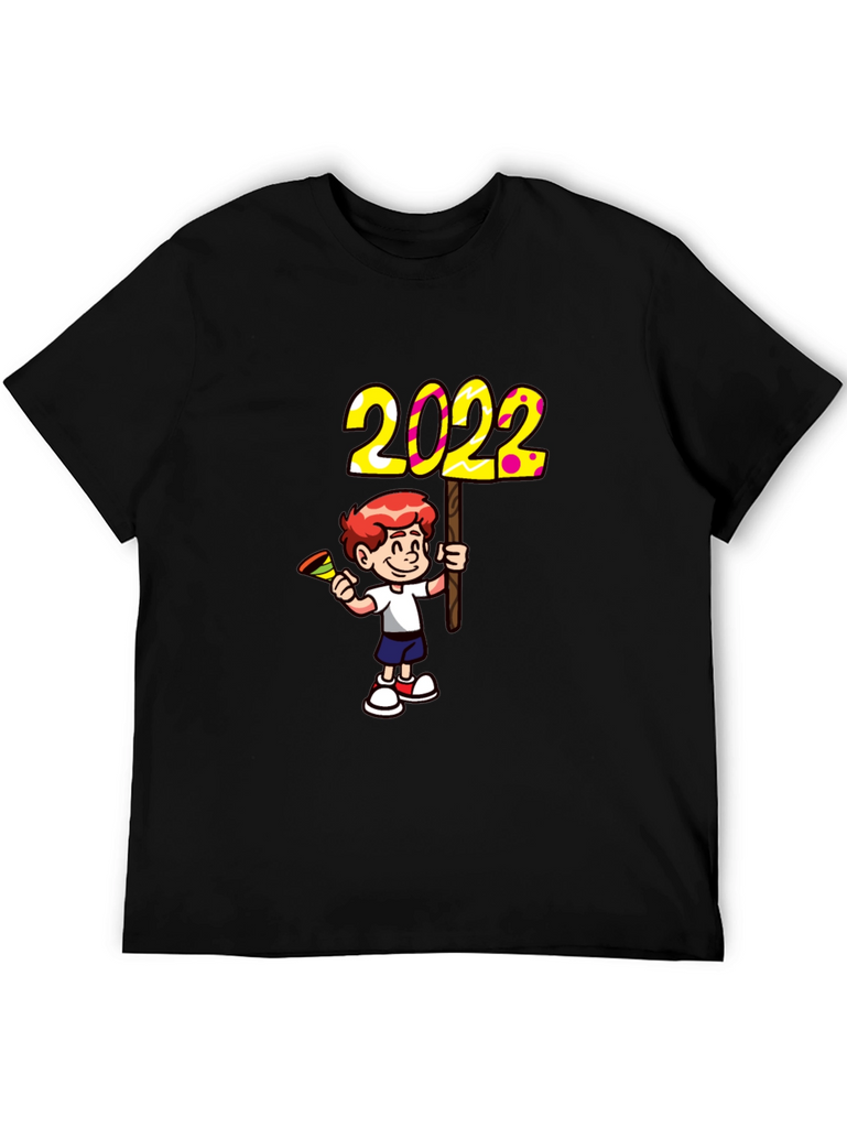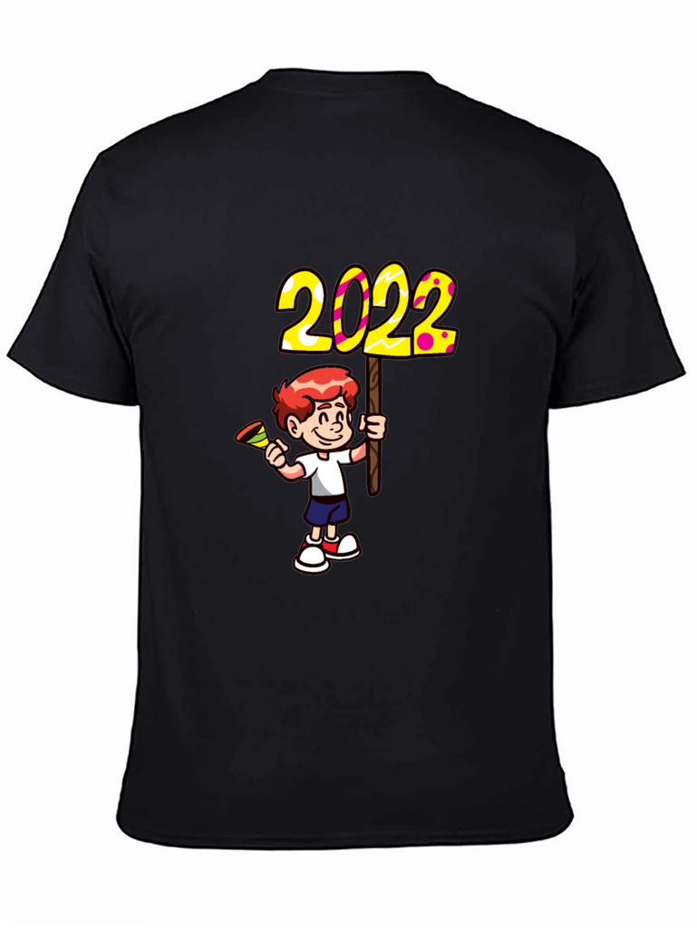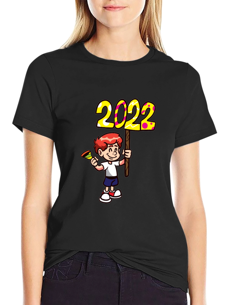 Celebrate the new year with this fun black t-shirt! The tee features a vibrant cartoon graphic of a boy holding a sign with "2022" displayed in a playful, colorful font. Perfect for casual wear, parties, or as a unique gift. The shirt appears to be made of a soft and breathable material, ensuring comfort. This eye-catching design is sure to bring smiles and good vibes wherever you go. Get yours today and start the year in style!