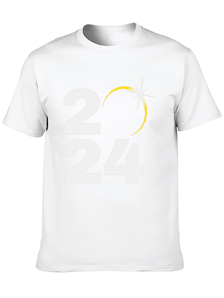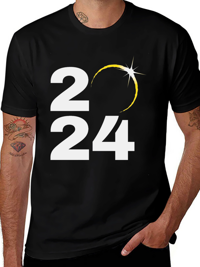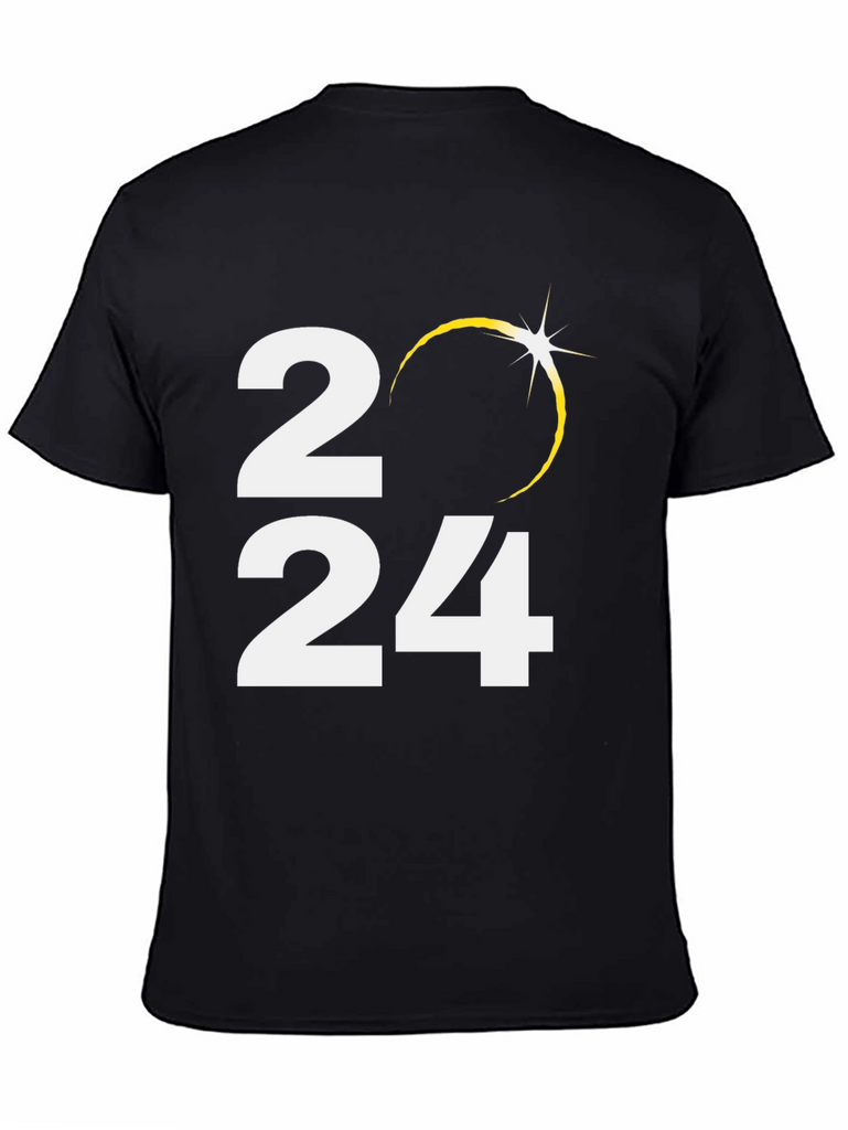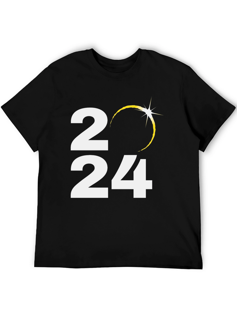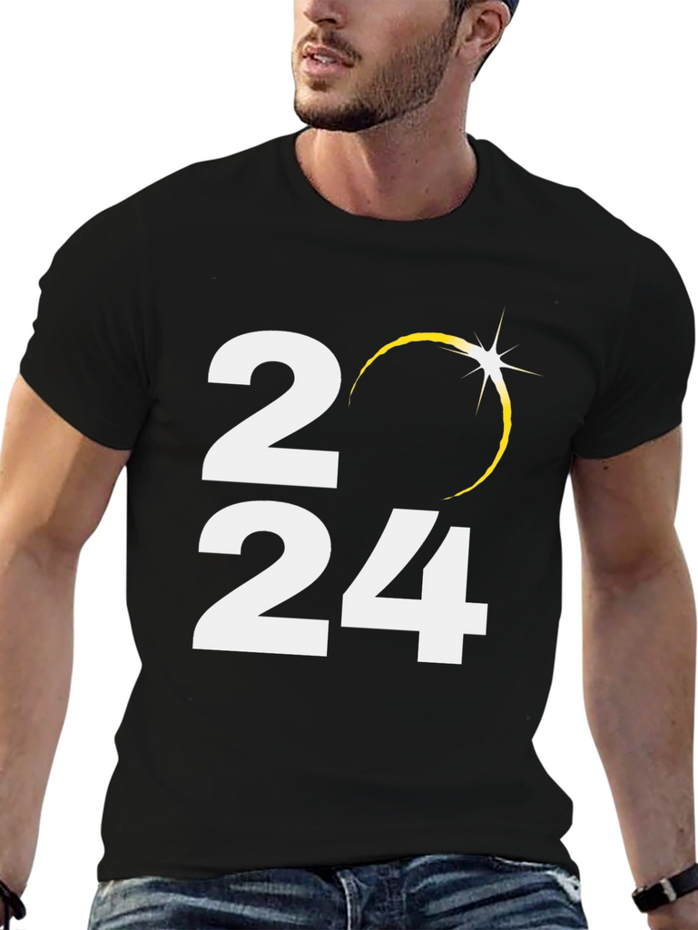 Commemorate the 2024 total solar eclipse with this unique t-shirt. The design prominently features "2024" in bold white font, with a stylized graphic of the eclipse replacing the zero. A radiant solar flare highlights the moment of totality. Made from a comfortable black fabric, this tee is perfect for eclipse chasers, astronomy enthusiasts, or anyone who wants to remember this spectacular celestial event. Wear it while viewing the eclipse, to astronomy club meetings, or as a conversation starter. A great way to show your love for space and science!