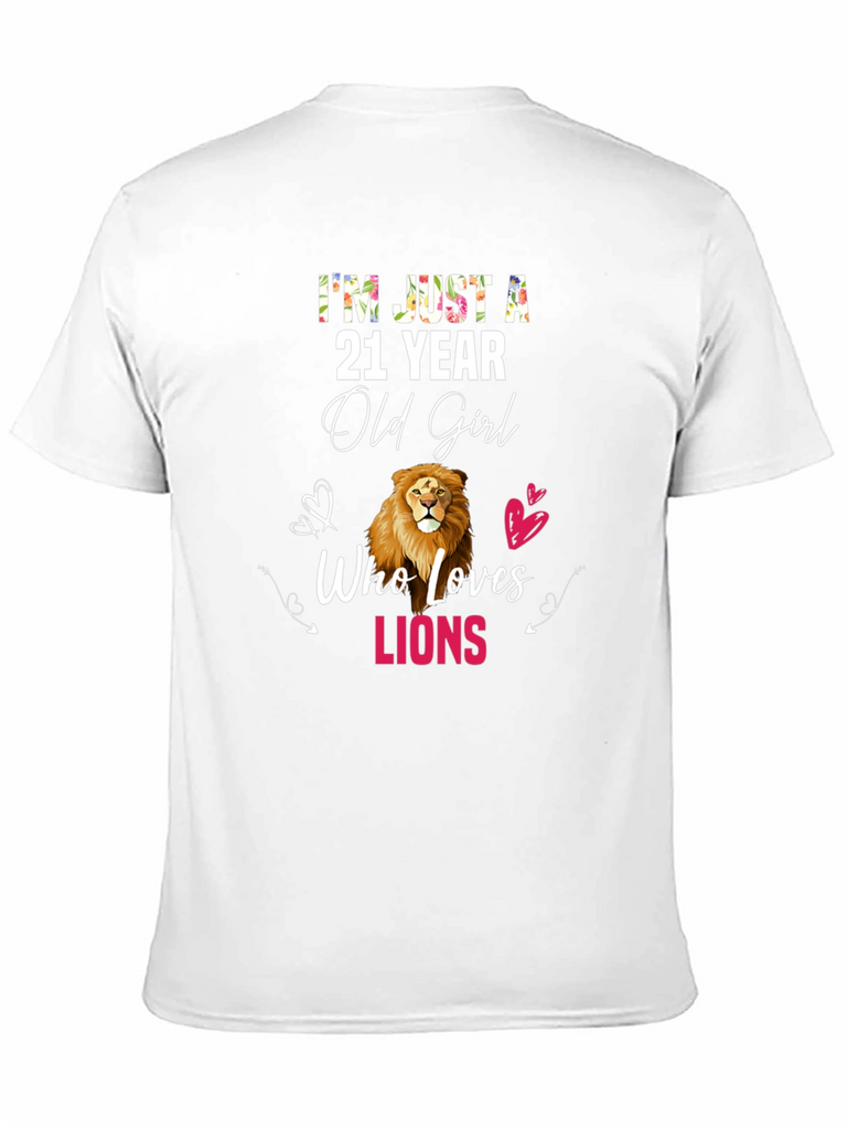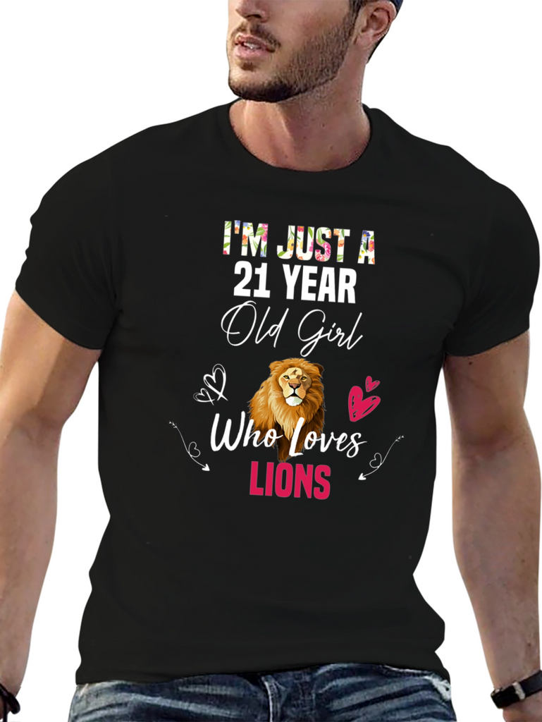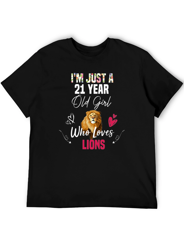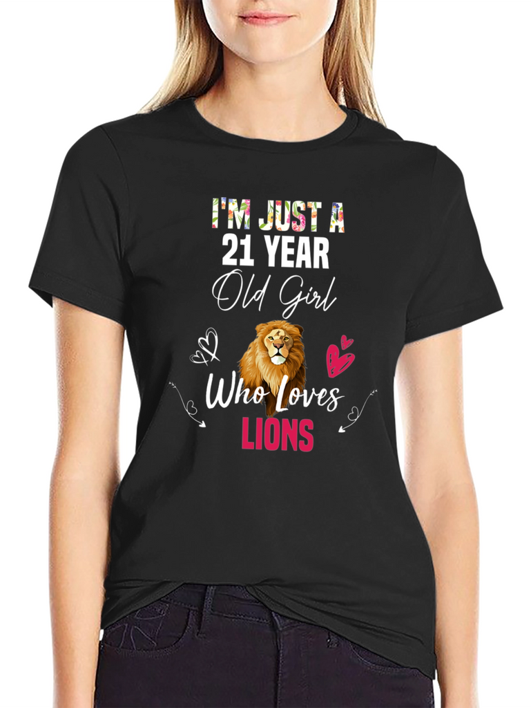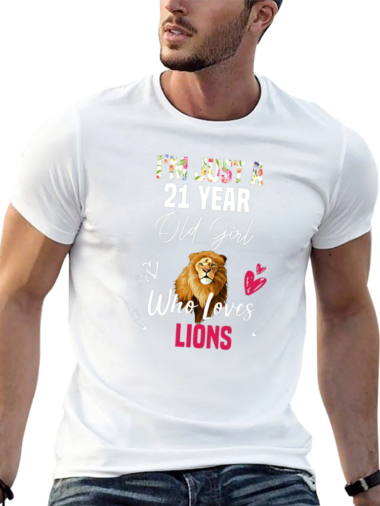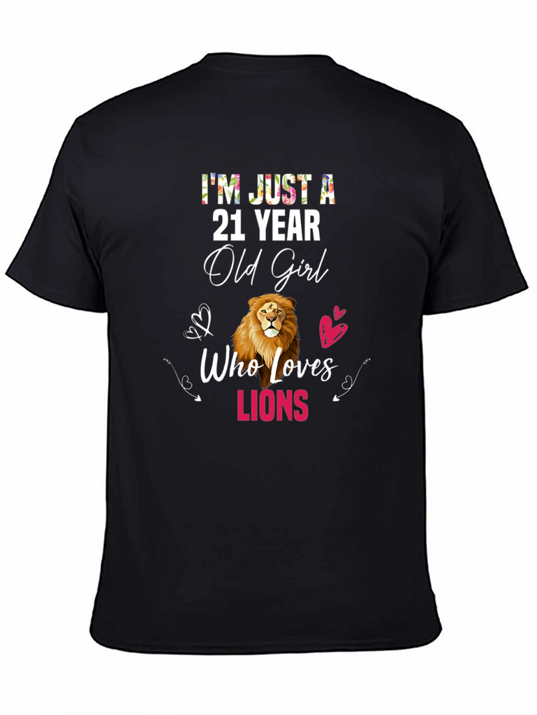 Express your love for lions with this charming t-shirt! The design features the phrase "I'm Just A 21 Year Old Girl Who Loves Lions" in a stylish font, adorned with floral accents and playful heart details. A majestic lion illustration sits at the center, adding a touch of wild elegance. Made from a comfortable, dark-colored fabric, this tee is perfect for casual wear, lion-themed events, or as a thoughtful gift for any 21-year-old lion enthusiast. Show off your unique style and passion with this eye-catching and comfortable t-shirt!