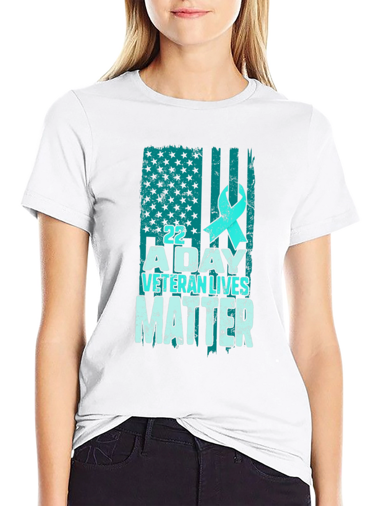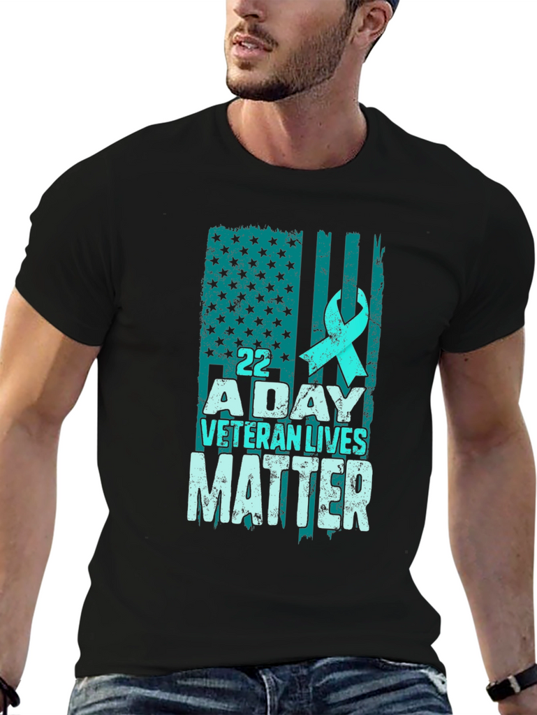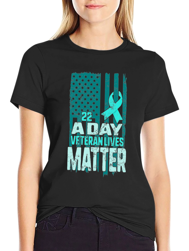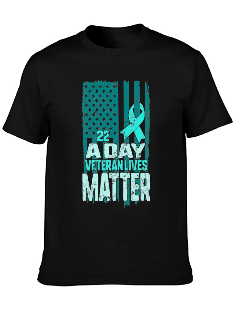 Show your support with this powerful graphic t-shirt. This black tee features a distressed-style print in teal and white, with an American flag motif behind a ribbon and the message "22 A DAY VETERAN LIVES MATTER". The cotton fabric offers a comfortable fit for everyday wear. Ideal for showing your patriotism, honoring veterans, and sparking conversations about mental health awareness. A meaningful addition to any casual wardrobe.
