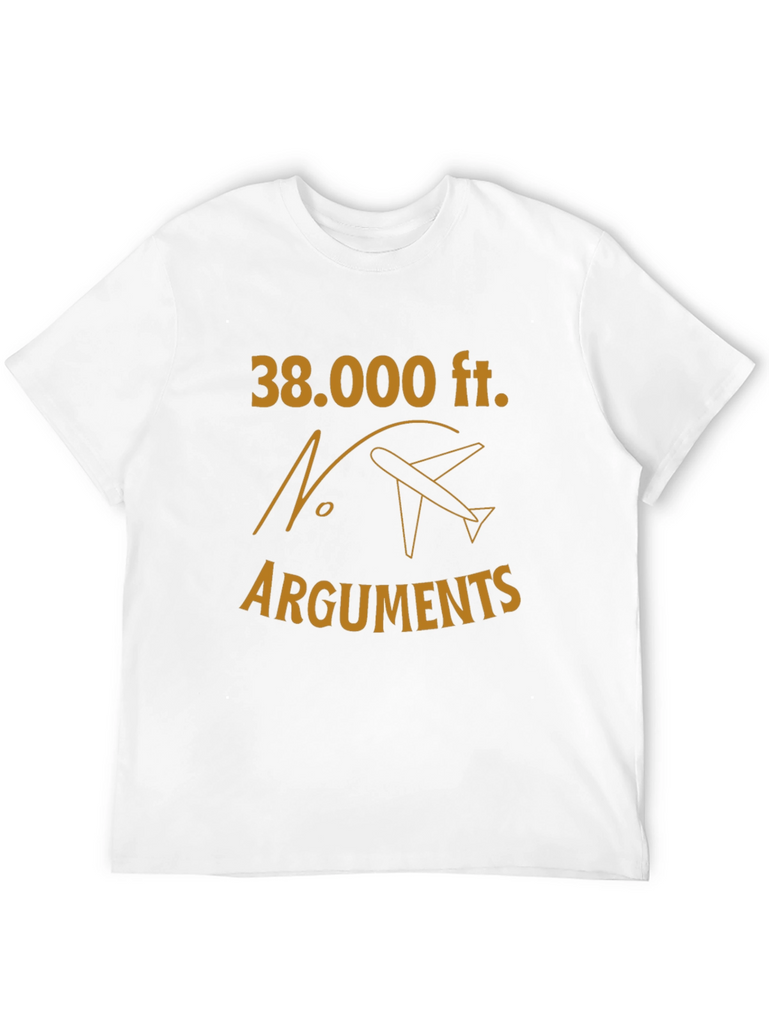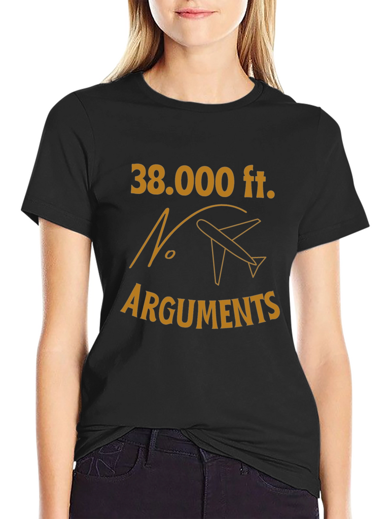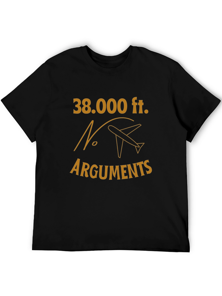 This stylish black t-shirt features a playful graphic design in a golden hue. The text "38.000 ft. No ARGUMENTS" is prominently displayed, accompanied by a line-art airplane design. This tee is perfect for aviation enthusiasts, pilots, or anyone with a love for travel. The classic fit and soft fabric make it comfortable for everyday wear. Show off your passion for flying with this eye-catching and unique t-shirt. Ideal for casual outings, travel adventures, or as a conversation starter among fellow aviation lovers.