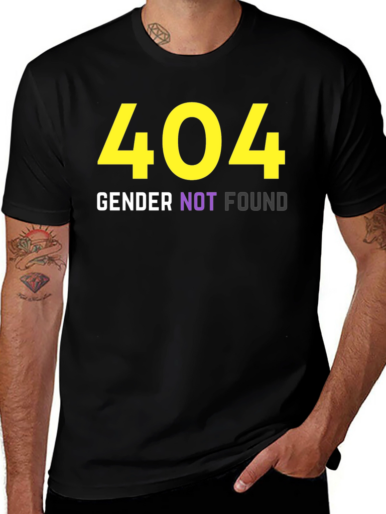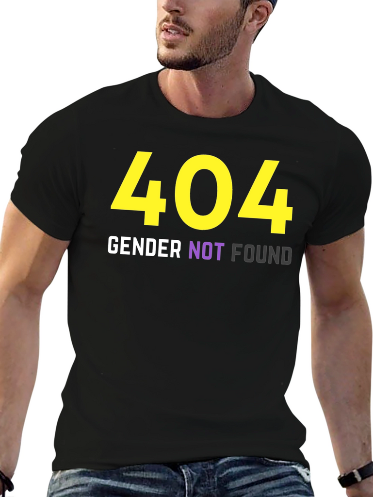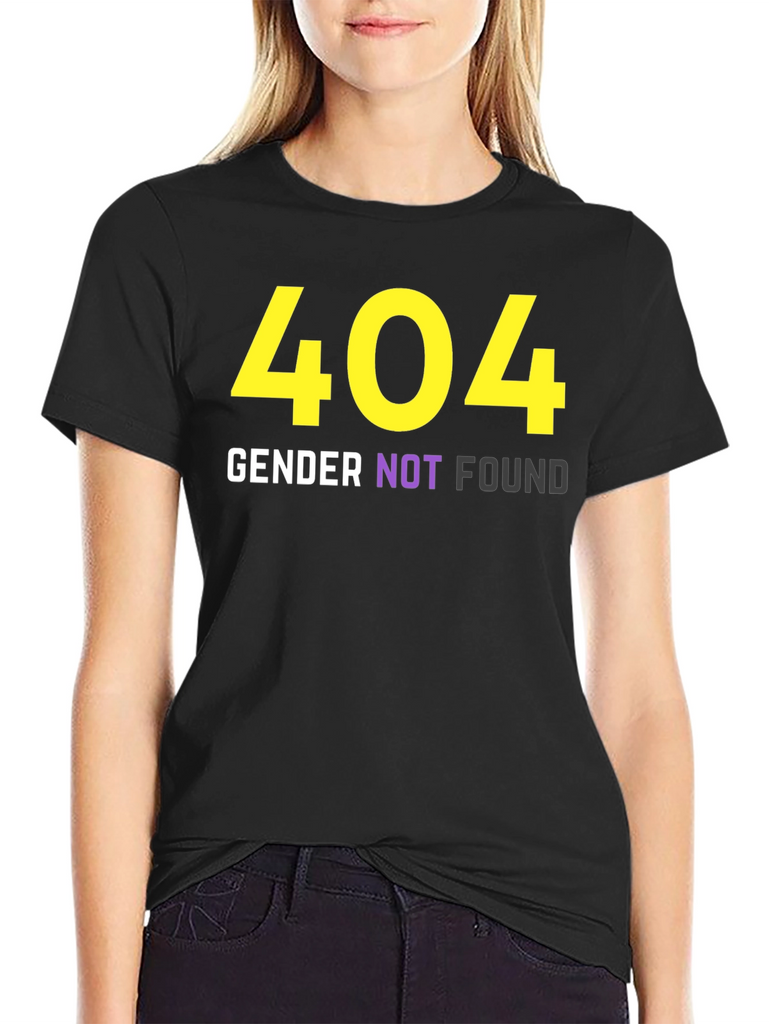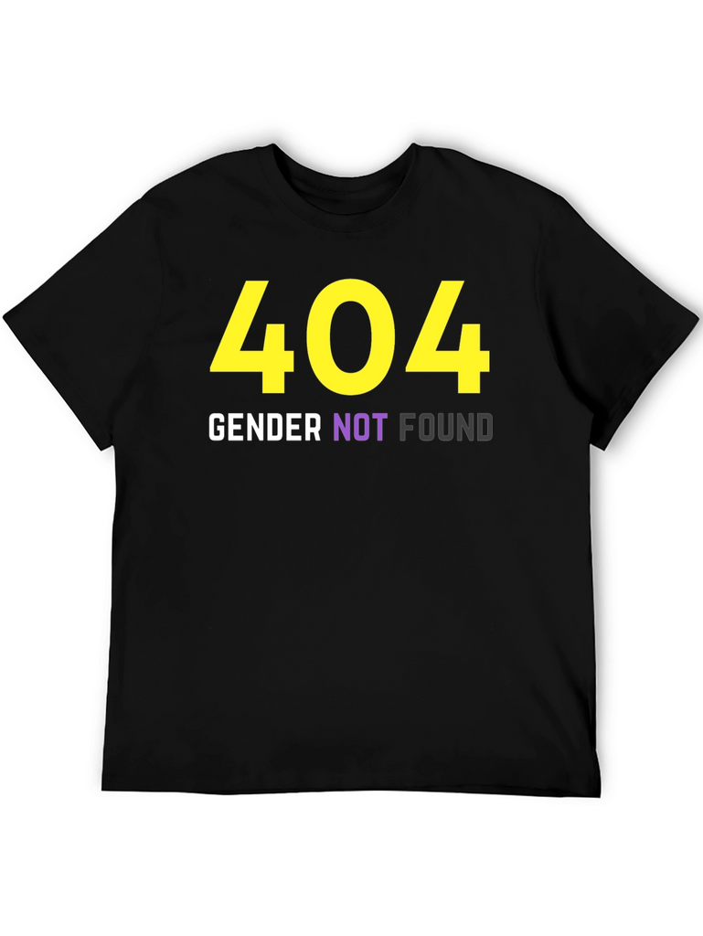 This black t-shirt makes a statement with its bold and playful design. Displayed prominently on the front are the numbers '404' in bright yellow, followed by the phrase 'GENDER NOT FOUND', with 'GENDER' in purple. This unique design adds a touch of humor. Made from comfortable fabric, it is perfect for everyday wear and casual occasions. Show off your unique sense of style with this eye-catching tee! It is sure to spark conversations and turn heads wherever you go.
