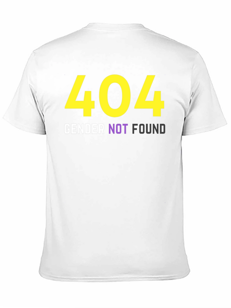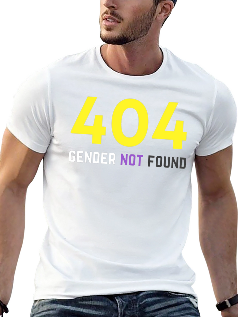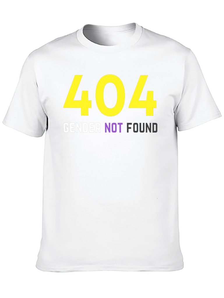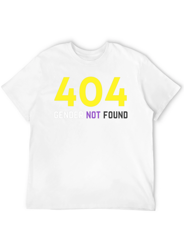 This black t-shirt makes a statement with its bold and playful design. Displayed prominently on the front are the numbers '404' in bright yellow, followed by the phrase 'GENDER NOT FOUND', with 'GENDER' in purple. This unique design adds a touch of humor. Made from comfortable fabric, it is perfect for everyday wear and casual occasions. Show off your unique sense of style with this eye-catching tee! It is sure to spark conversations and turn heads wherever you go.