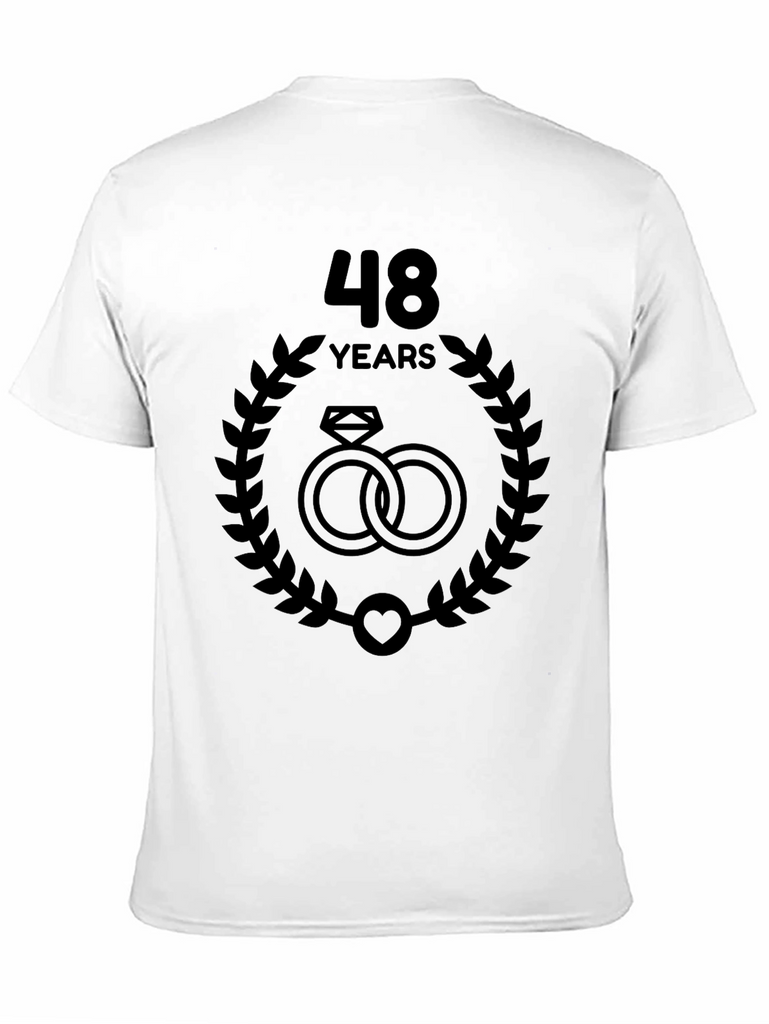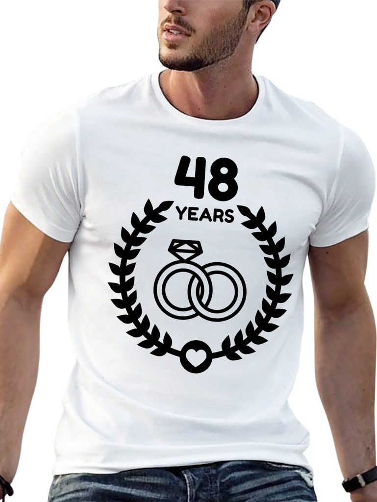 Celebrate 48 years of love with this commemorative anniversary t-shirt. The design features the number '48' above the word 'YEARS', centered above a wreath with intertwined rings and heart at the bottom. Perfect for couples celebrating this landmark, or as a thoughtful gift for their loved ones. Wear this shirt with pride to your anniversary celebration or on any special occasion to commemorate your lasting bond.