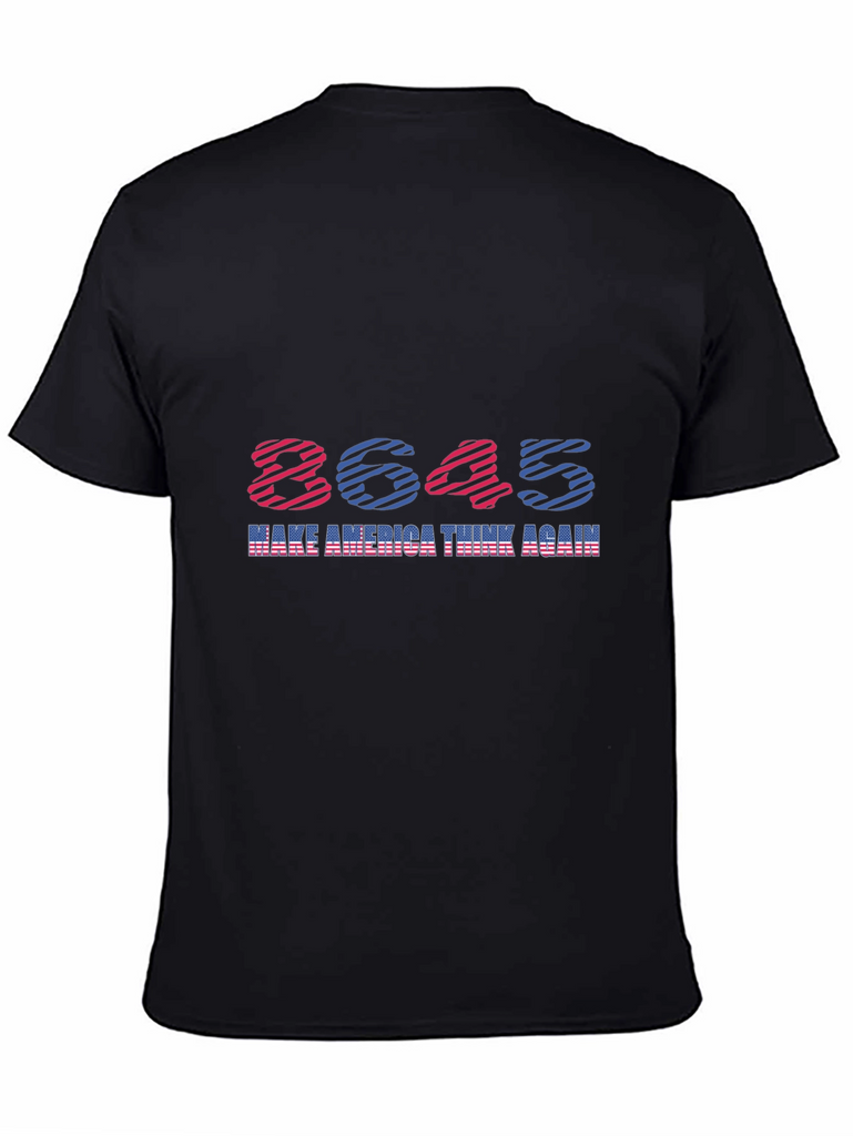 Express your political views with this statement T-shirt. The design features the number '8645' along with the phrase 'Make America Think Again,' creating a bold and eye-catching graphic. The striped pattern adds a unique element. Made from comfortable material, it's perfect for rallies, casual wear, or everyday expression. Show your support and start conversations with this unique tee!