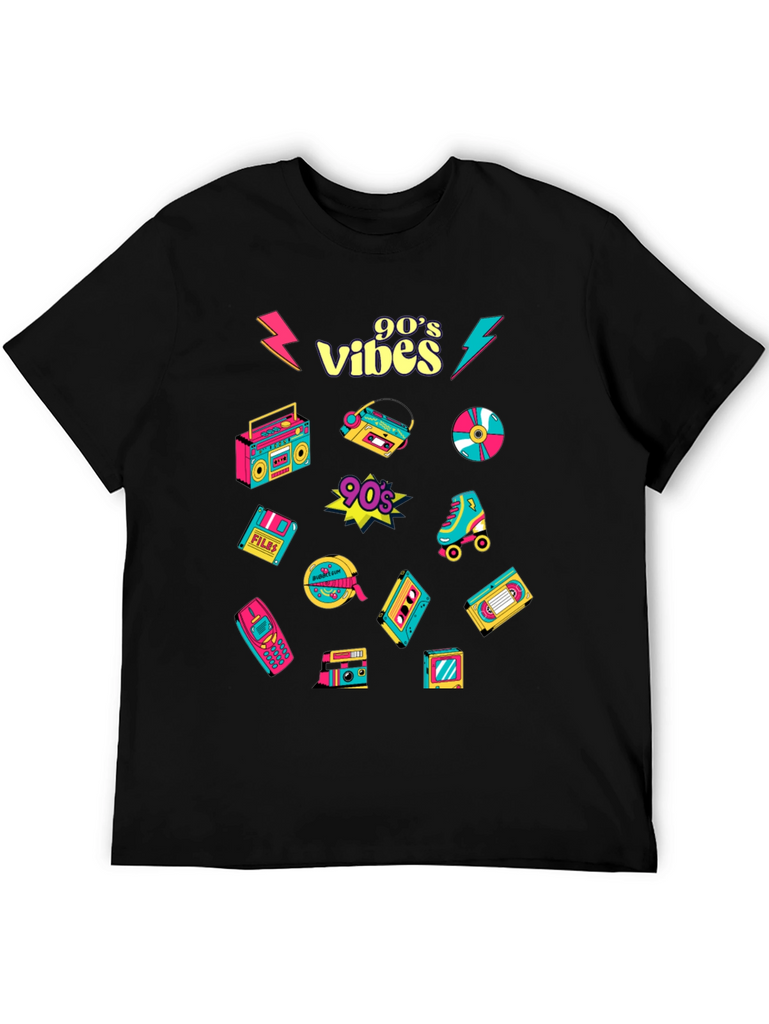 Rock a retro vibe with this black t-shirt featuring a fun 90's themed design. This tee is covered in vibrant and colorful graphics of 90's icons like cassette tapes, boomboxes, roller skates, and other throwback essentials. Made from comfortable, breathable fabric, this shirt is perfect for everyday wear. Whether you're heading to a casual hangout, reliving your childhood memories, or just want to make a bold fashion statement, this 90's vibes t-shirt is sure to turn heads and spark conversations. Show off your love for the good old days and add a touch of nostalgia to your wardrobe!