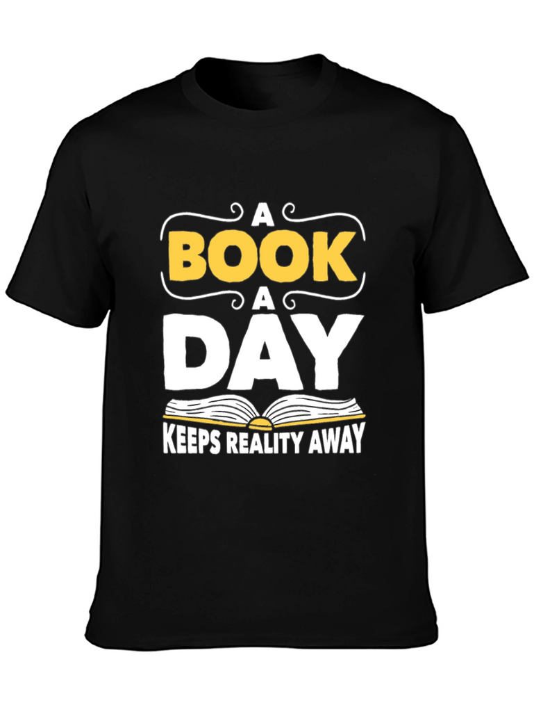 Embrace your love for reading with this eye-catching black T-shirt featuring the fun slogan "A Book A Day Keeps Reality Away". The design incorporates a stylish font, with "BOOK" in yellow and "DAY" in white, complemented by a charming open book graphic. Made from a comfortable, breathable fabric, this tee is perfect for casual wear, library visits, or book club meetings. Show off your passion for literature and spark conversations with fellow bookworms. Get yours today and celebrate the joy of reading!