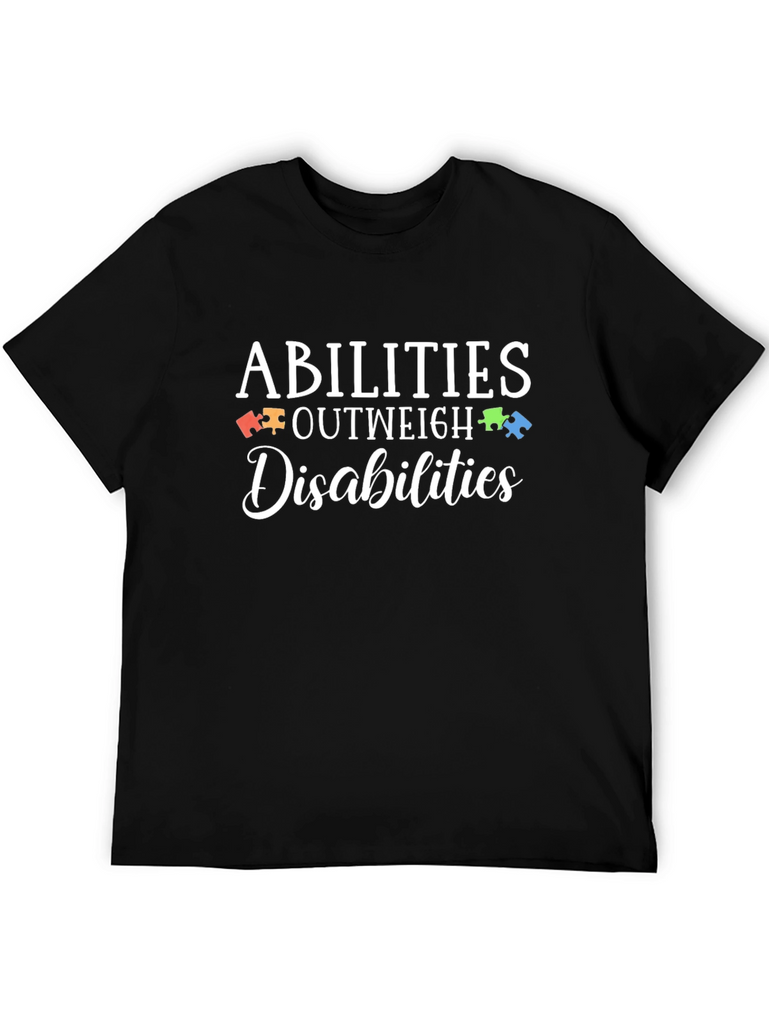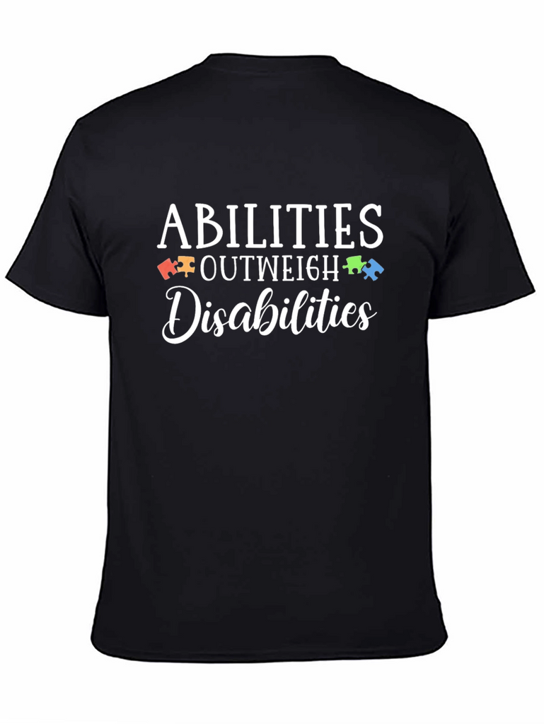 Show your support with this black t-shirt featuring the uplifting message "Abilities Outweigh Disabilities." The design incorporates colorful puzzle pieces, symbolizing autism awareness and acceptance. This comfortable tee is perfect for everyday wear, autism awareness events, or simply spreading a positive message. The design is prominently displayed on the front of the shirt, making it a statement piece. Wear it proudly to show your support and promote understanding. A perfect way to display your advocacy and promote a message of positivity and acceptance!