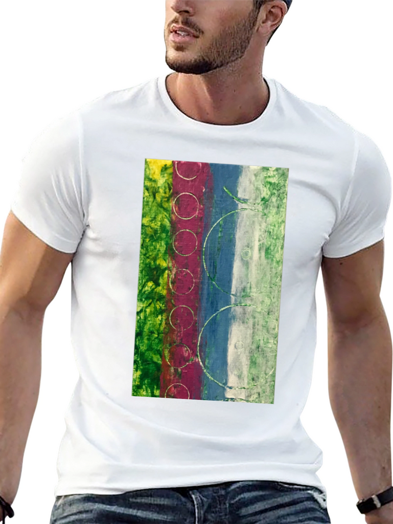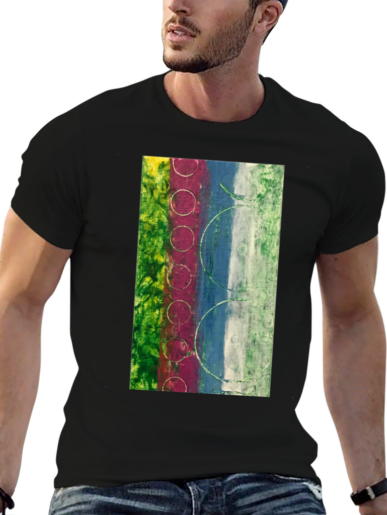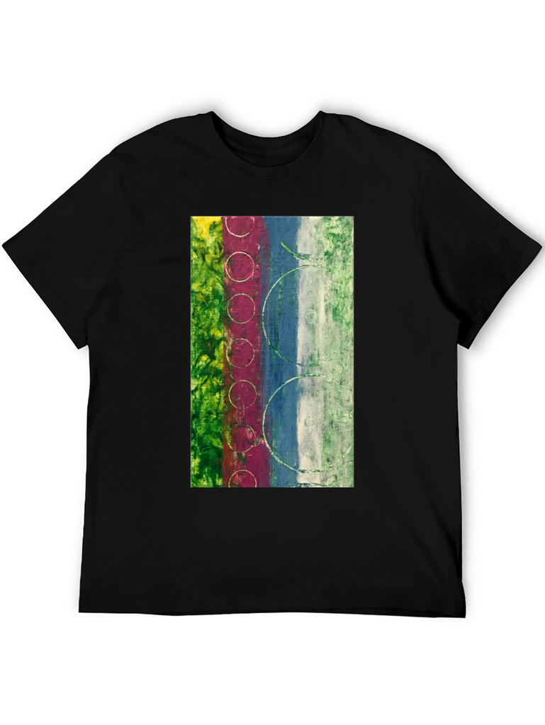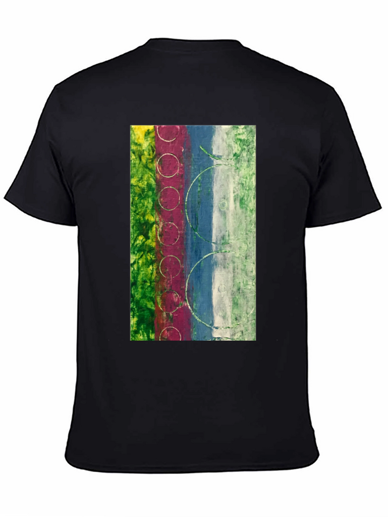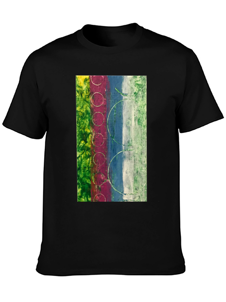 This stylish black t-shirt features a unique, vibrant abstract art print. The design incorporates bold stripes of yellow, green, red, and blue, accented with circular patterns, creating a visually striking and modern look. Crafted from a soft, comfortable fabric, this tee offers a relaxed fit perfect for everyday wear. Whether you're making a statement at a casual gathering or adding an artistic touch to your daily style, this abstract print t-shirt is sure to turn heads and spark conversation. Pair it with jeans, shorts, or chinos for a versatile and fashionable ensemble. Its distinctive design makes it a standout piece in any wardrobe.