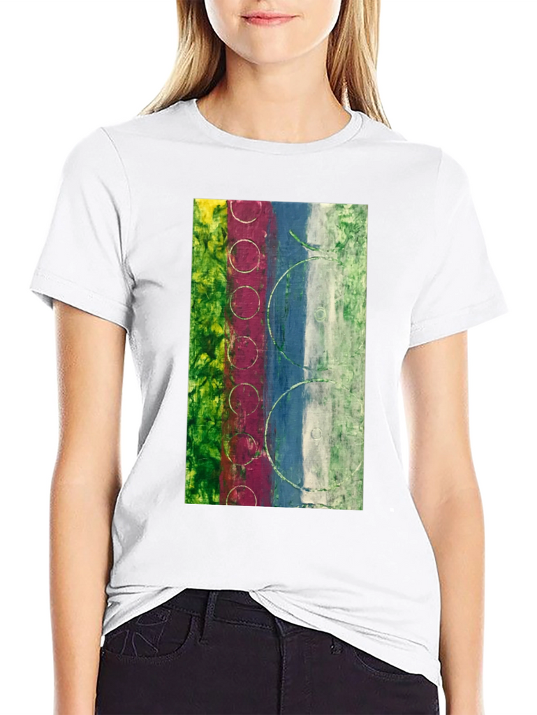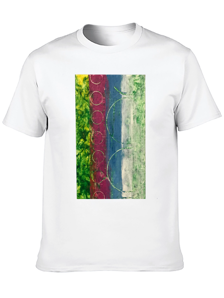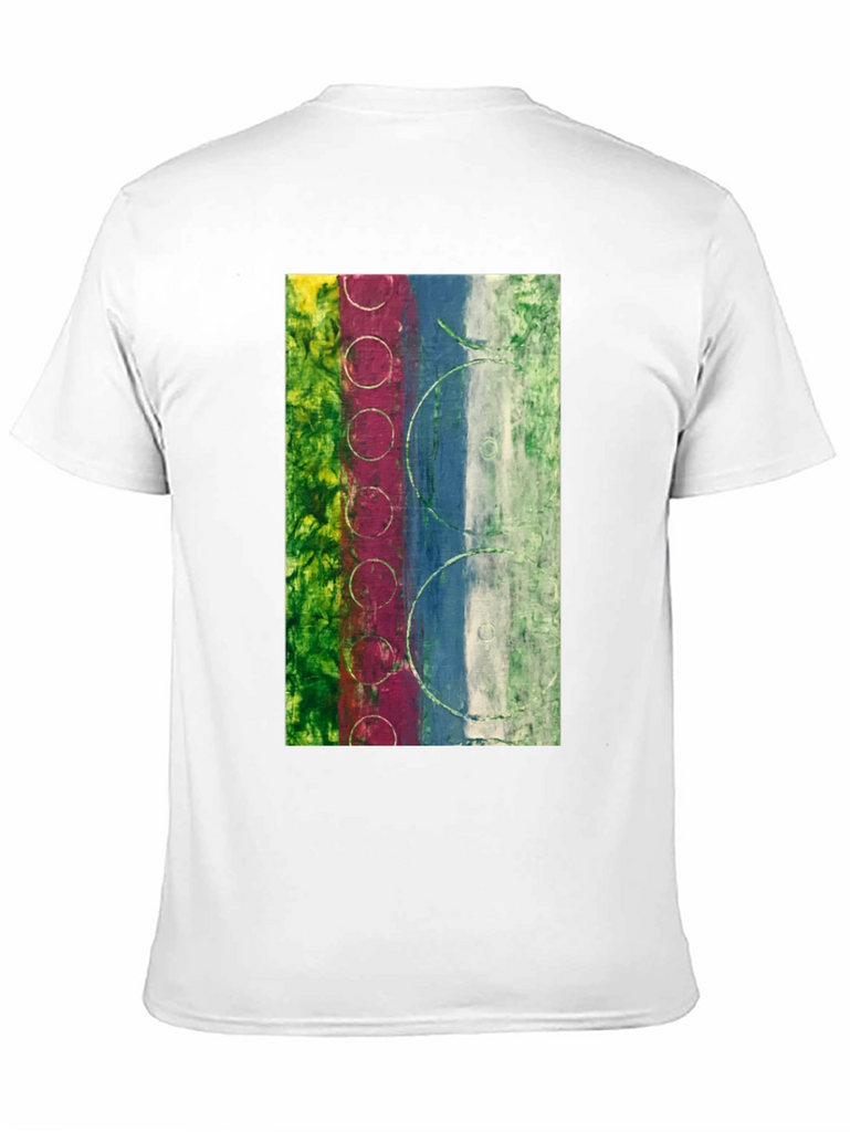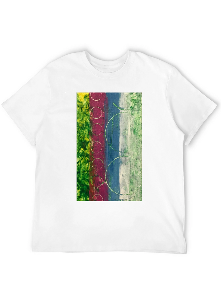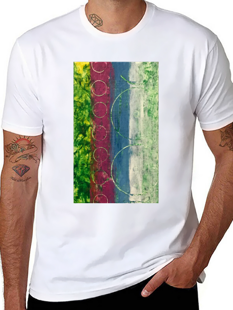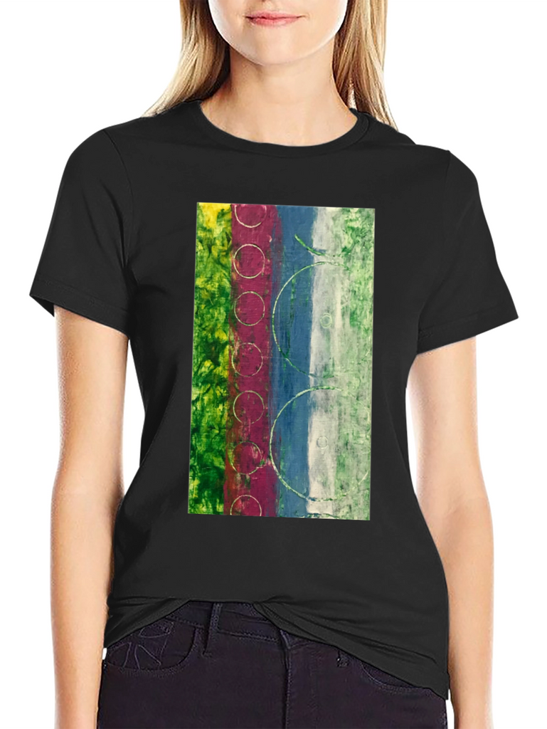 This stylish black t-shirt features a unique, vibrant abstract art print. The design incorporates bold stripes of yellow, green, red, and blue, accented with circular patterns, creating a visually striking and modern look. Crafted from a soft, comfortable fabric, this tee offers a relaxed fit perfect for everyday wear. Whether you're making a statement at a casual gathering or adding an artistic touch to your daily style, this abstract print t-shirt is sure to turn heads and spark conversation. Pair it with jeans, shorts, or chinos for a versatile and fashionable ensemble. Its distinctive design makes it a standout piece in any wardrobe.