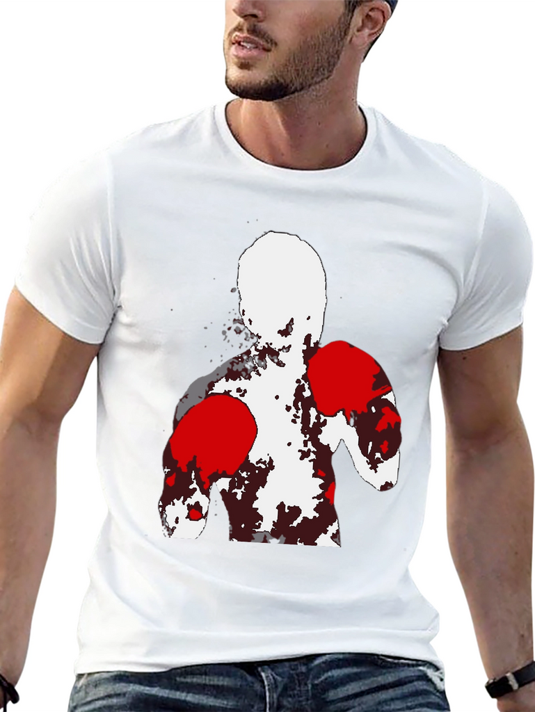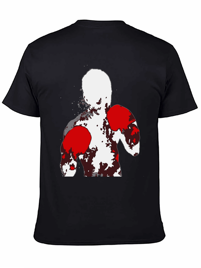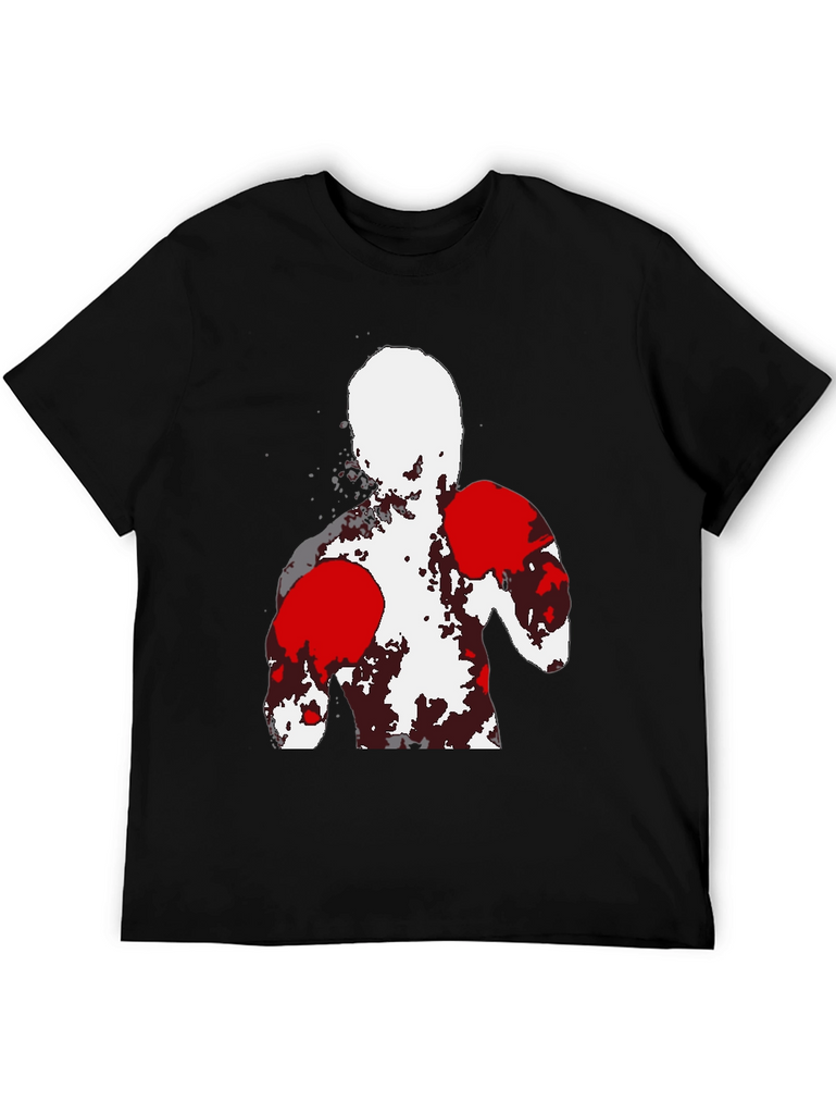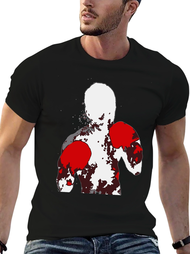 Strike a stylish pose with this unique graphic t-shirt! Featuring an abstract design of a boxer, complete with red boxing gloves, this black tee makes a bold statement. The graphic is a mix of white, red, and dark tones to create a striking visual impact. Crafted from a comfortable-looking fabric, this shirt is perfect for casual wear, workouts, or making a statement wherever you go. Show off your passion for sports or your appreciation for unique art with this must-have tee.