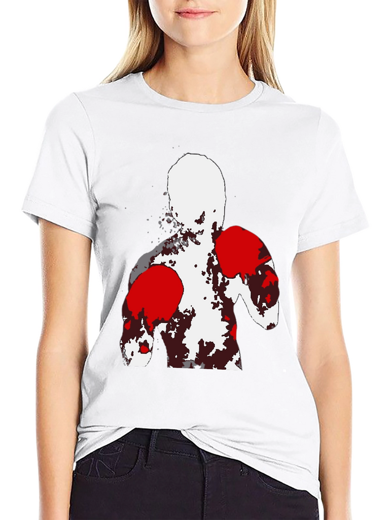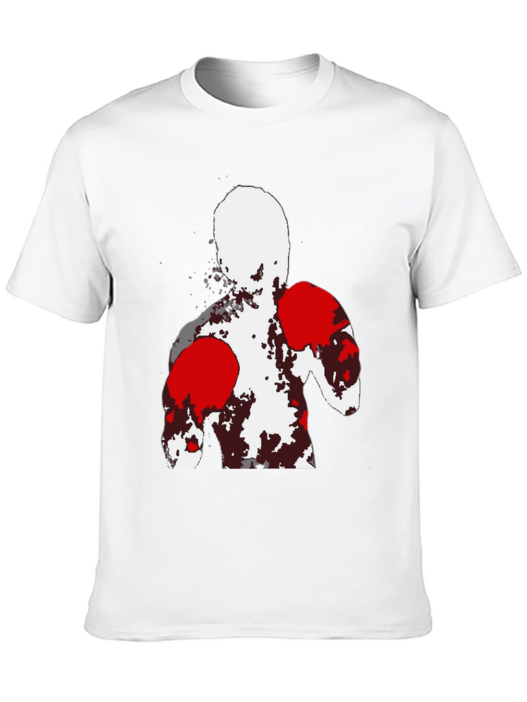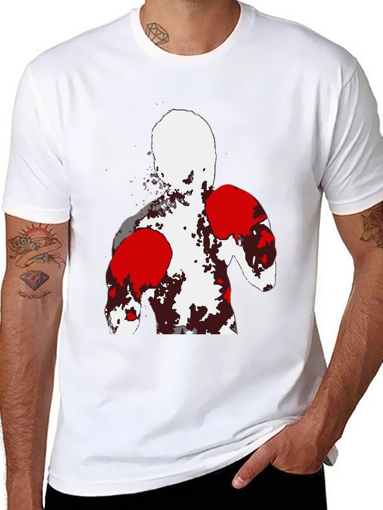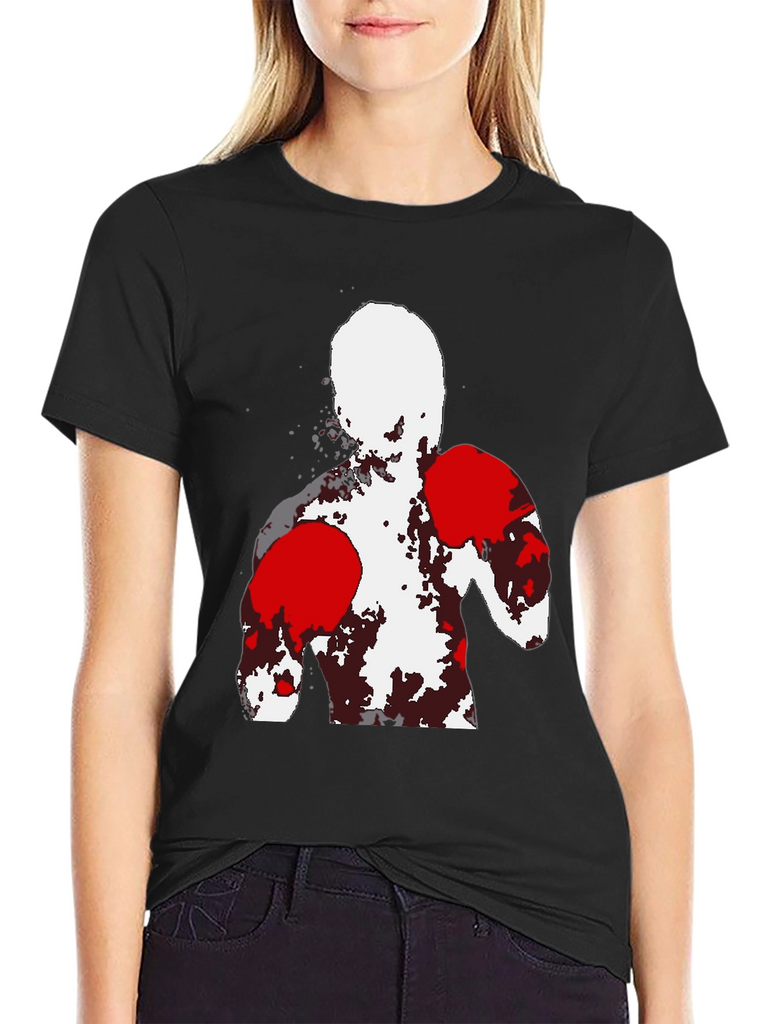 Strike a stylish pose with this unique graphic t-shirt! Featuring an abstract design of a boxer, complete with red boxing gloves, this black tee makes a bold statement. The graphic is a mix of white, red, and dark tones to create a striking visual impact. Crafted from a comfortable-looking fabric, this shirt is perfect for casual wear, workouts, or making a statement wherever you go. Show off your passion for sports or your appreciation for unique art with this must-have tee.