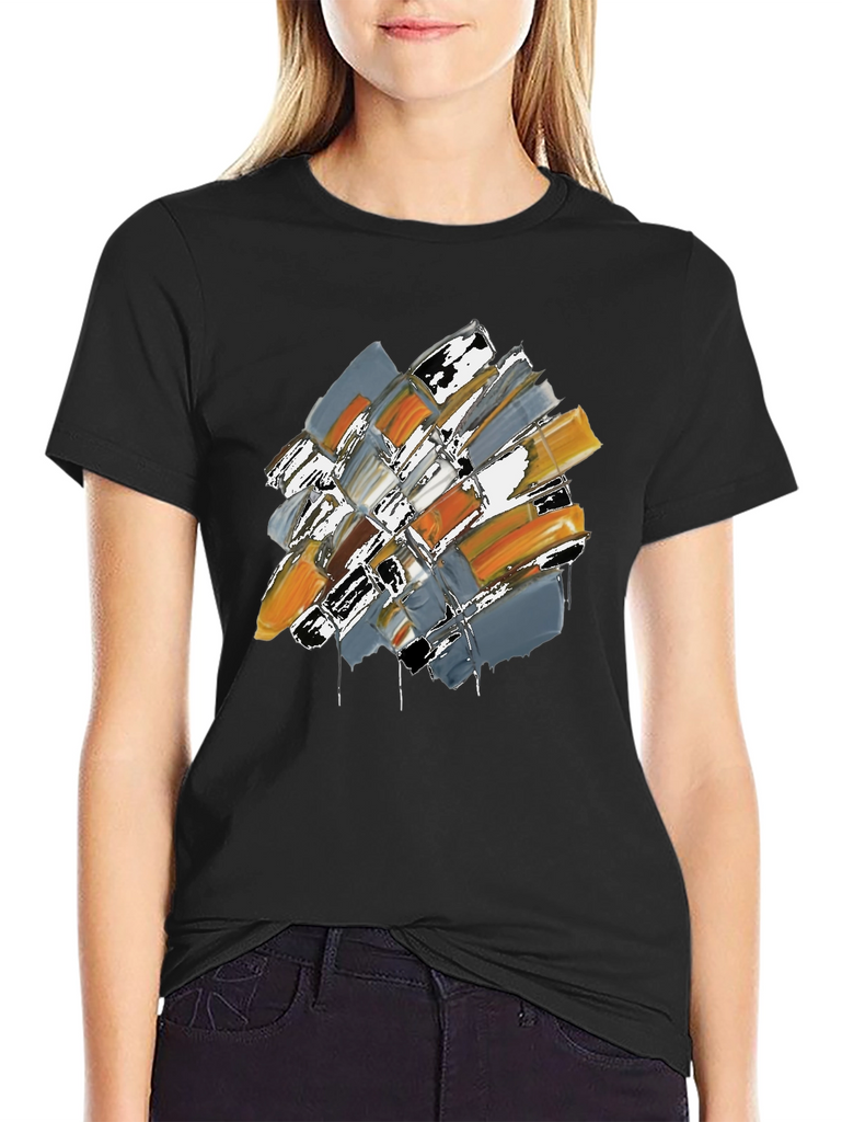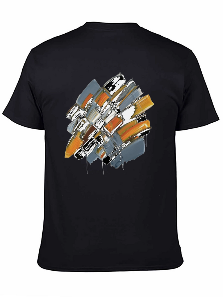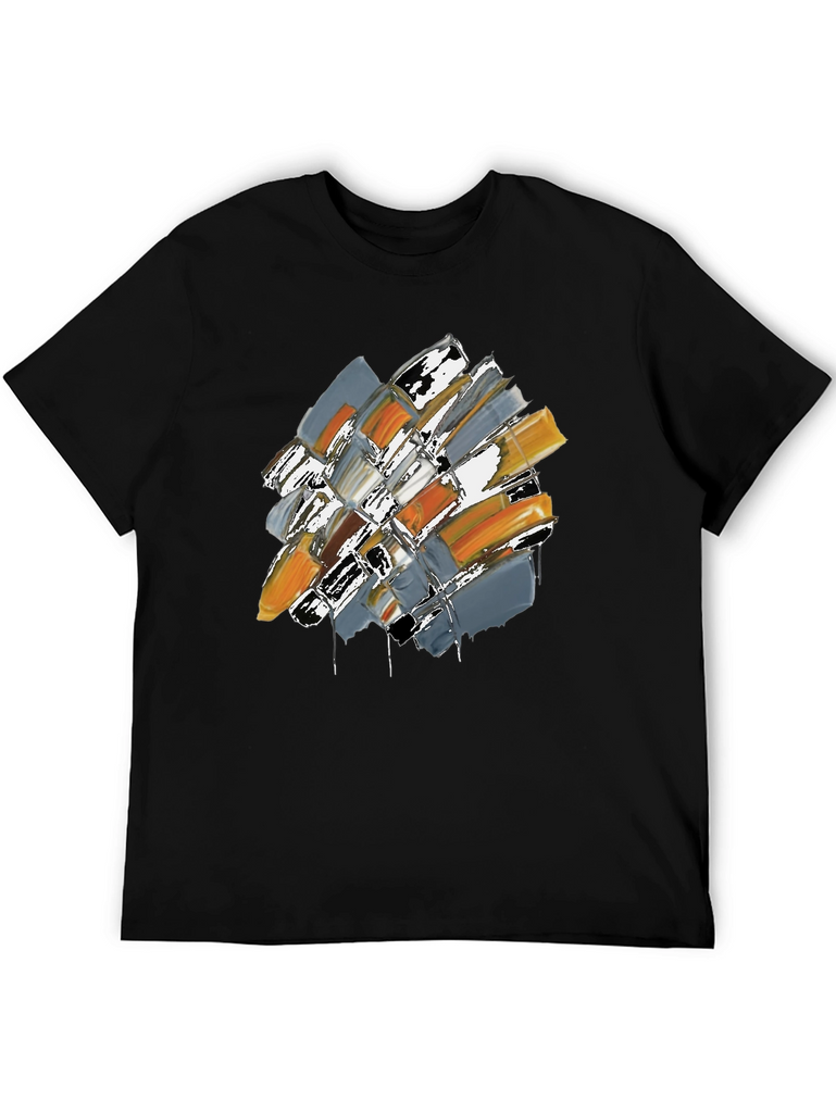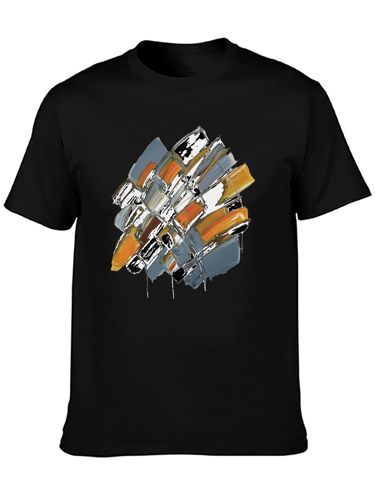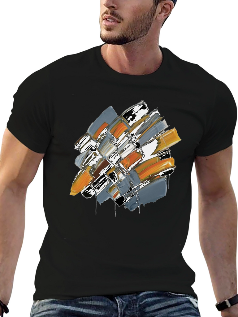 Make a statement with this stylish black t-shirt featuring a unique abstract graphic. The design is composed of layered brushstrokes in a variety of colors including white, gray, orange, and brown, creating a visually striking effect. Made from comfortable fabric, this tee is perfect for casual wear. The modern design and eye-catching graphic ensure you'll stand out in any crowd. Ideal for everyday wear, concerts, or artistic events, this t-shirt blends comfort with contemporary style. A must-have addition to any fashion-forward wardrobe.