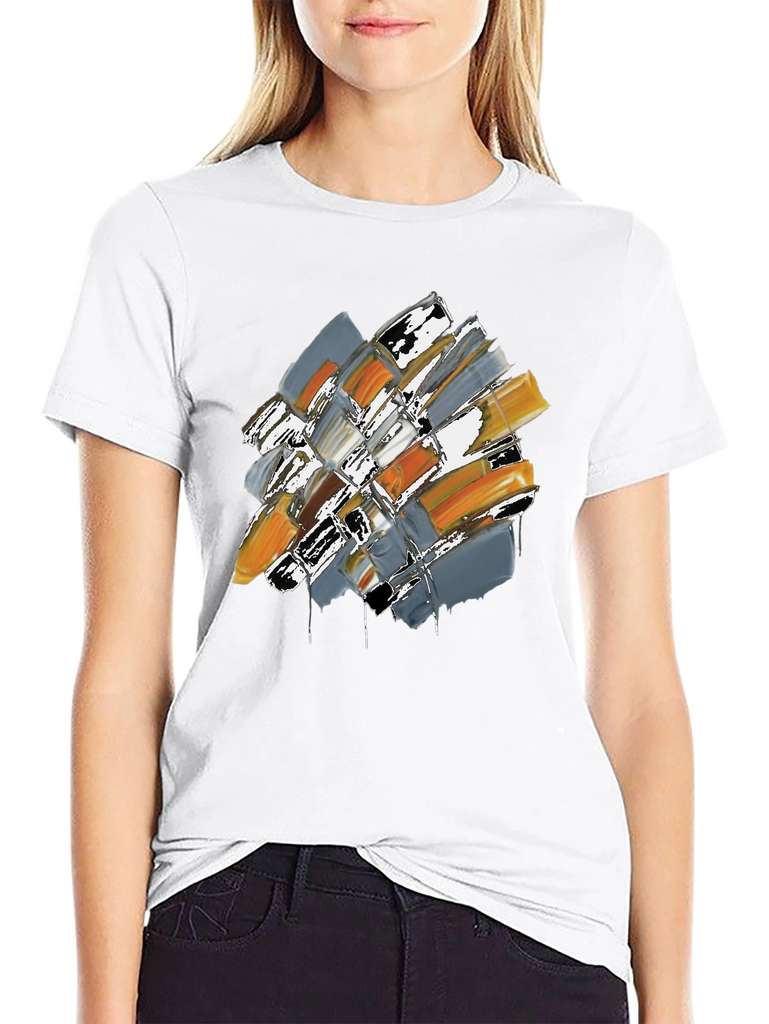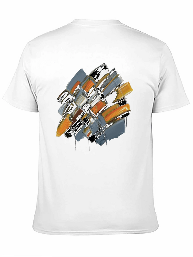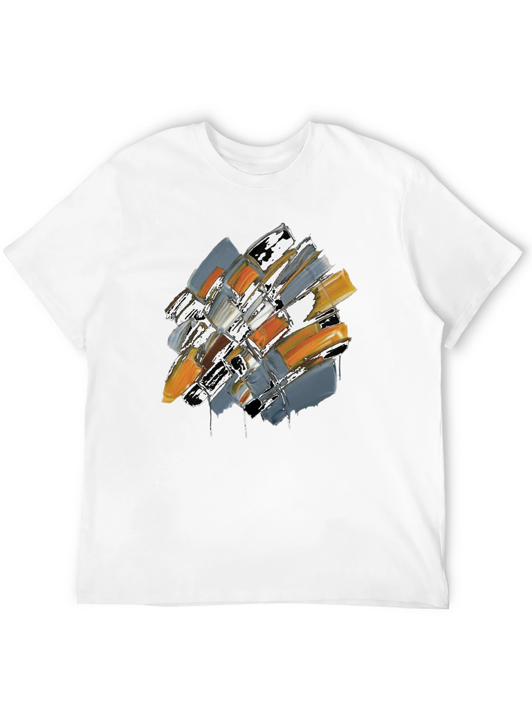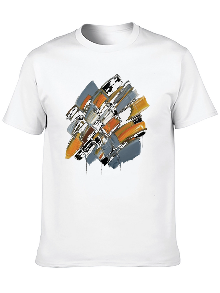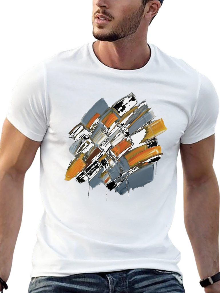Make a statement with this stylish black t-shirt featuring a unique abstract graphic. The design is composed of layered brushstrokes in a variety of colors including white, gray, orange, and brown, creating a visually striking effect. Made from comfortable fabric, this tee is perfect for casual wear. The modern design and eye-catching graphic ensure you'll stand out in any crowd. Ideal for everyday wear, concerts, or artistic events, this t-shirt blends comfort with contemporary style. A must-have addition to any fashion-forward wardrobe.