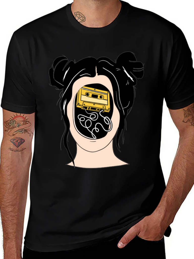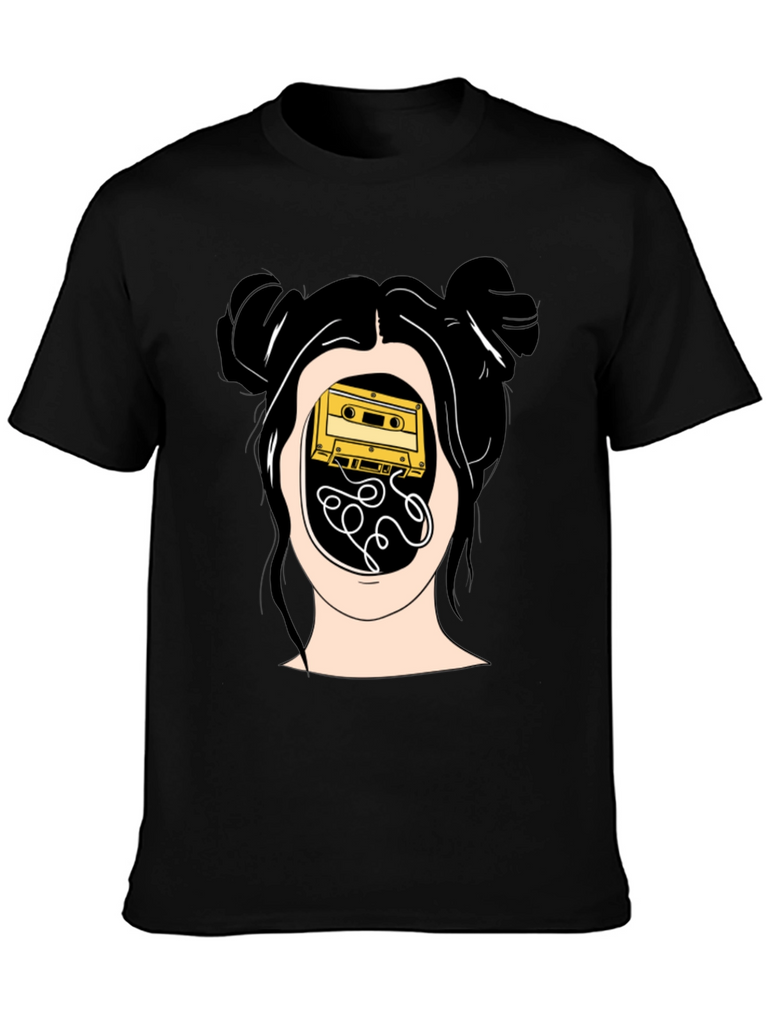 Show off your love for music with this unique graphic tee. This black t-shirt features an abstract design of a woman's face with a cassette tape and tangled tape replacing her facial features. The bold design is sure to turn heads and spark conversations. Made from a comfortable cotton blend, this t-shirt is perfect for everyday wear. It's a great choice for casual outings, concerts, or just lounging around the house. Express your individuality and passion for music with this eye-catching tee.