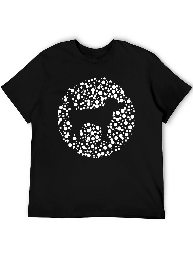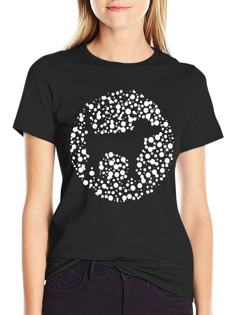 Show off your modern style with this eye-catching black t-shirt! The shirt features a unique, abstract dog design formed from a collection of white dots arranged in a circular shape. This soft, comfortable tee is perfect for casual wear, whether you're heading to the park, running errands, or just relaxing at home. The clean black color provides a versatile backdrop for the playful graphic, making it easy to pair with jeans, shorts, or your favorite casual bottoms. A stylish and comfortable addition to any wardrobe!