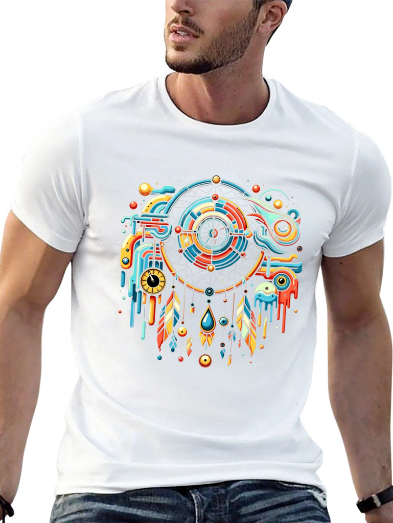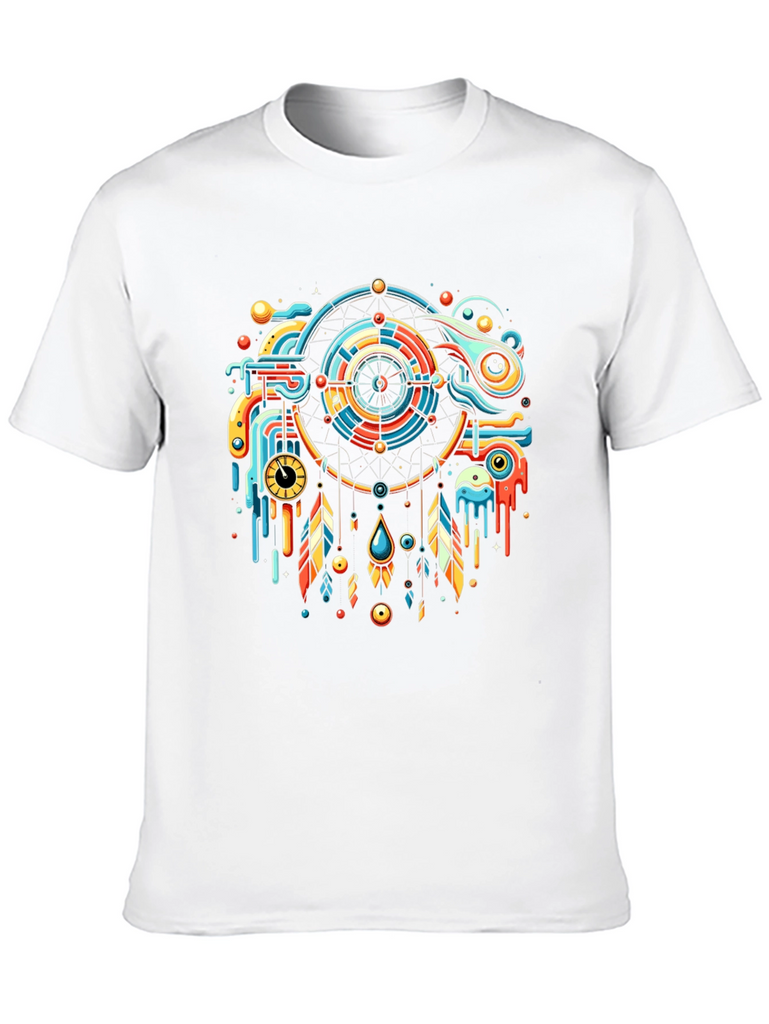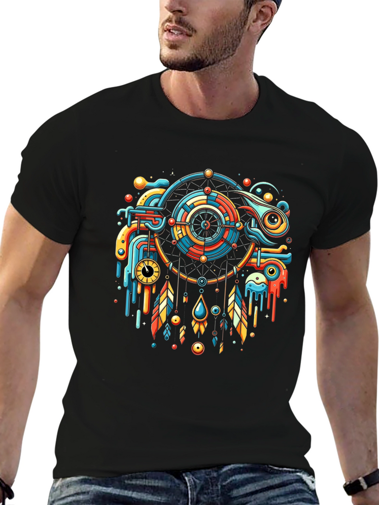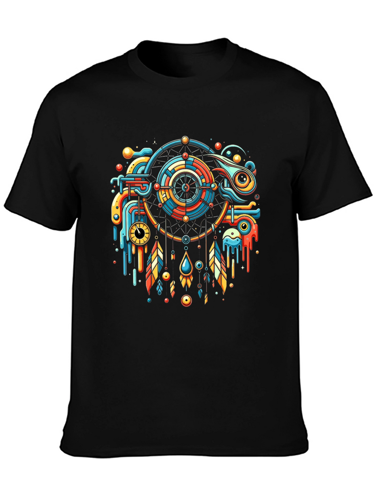 Show off your unique style with this eye-catching t-shirt featuring an abstract dream catcher design. The intricate graphic is rendered in bold, vibrant colors with sharp lines, creating a striking visual effect. Made from a comfortable, breathable fabric, this tee is perfect for casual wear. The elaborate dream catcher illustration includes geometric patterns, colorful feathers and droplets, making it a standout piece in any wardrobe. Wear it to express your artistic flair or as a conversation starter. Elevate your everyday look with this distinctive and stylish tee. It's a must-have for anyone who appreciates contemporary art and distinctive fashion.
