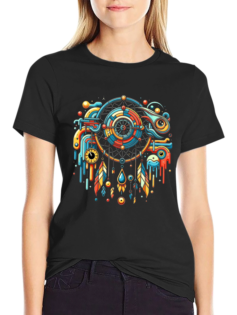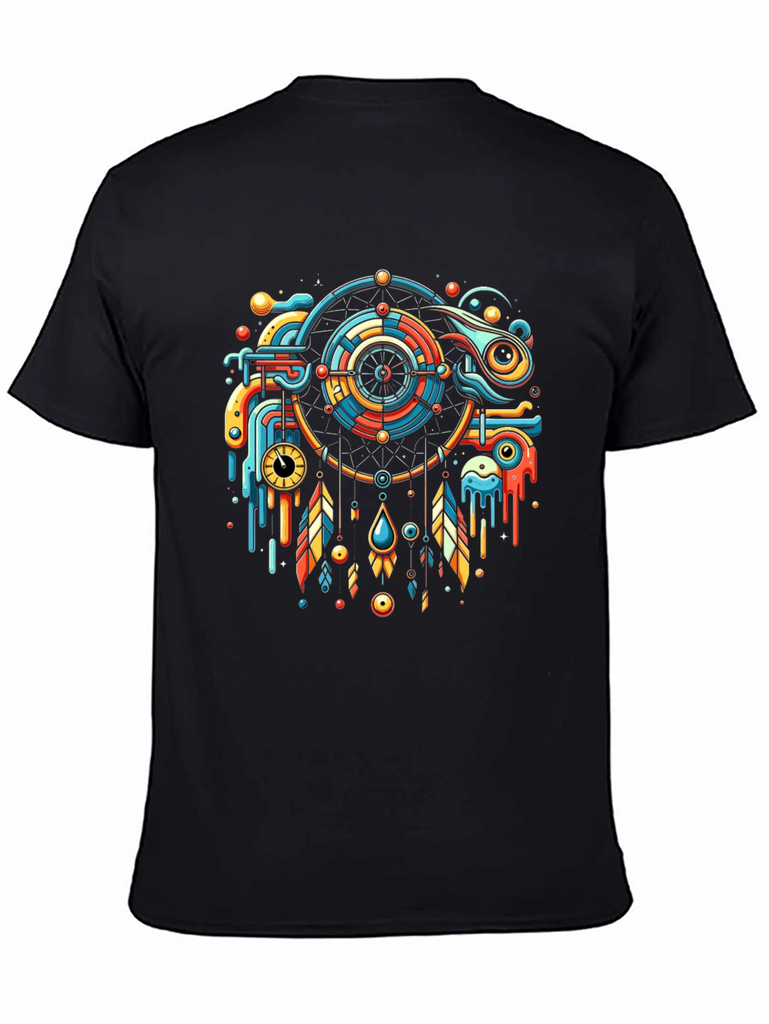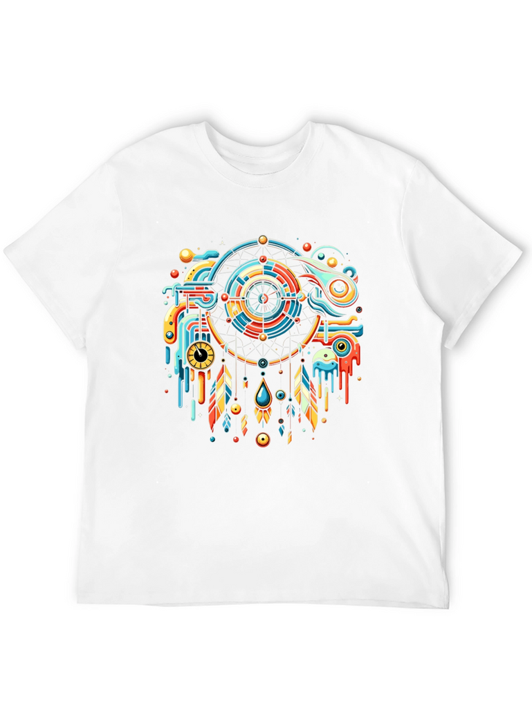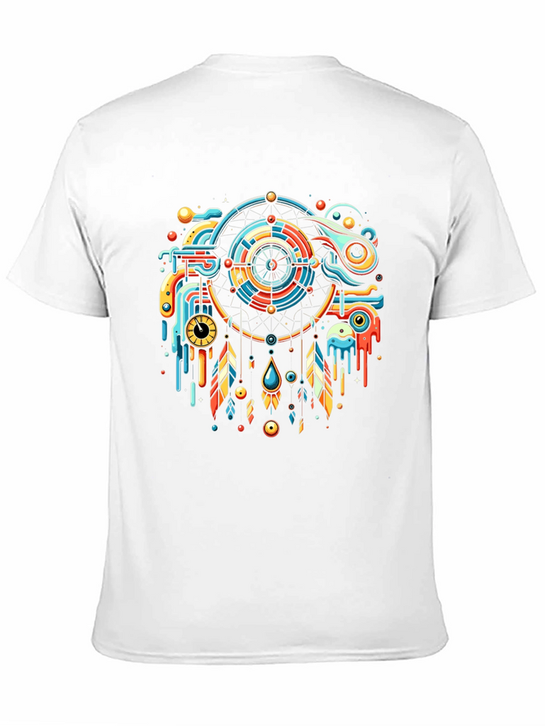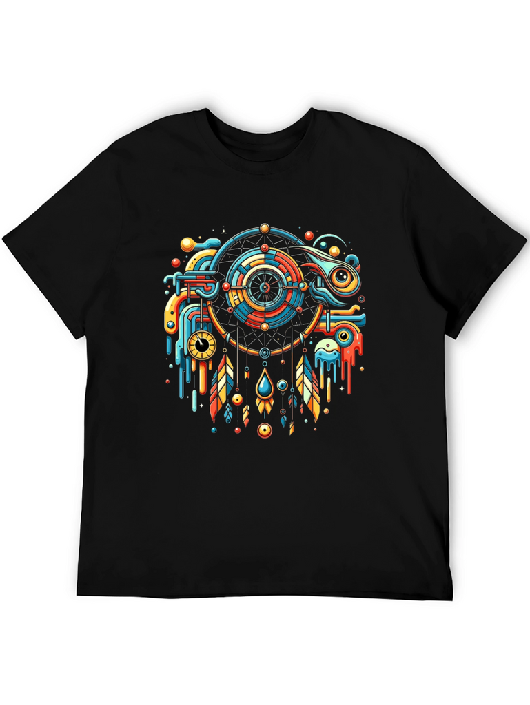 Show off your unique style with this eye-catching t-shirt featuring an abstract dream catcher design. The intricate graphic is rendered in bold, vibrant colors with sharp lines, creating a striking visual effect. Made from a comfortable, breathable fabric, this tee is perfect for casual wear. The elaborate dream catcher illustration includes geometric patterns, colorful feathers and droplets, making it a standout piece in any wardrobe. Wear it to express your artistic flair or as a conversation starter. Elevate your everyday look with this distinctive and stylish tee. It's a must-have for anyone who appreciates contemporary art and distinctive fashion.