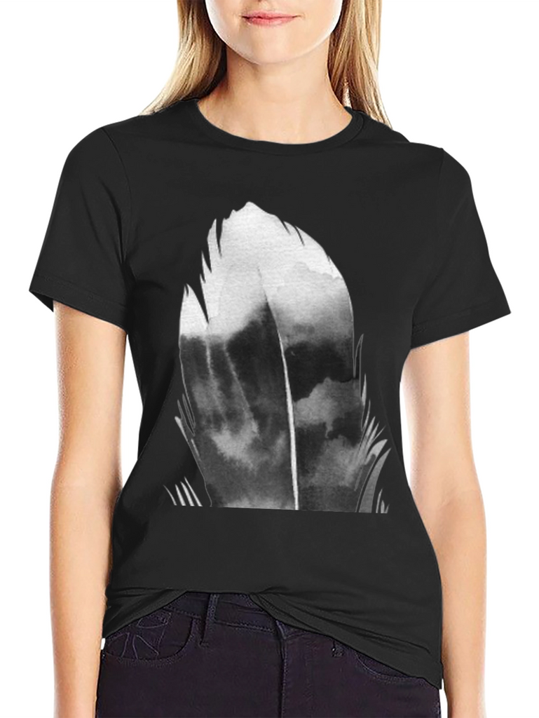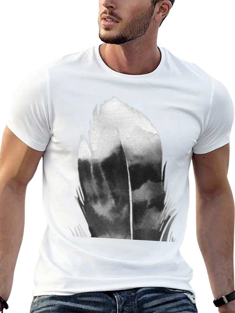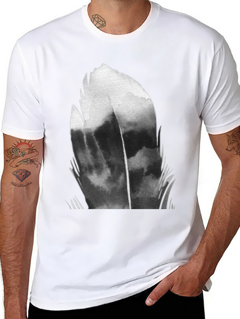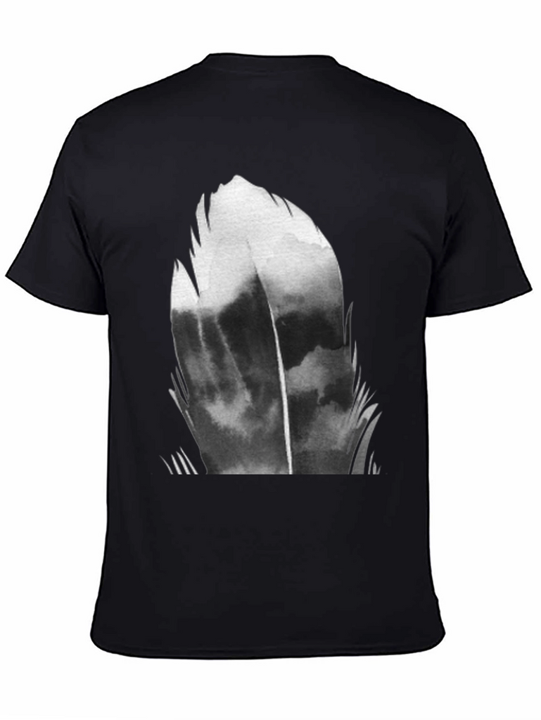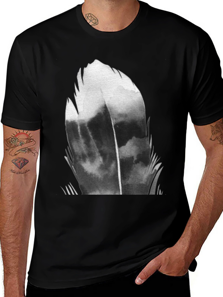 Make a statement with this eye-catching black t-shirt featuring a bold, abstract feather graphic. The design is rendered in shades of gray and black, creating a dramatic and modern look. Made from a soft, breathable fabric, this tee is perfect for everyday wear. The classic crew neck and short sleeve design ensures a comfortable fit. Dress it up with dark jeans or keep it casual with shorts – this versatile tee is sure to become a wardrobe staple. Showcase your unique style with this striking abstract tee.