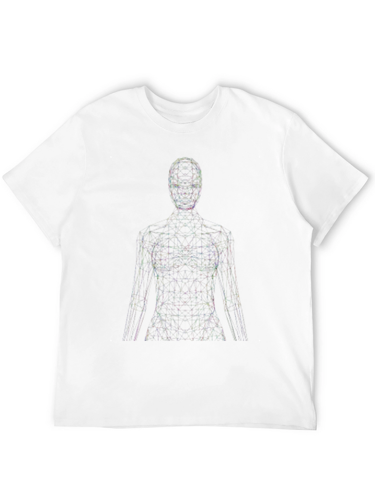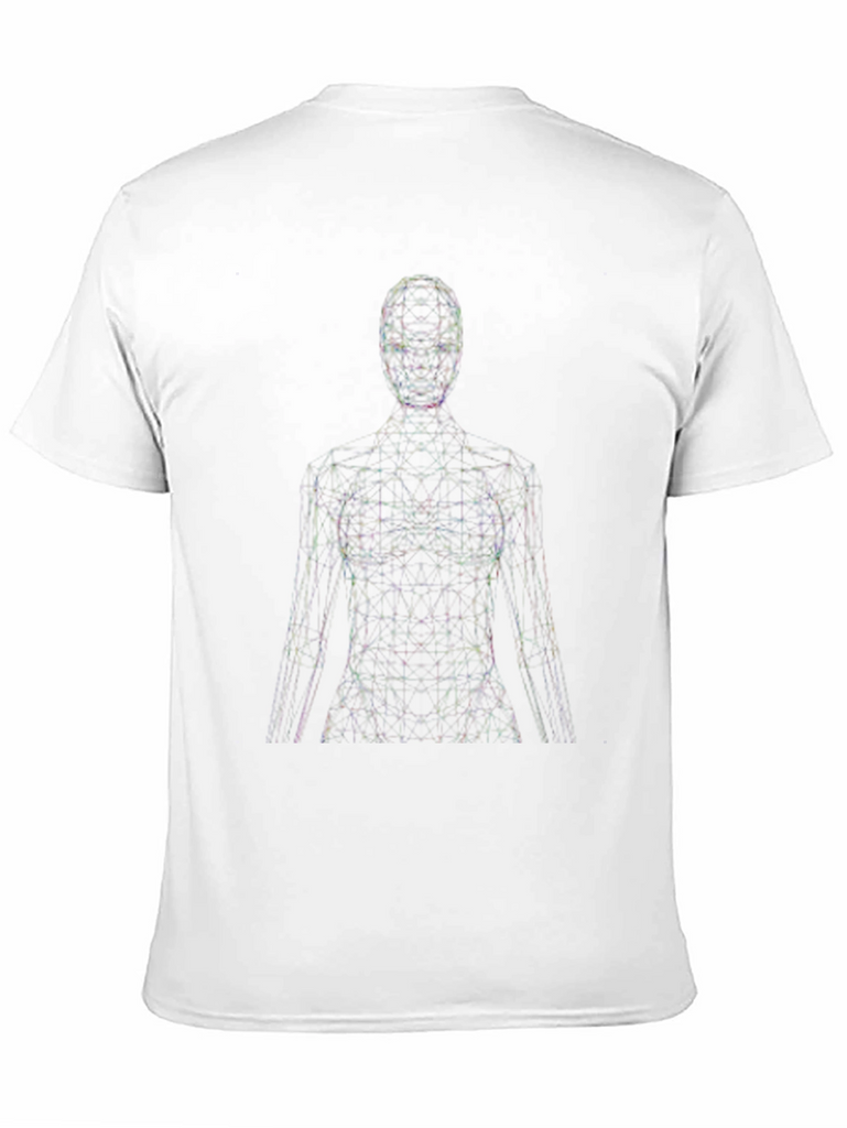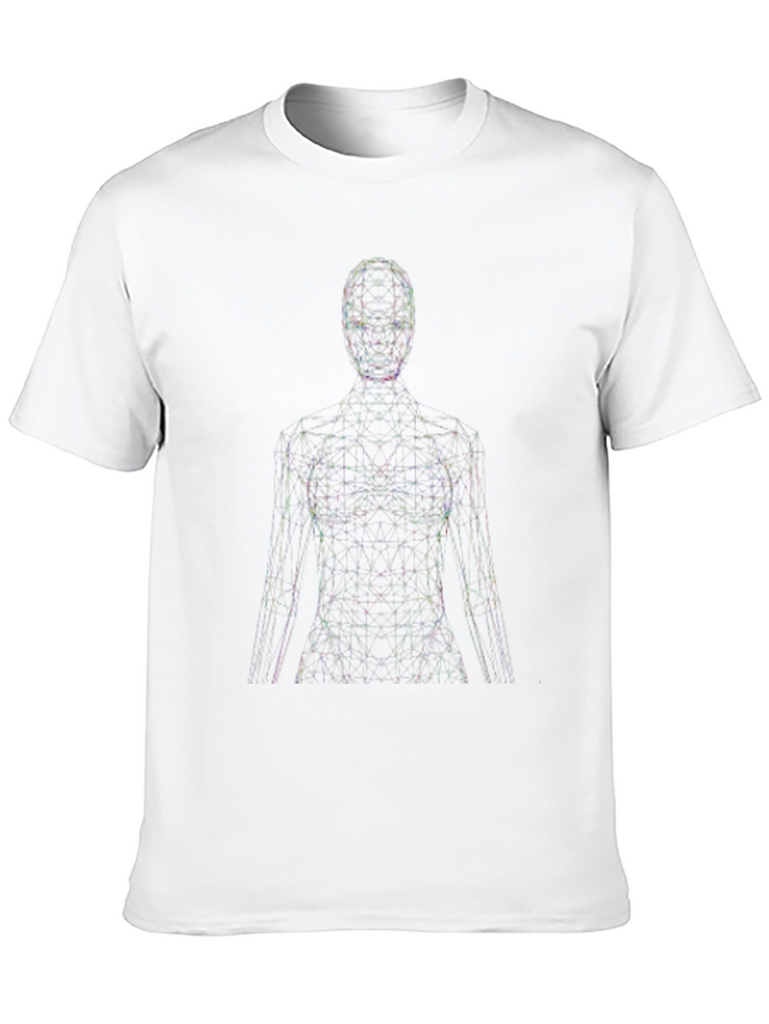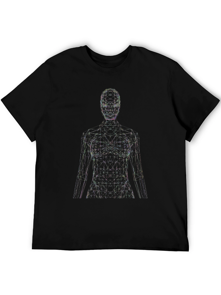 Elevate your style with this modern graphic tee. The shirt features an eye-catching abstract figure design composed of interconnected lines and points, creating a futuristic, digital aesthetic. Made from a comfortable, soft fabric, this black t-shirt offers a relaxed fit perfect for everyday wear. The unique design makes it a great conversation starter, ideal for casual outings, concerts, or expressing your individuality. Pair it with jeans, shorts, or layer it under a jacket for a versatile look. Add a touch of contemporary art to your wardrobe with this standout piece.