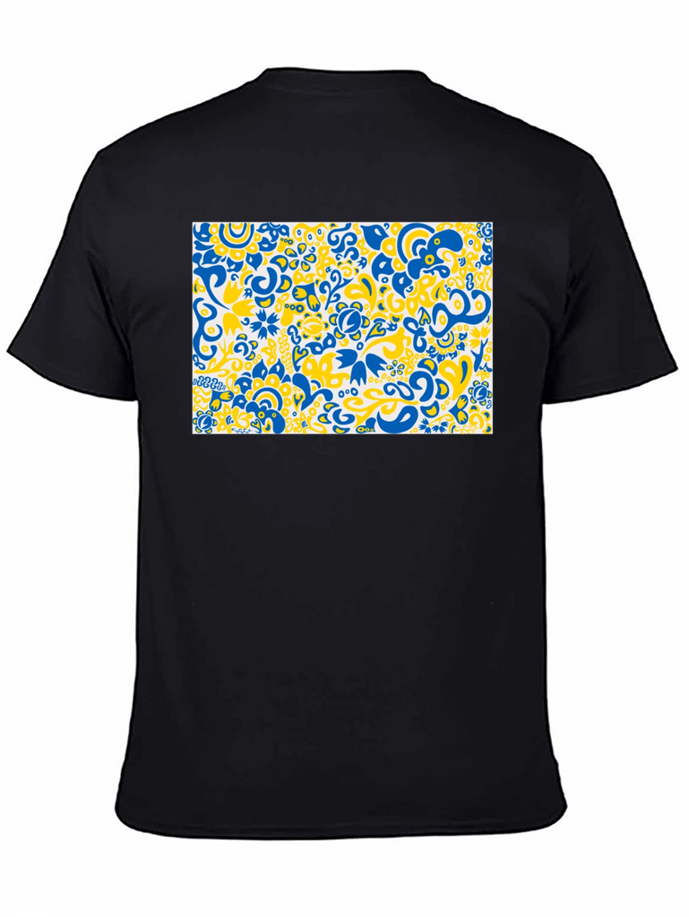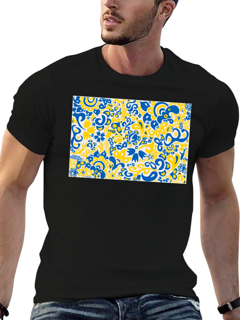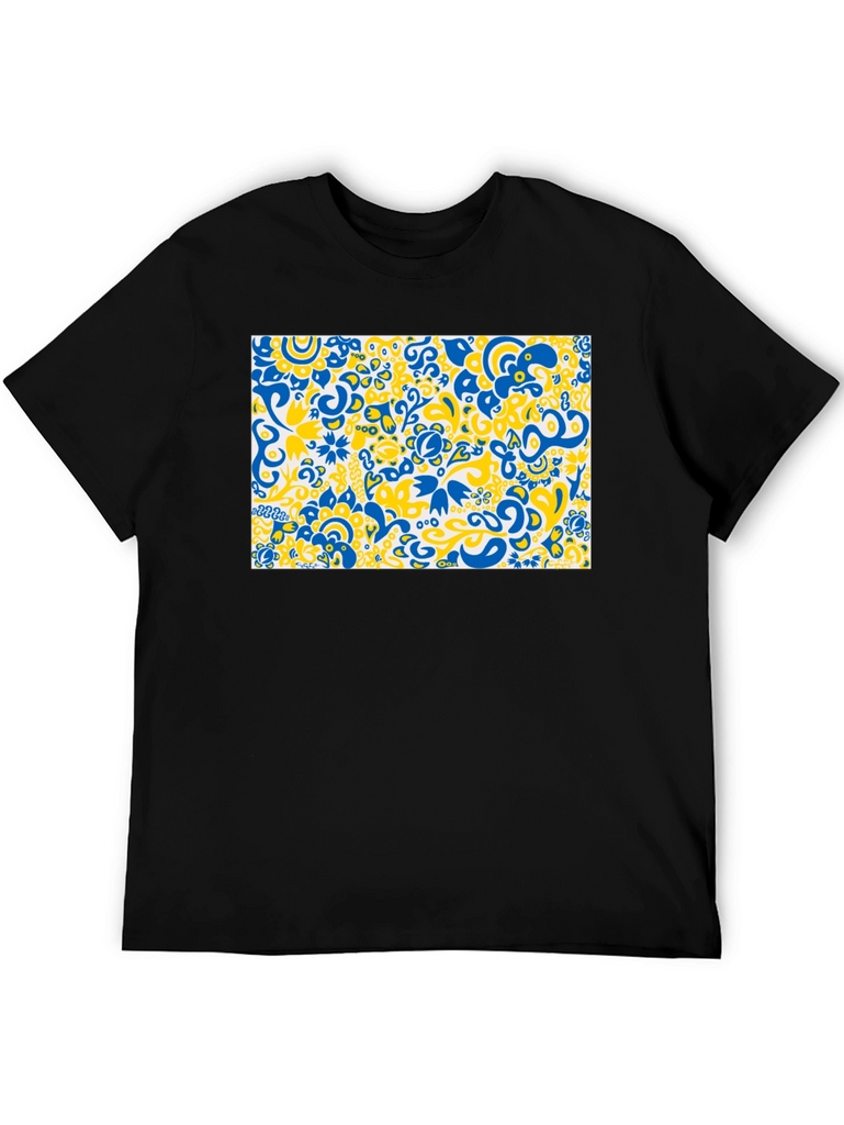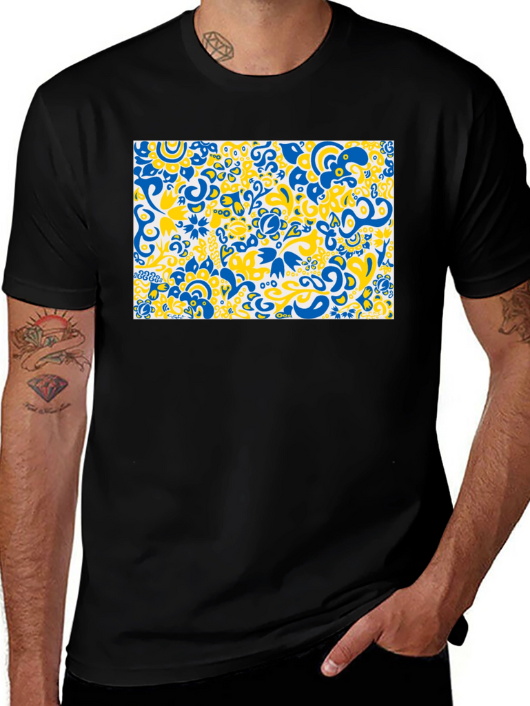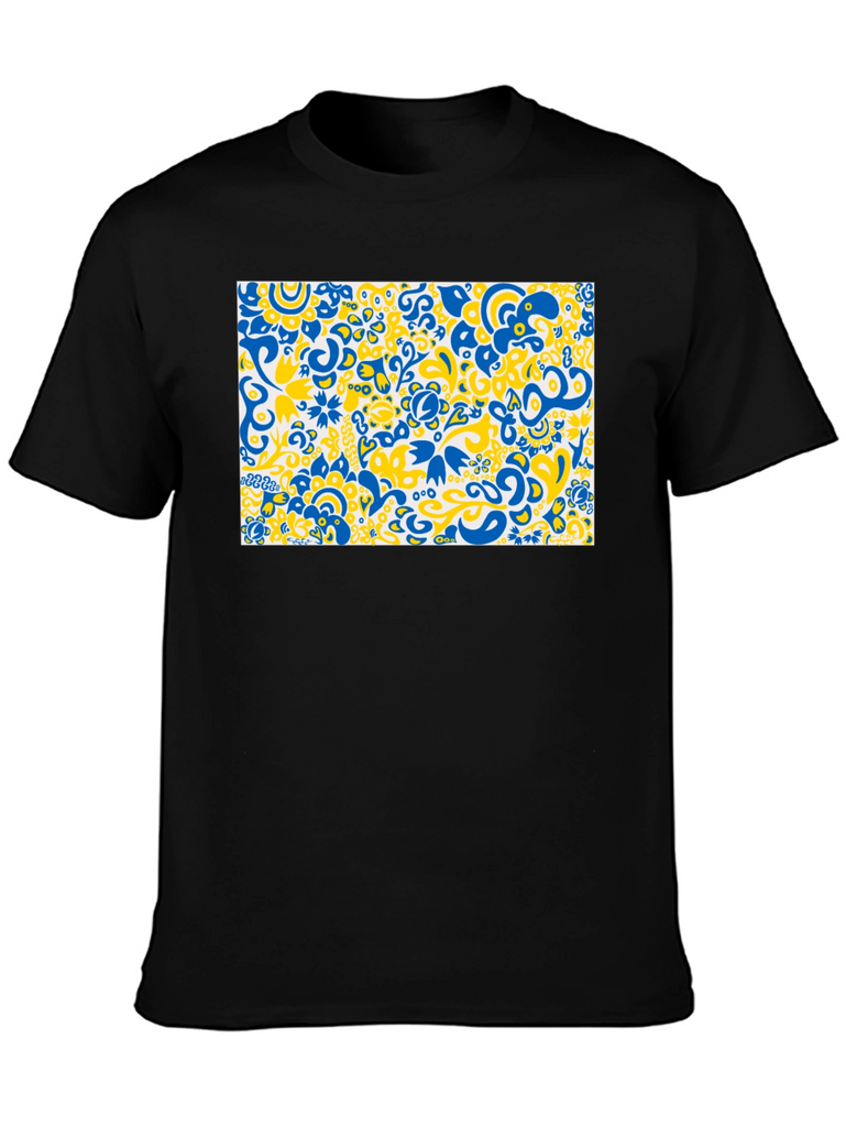Show off your unique style with this eye-catching t-shirt featuring an abstract floral design. The vibrant yellow and blue pattern pops against the classic black tee. Made from soft, comfortable fabric, this shirt is perfect for casual wear, adding a touch of artistic flair to any outfit. Whether you're heading out with friends or just relaxing at home, this t-shirt is sure to make a statement. Its bold design ensures you'll stand out from the crowd. Machine washable for easy care. Get yours today and express your individuality!