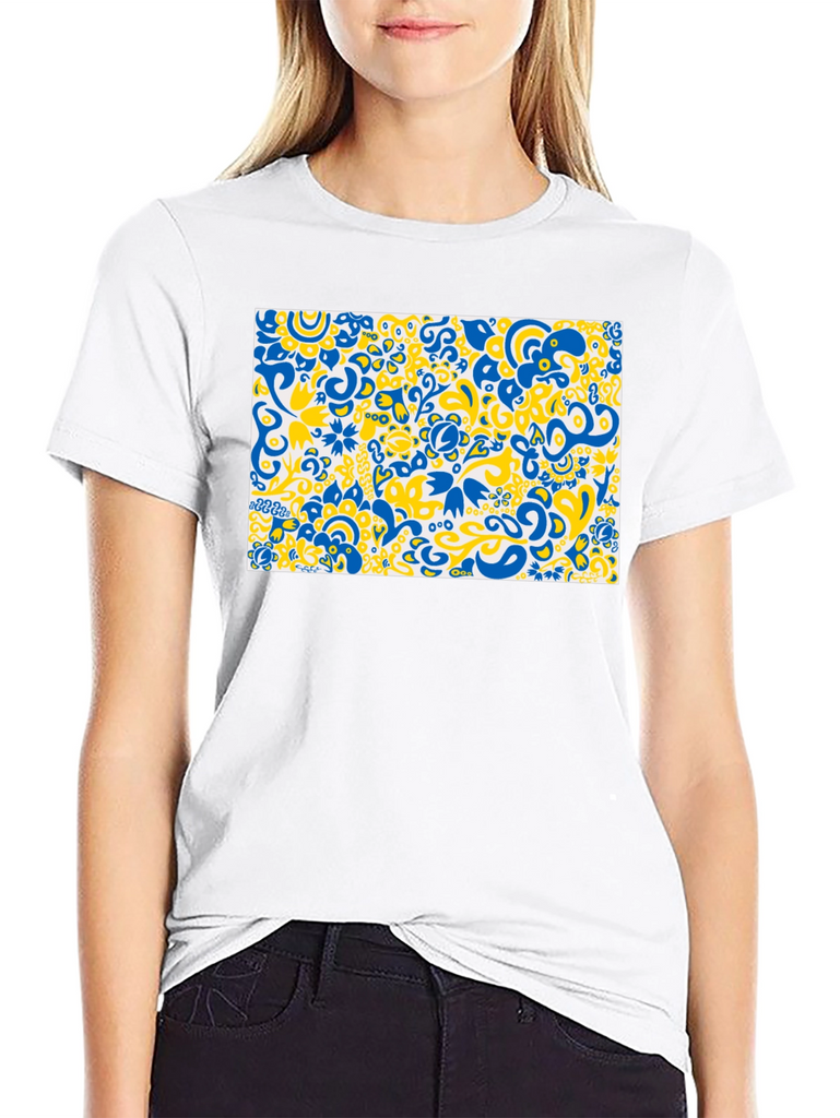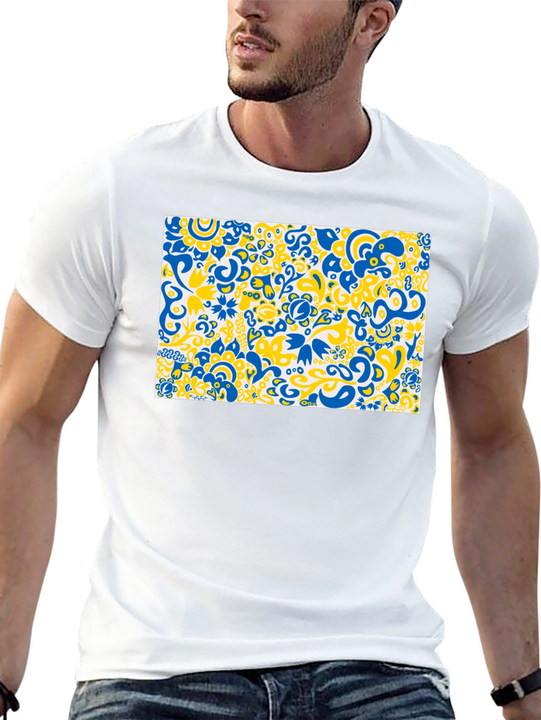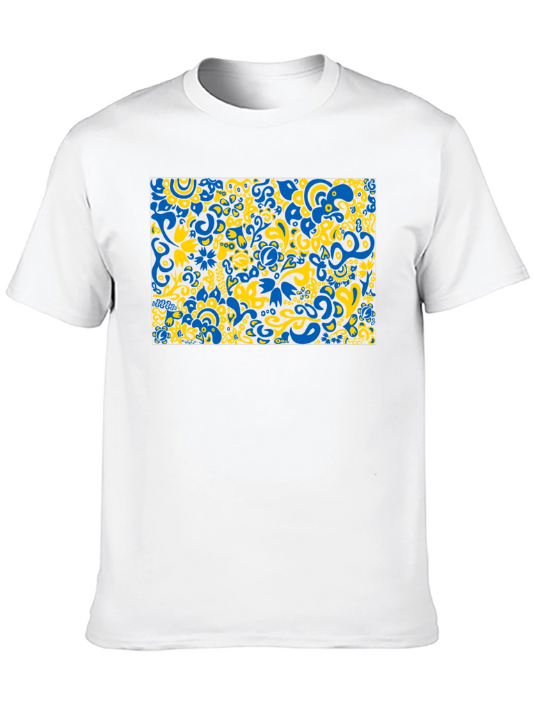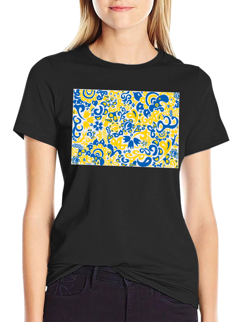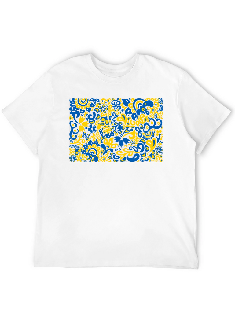 Show off your unique style with this eye-catching t-shirt featuring an abstract floral design. The vibrant yellow and blue pattern pops against the classic black tee. Made from soft, comfortable fabric, this shirt is perfect for casual wear, adding a touch of artistic flair to any outfit. Whether you're heading out with friends or just relaxing at home, this t-shirt is sure to make a statement. Its bold design ensures you'll stand out from the crowd. Machine washable for easy care. Get yours today and express your individuality!