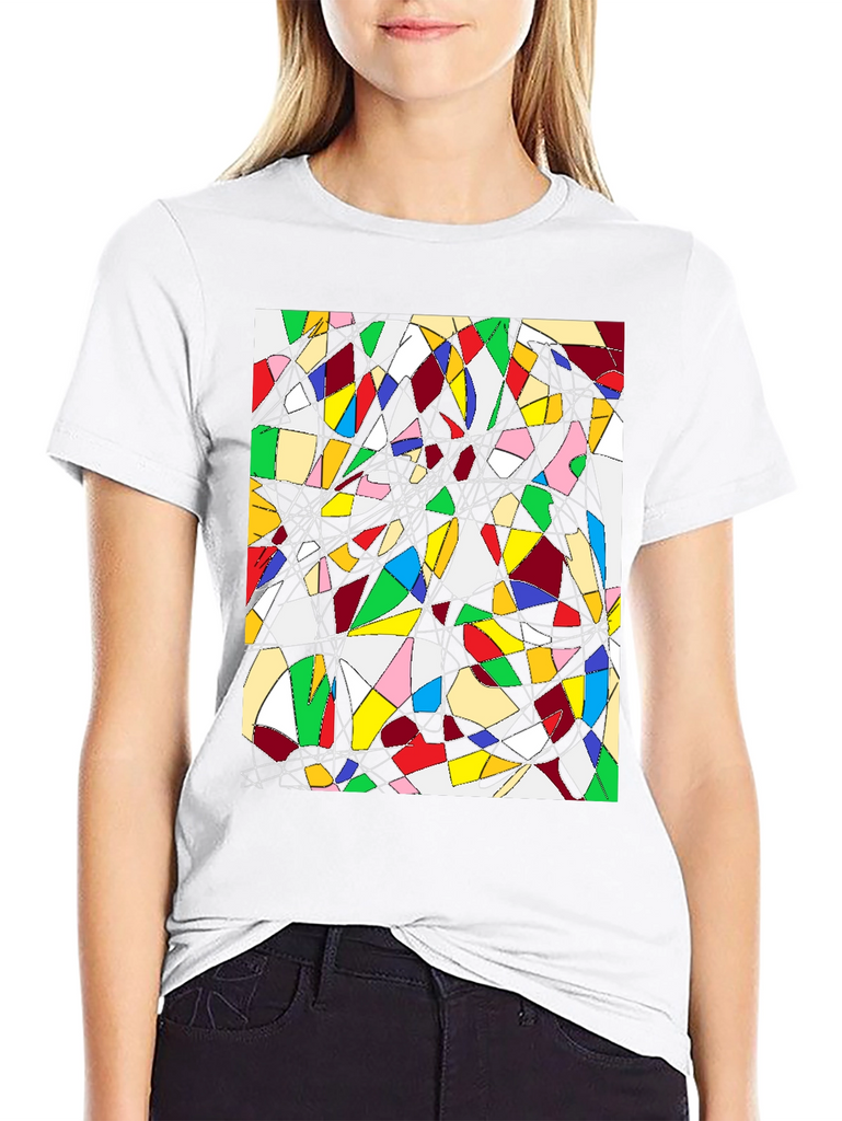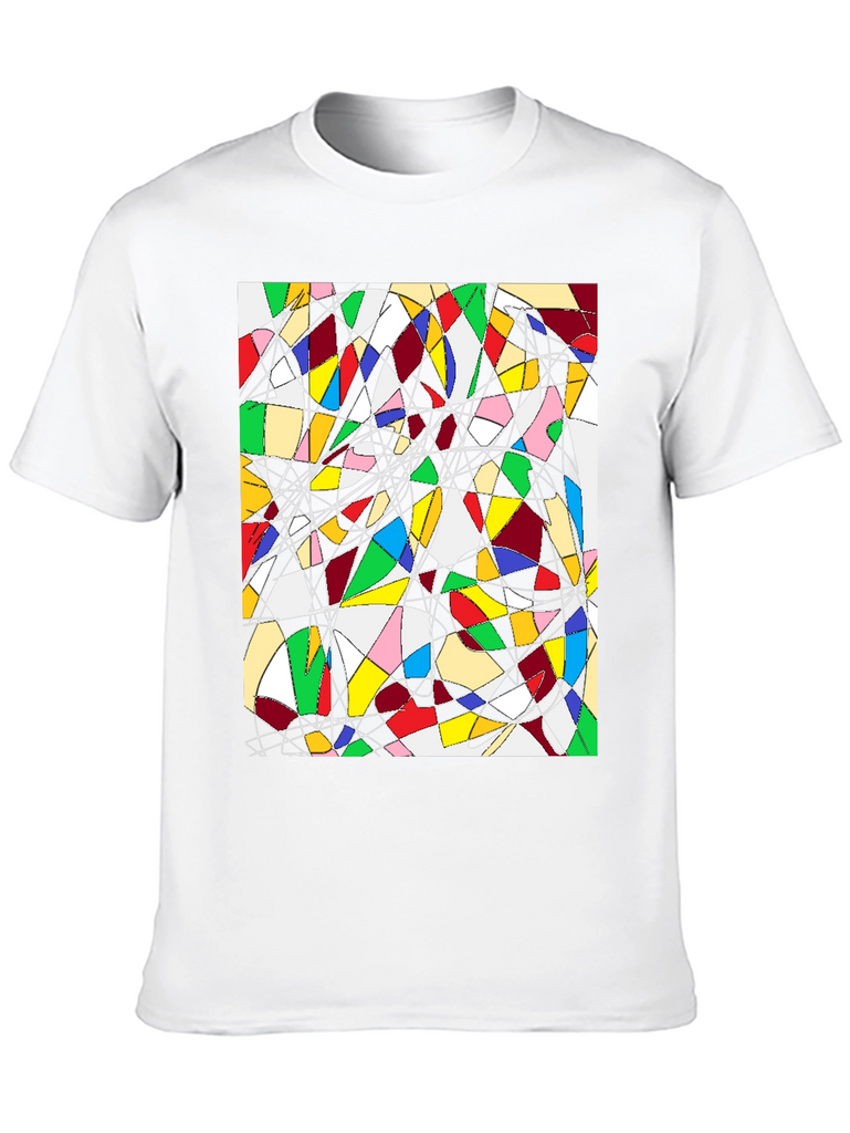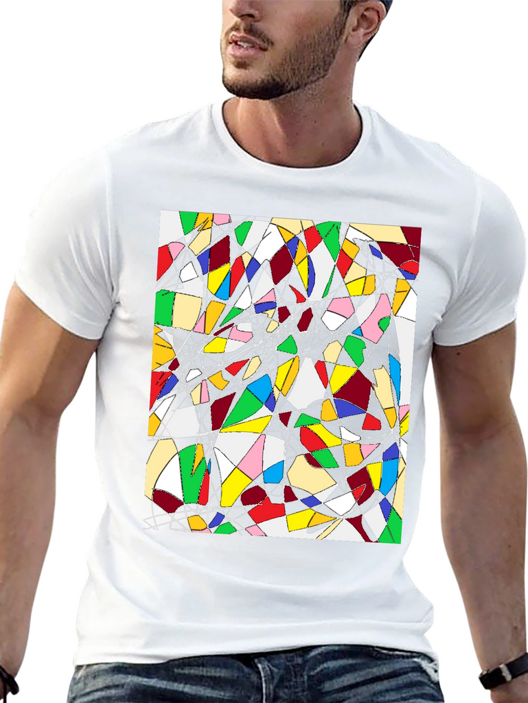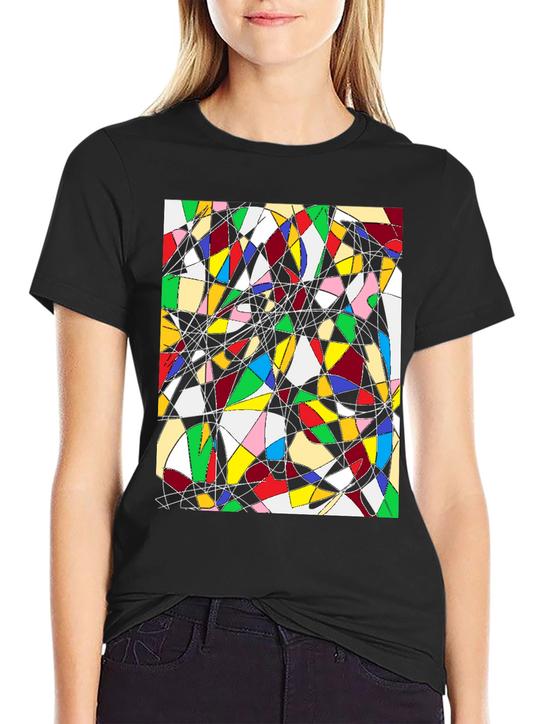 Make a statement with this unique black t-shirt featuring an eye-catching abstract geometric design. The vibrant artwork showcases a captivating array of colorful shapes interconnected with thin black and white lines. Made from comfortable fabric, this tee is perfect for adding a touch of modern art to your everyday wardrobe. Wear it casually with jeans or dress it up for a creative and stylish look. Ideal for art enthusiasts and anyone who appreciates bold, distinctive designs. Stand out from the crowd and express your individuality with this wearable piece of art.