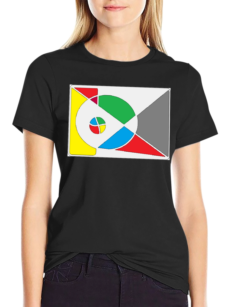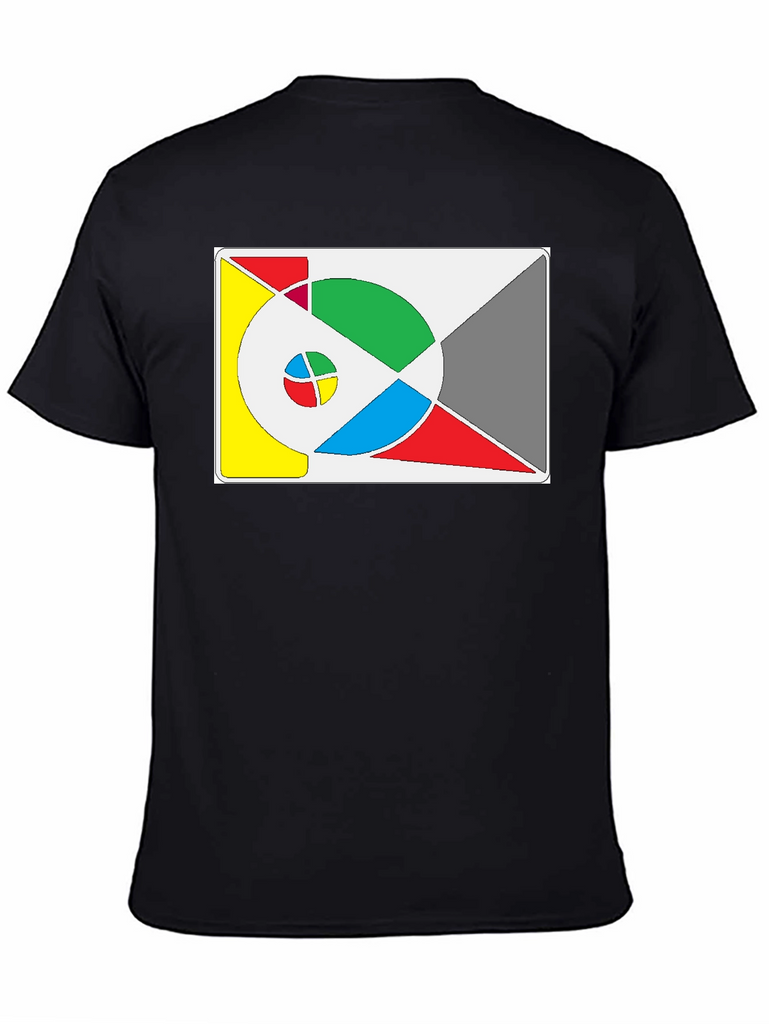Make a bold statement with this striking black t-shirt featuring a unique, abstract geometric design. The eye-catching graphic consists of colorful shapes including circles, triangles, and sections in red, green, blue, yellow, and gray, all arranged within a white outlined rectangle. Perfect for adding an artistic edge to your casual wardrobe, this shirt is a conversation starter. Whether you're heading to a gallery opening, a casual get-together, or just want to express your individuality, this shirt is sure to turn heads and showcase your unique style.