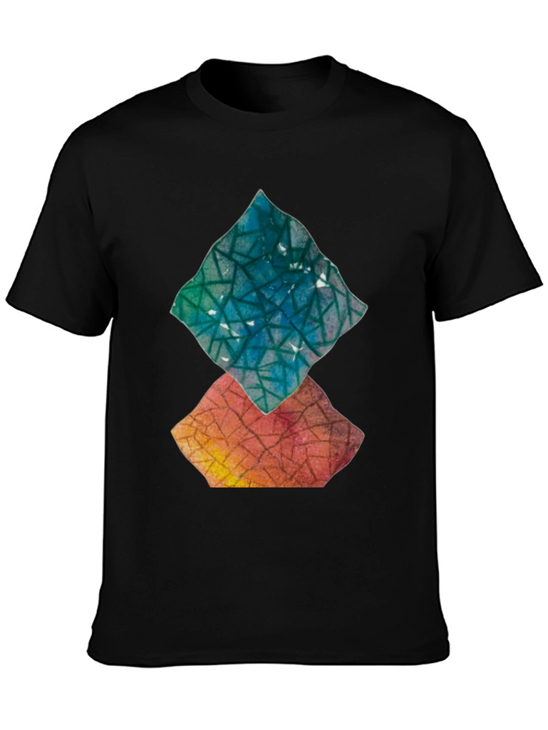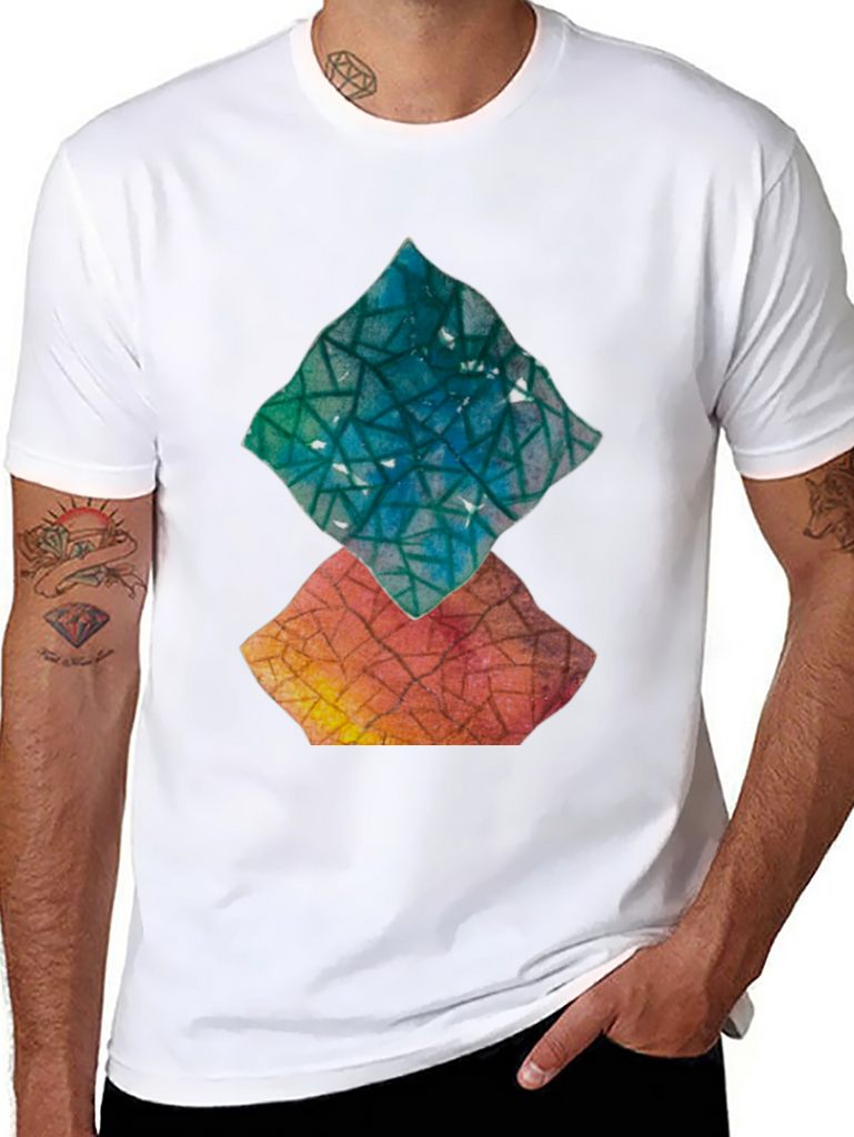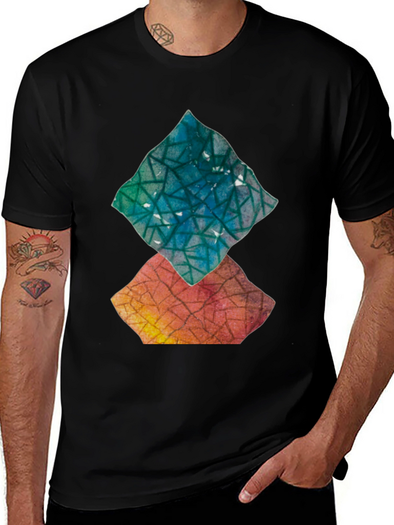 This unique t-shirt features an eye-catching abstract geometric design. The pattern consists of two stacked diamond shapes, with the top diamond featuring shades of blue and green, and the bottom diamond showcasing a warm blend of yellow, orange, and red. The intricate, fractured pattern within each diamond adds a touch of modern art to your everyday wardrobe. Crafted from a comfortable, soft fabric, this tee is perfect for casual wear, concerts, or making a statement. Pair it with jeans, shorts, or a skirt for a versatile look that expresses your unique style. Show off your artistic side with this standout piece.