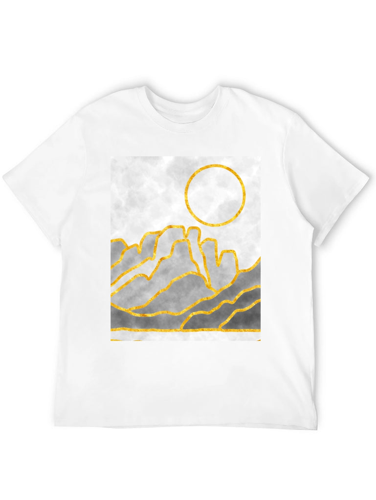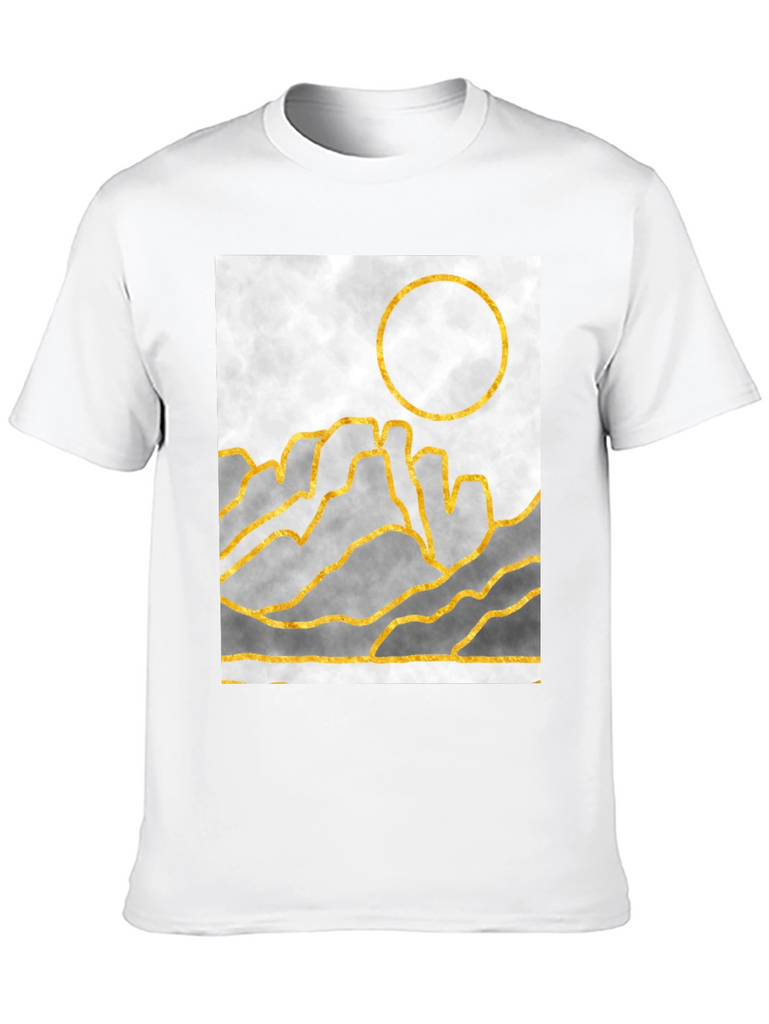 Elevate your casual style with this eye-catching t-shirt. Featuring an abstract mountain landscape design with gold line accents against a marble-like background, this shirt adds a touch of modern artistry to any outfit. The design includes a sun element for an extra pop of style. Made from soft, breathable fabric, it offers all-day comfort. Pair this unique t-shirt with jeans, shorts, or your favorite casual pants for a standout look. Perfect for everyday wear, art enthusiasts, or anyone looking to make a statement.