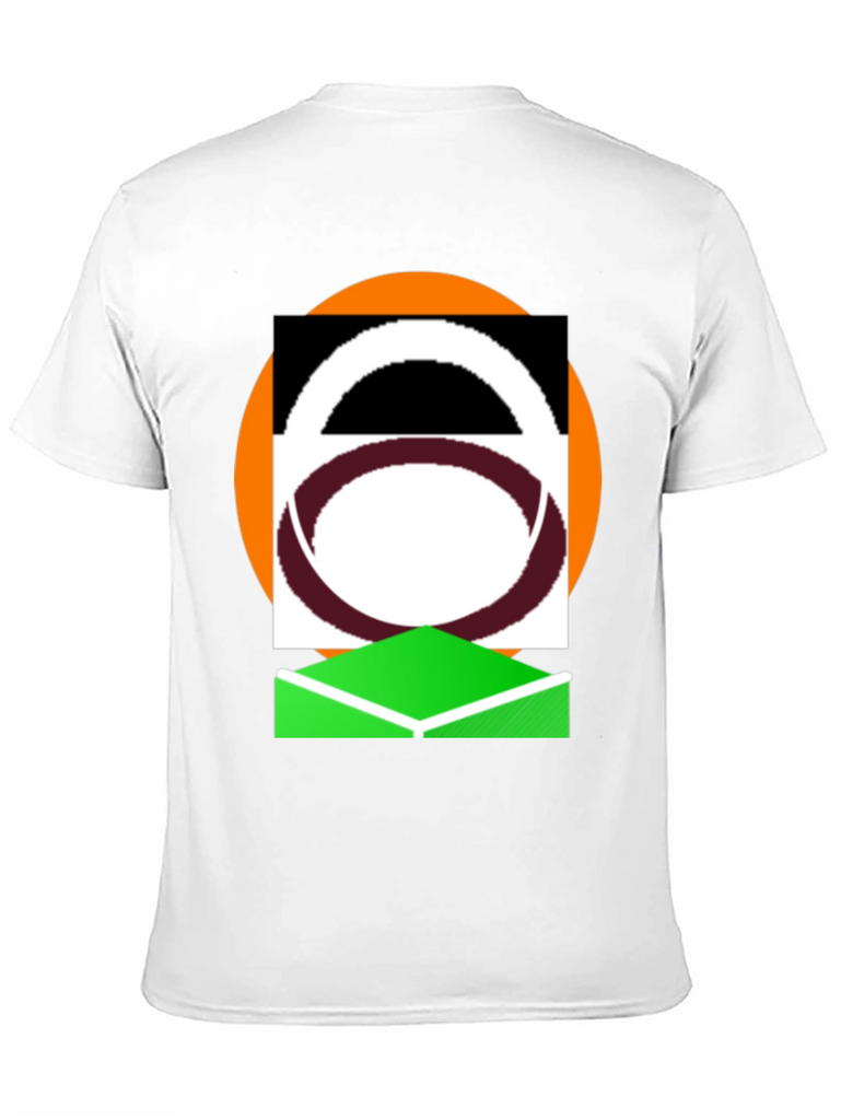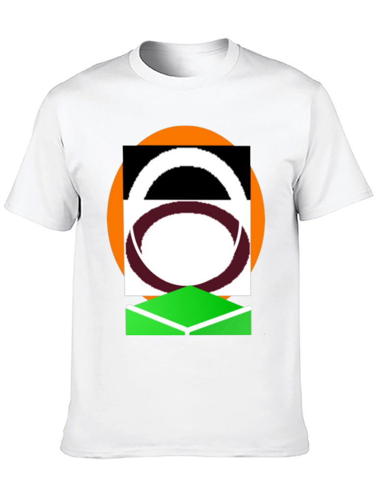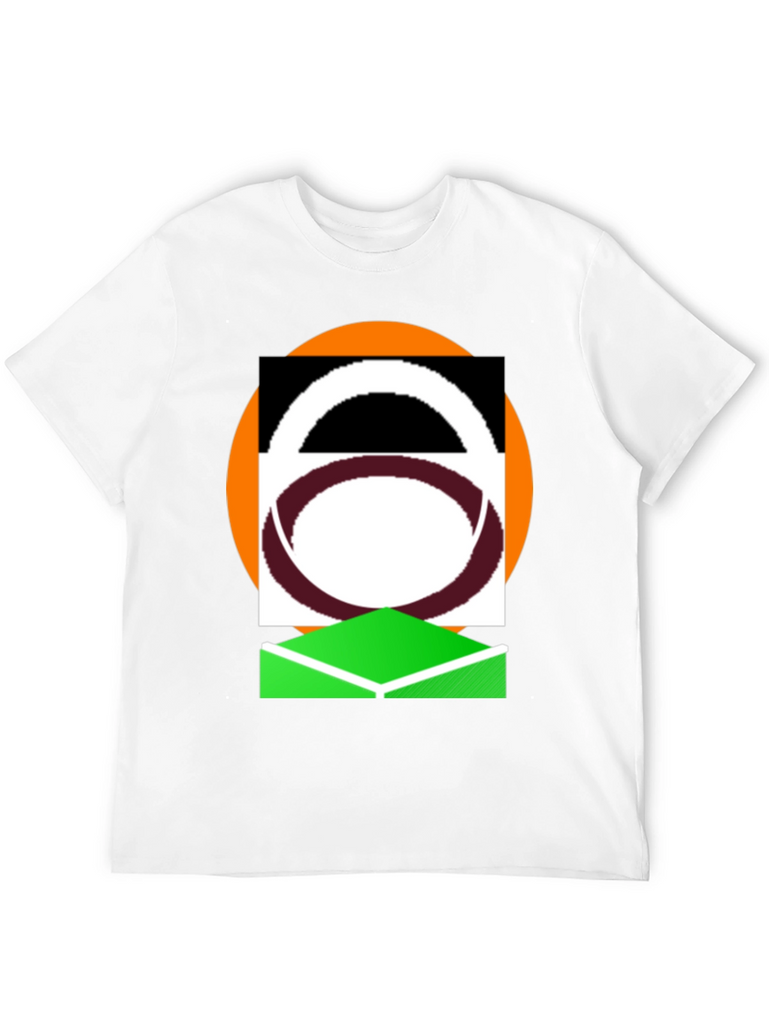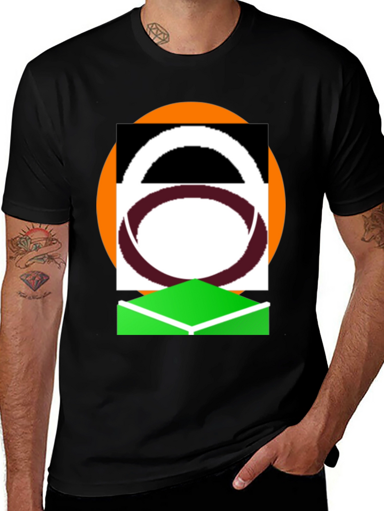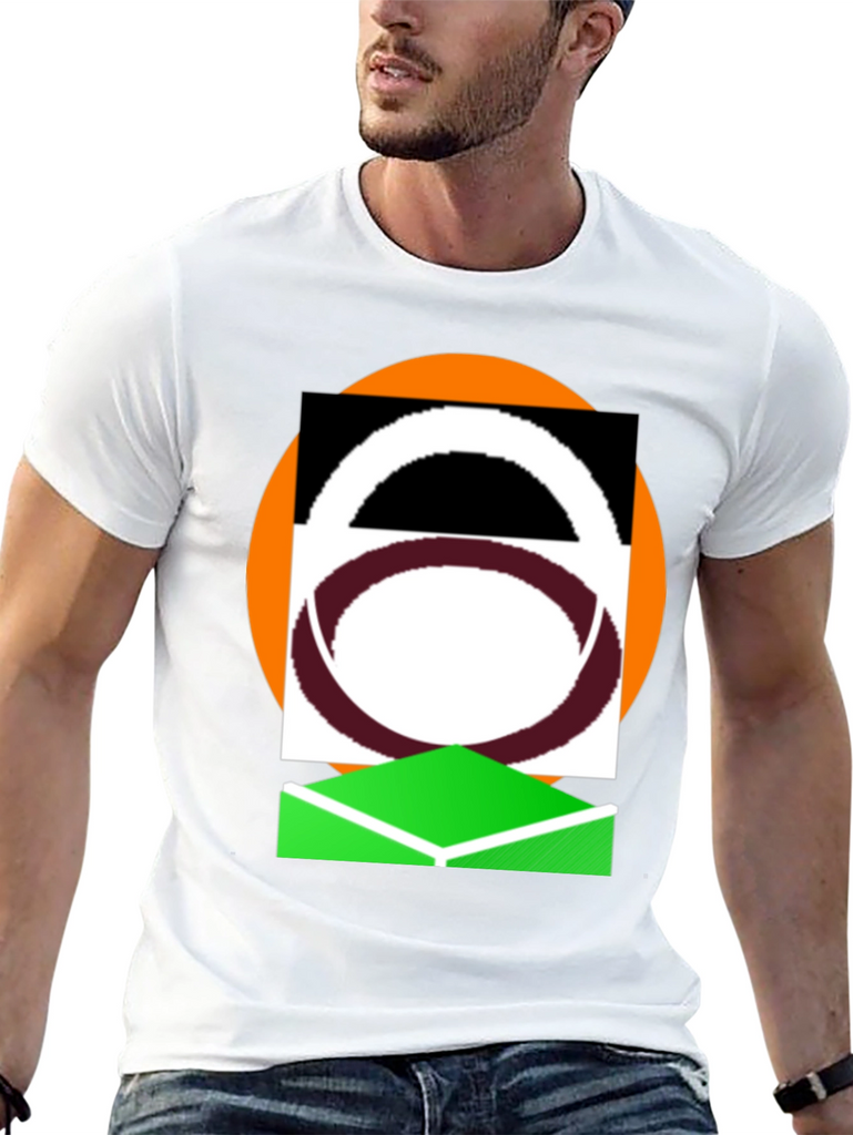 This eye-catching black t-shirt features a bold, abstract graphic design. The design incorporates geometric shapes, including circles and a trapezoid, rendered in vibrant colors such as orange, white, black, green, and maroon. The graphic is centrally located on the chest, making it a standout piece. Made from a comfortable-looking fabric, this tee is perfect for casual wear. Pair it with jeans or shorts for a relaxed yet stylish look. Express your unique sense of style with this artistic and modern t-shirt.
