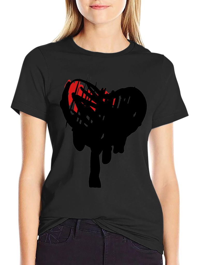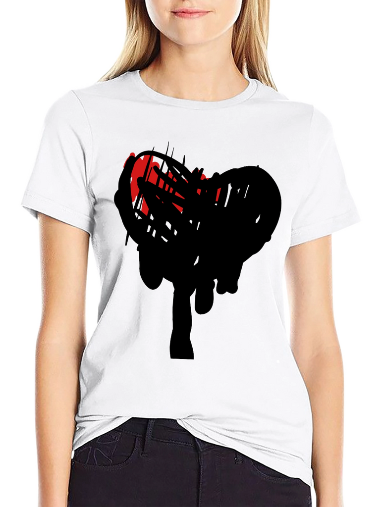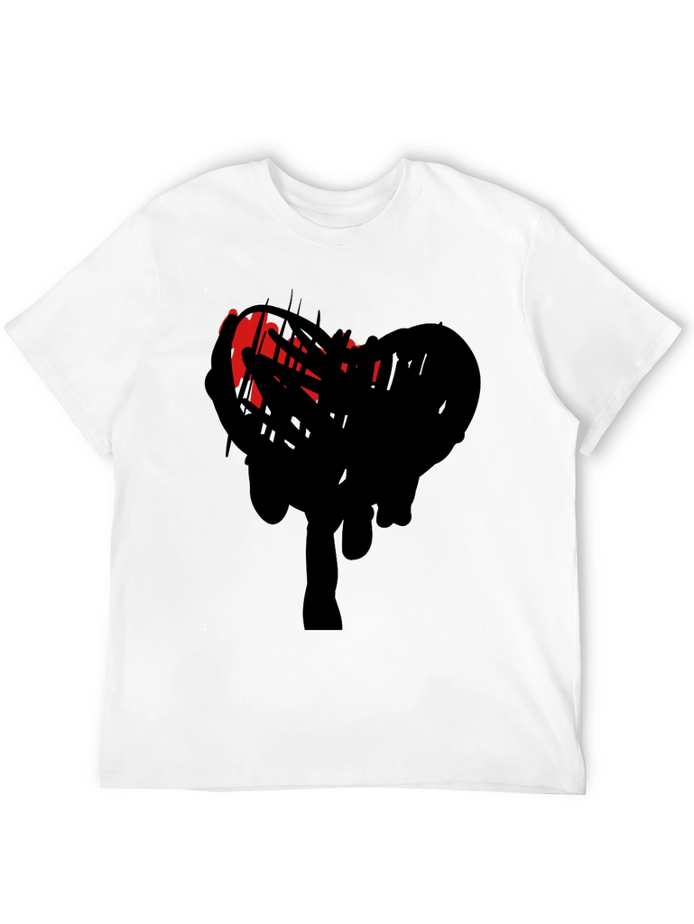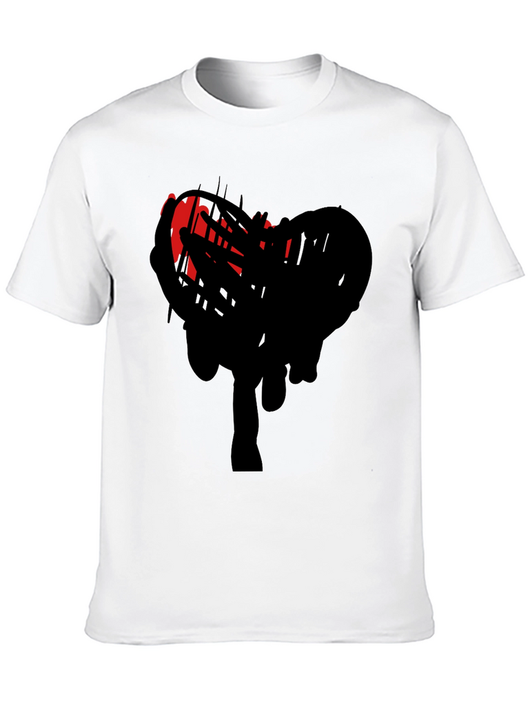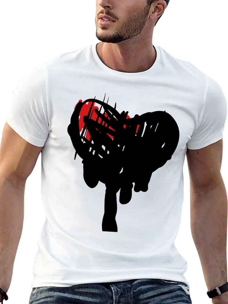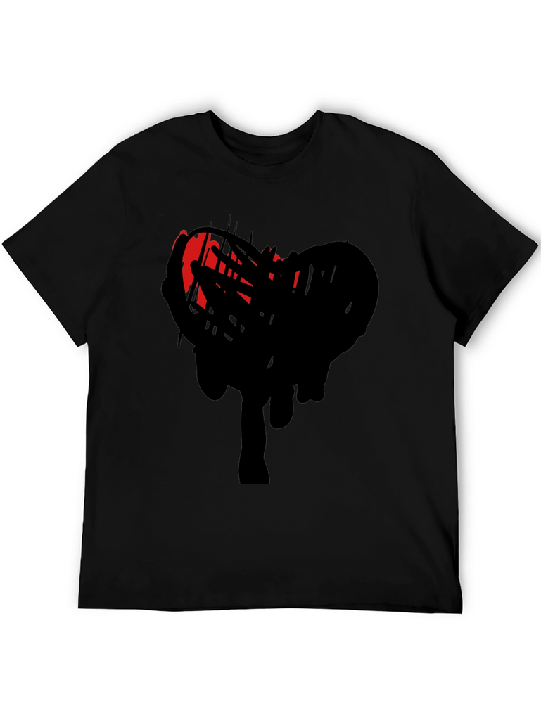 Express your edgy style with this black t-shirt featuring an abstract heart graphic. The design includes a bold, stylized heart shape with unique brushstroke and dripping effects, creating a modern and artistic look. Made from comfortable materials, this tee is perfect for casual wear, concerts, or expressing your unique personality. Pair it with jeans, shorts, or layer it under a jacket for versatile styling options. Make a statement with this eye-catching t-shirt that blends art and fashion, perfect for those who appreciate unique designs.