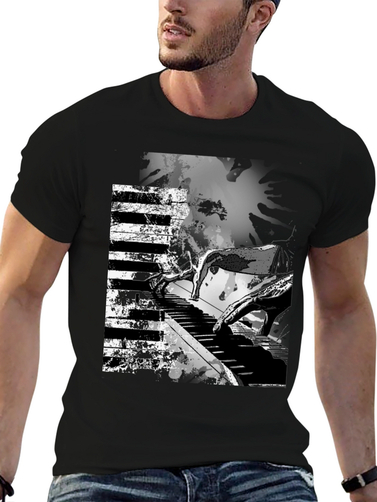 Show off your artistic side with this eye-catching black t-shirt. Featuring a unique abstract graphic print of piano keys, this tee is sure to turn heads. The design incorporates a blend of sharp lines and soft, smoky elements for a modern and edgy look. Made from a comfortable, breathable fabric, this t-shirt is perfect for everyday wear. Pair it with jeans or shorts for a casual style, or dress it up with a blazer for a more sophisticated vibe. Express your love for music and art with this must-have piece!