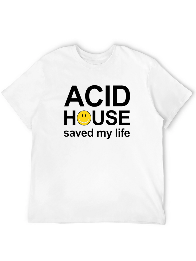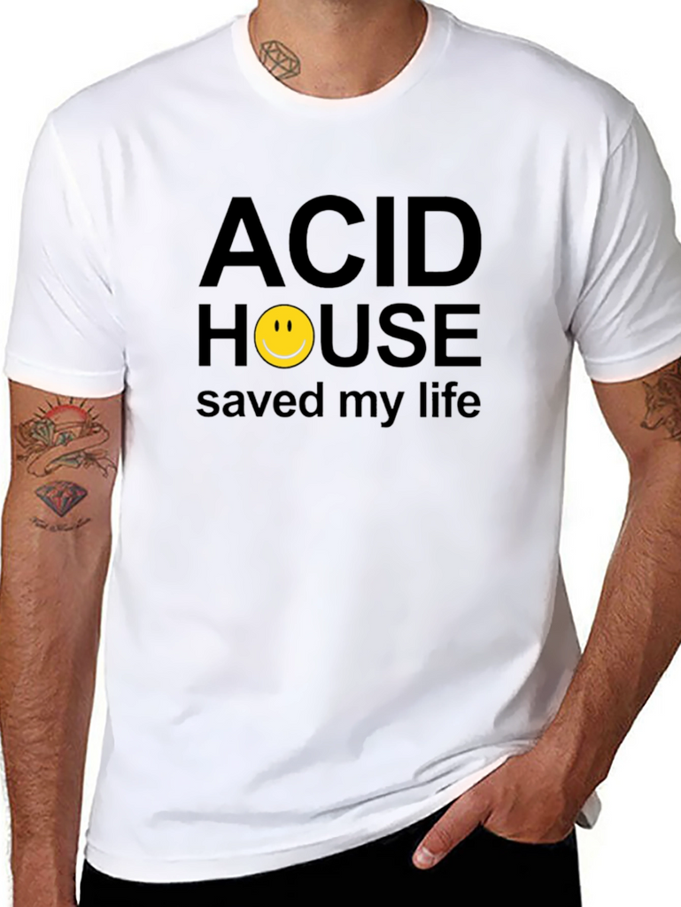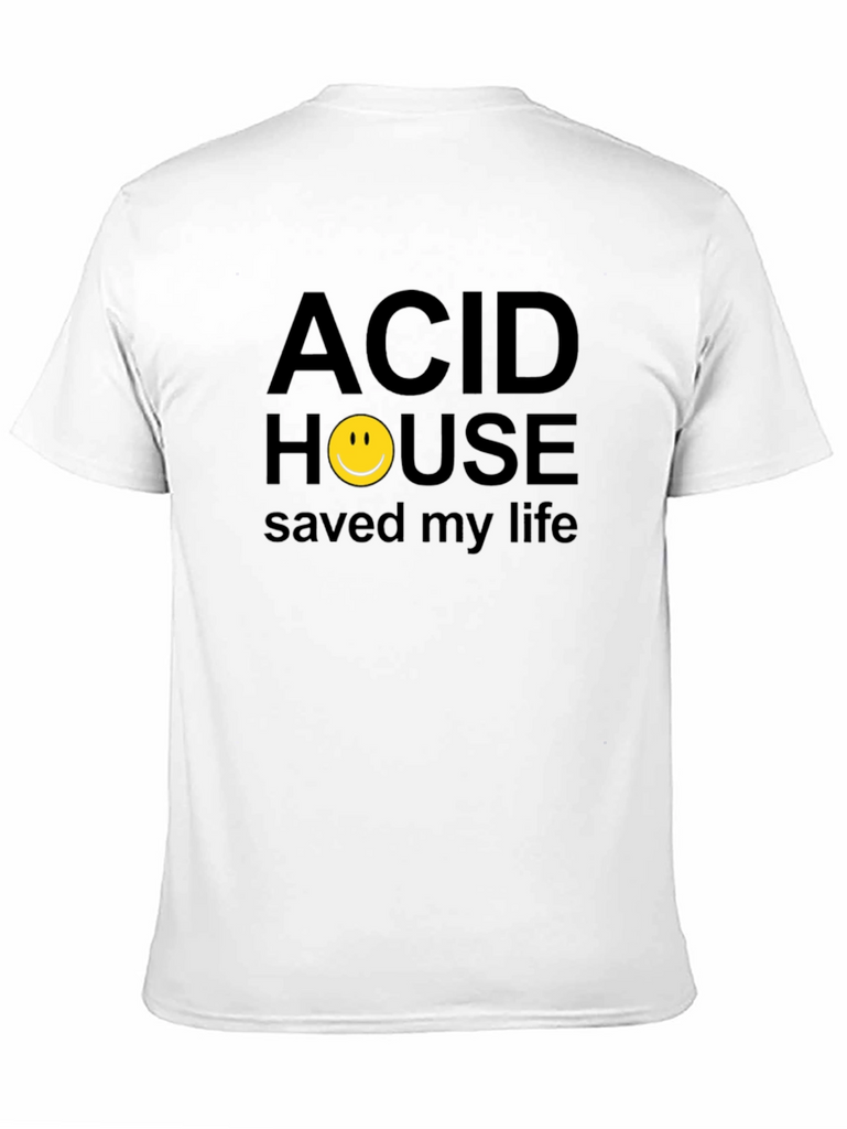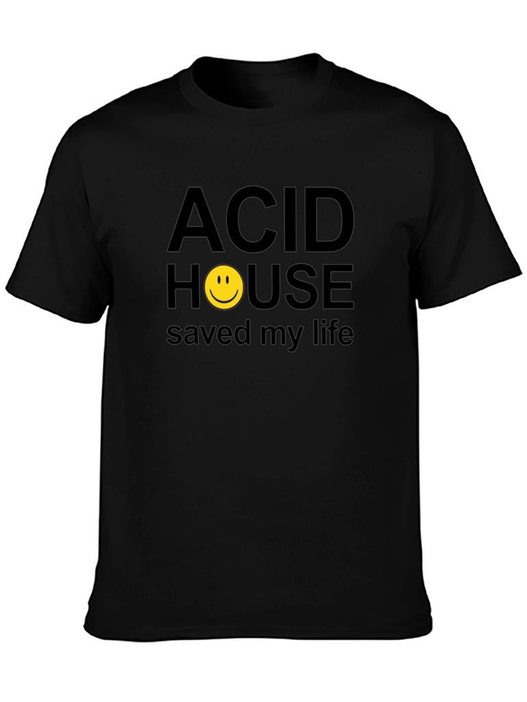 This classic black t-shirt features a bold, eye-catching graphic print. The design includes the phrase "ACID HOUSE saved my life" in a straightforward, sans-serif font. The word "HOUSE" is creatively replaced with a bright yellow smiley face symbol. Made from what appears to be a comfortable cotton blend, this tee is perfect for casual wear and expressing your unique style. Ideal for music lovers, vintage enthusiasts, or anyone who appreciates quirky and nostalgic designs. Pair it with jeans, shorts, or a skirt for a relaxed yet trendy look. It's a statement piece that's sure to spark conversations and showcase your personality.