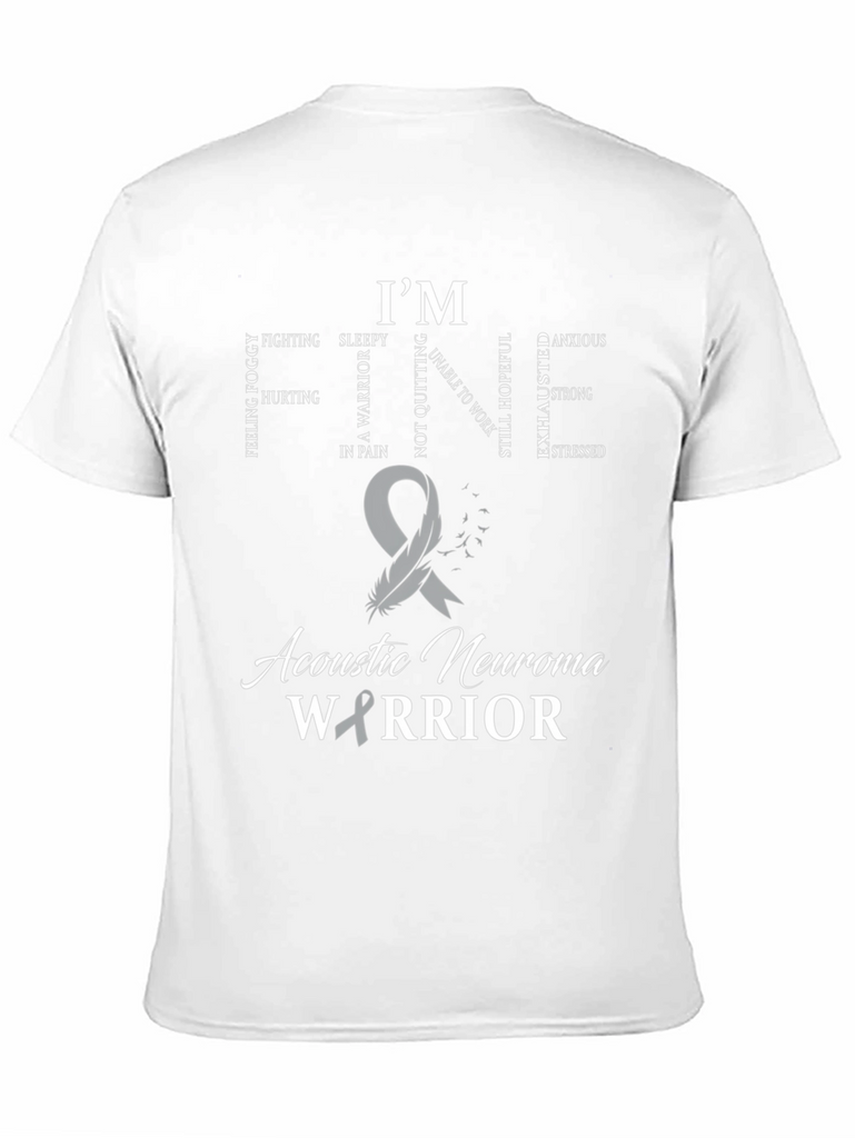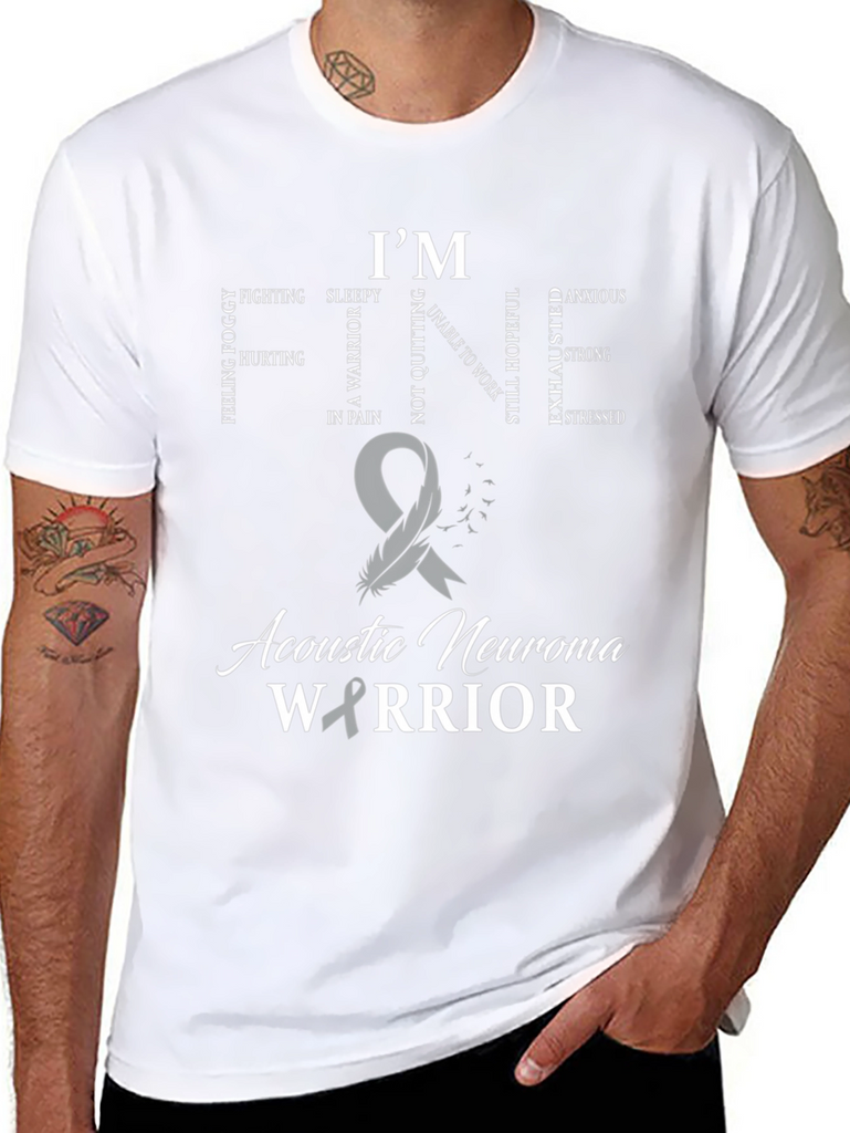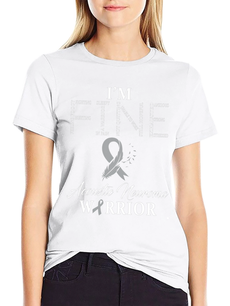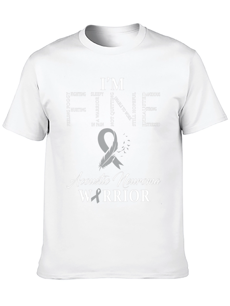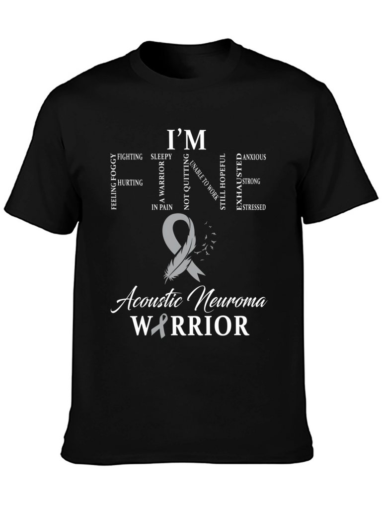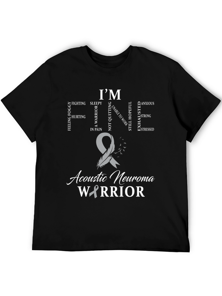 Show your support with this powerful black t-shirt dedicated to Acoustic Neuroma Warriors. Featuring a grey awareness ribbon intertwined with inspiring words like "Fighting", "Hopeful", and "Strong", this shirt embodies resilience. The central graphic displays "Acoustic Neuroma WARRIOR" in elegant white lettering. Ideal for raising awareness, supporting loved ones, or wearing as a symbol of personal strength. This classic fit tee offers comfort and a meaningful message. Wear your warrior status with pride.
