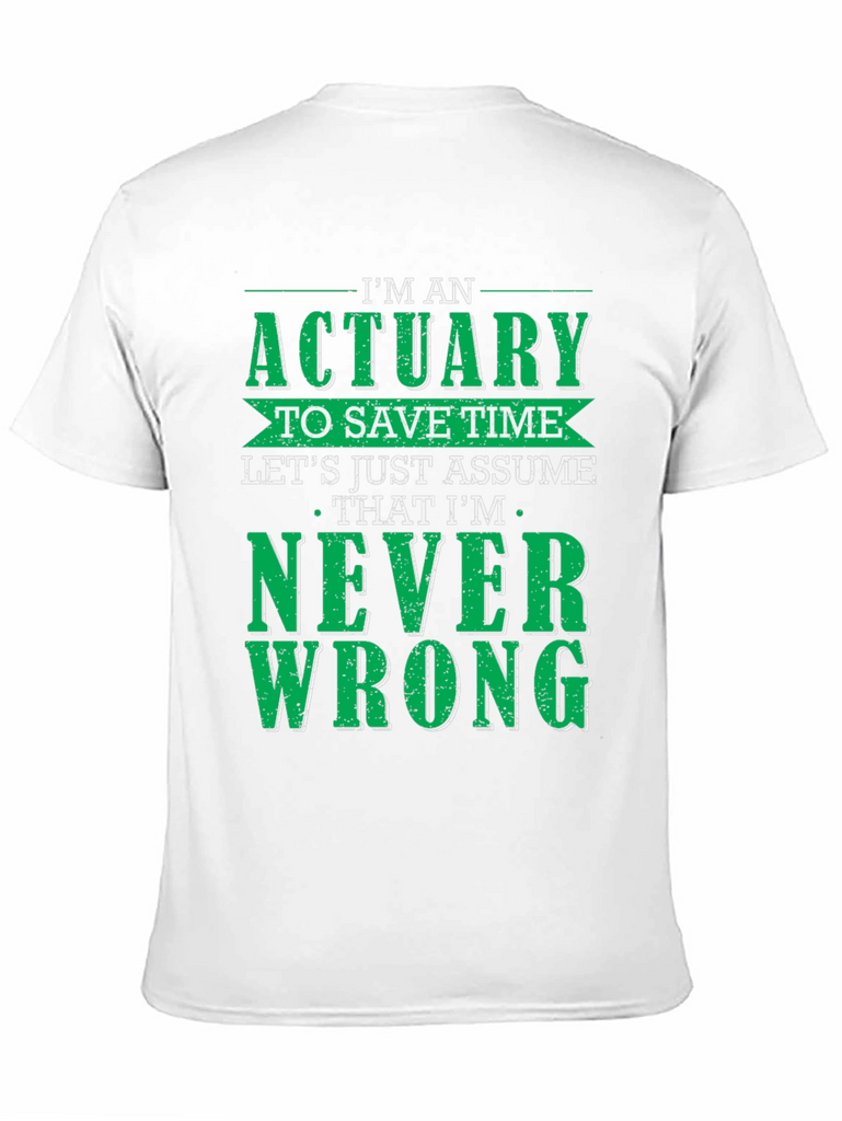 Make a statement with this black, short-sleeved t-shirt. Featuring a bold graphic print in green and white, the design reads, "I'm An Actuary to Save Time Let's Just Assume That I'm Never Wrong." The shirt is made from a comfortable-looking cotton blend, perfect for casual wear. Ideal for actuaries with a sense of humor, this tee is sure to spark conversations and showcase your professional pride. A fun and unique addition to any wardrobe.