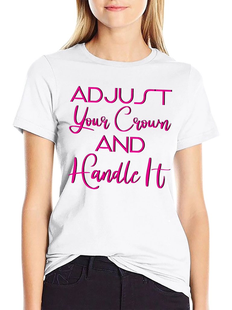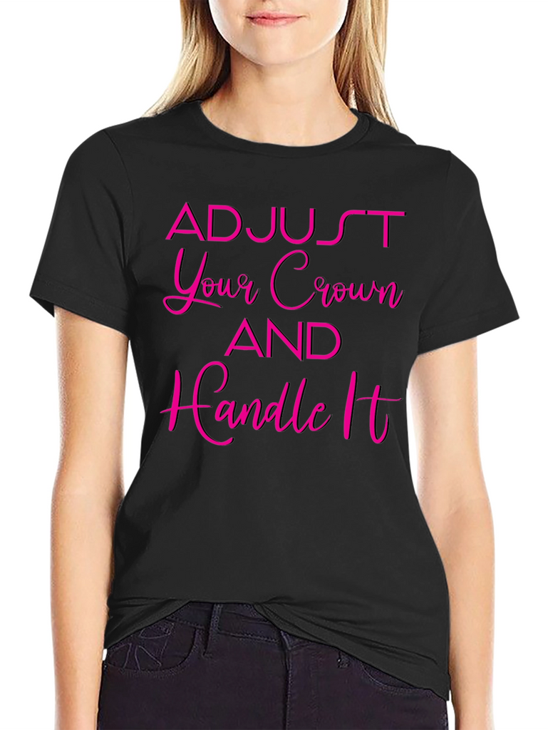 Embrace empowerment with this bold black tee! Featuring a vibrant pink graphic that reads "Adjust Your Crown and Handle It," this shirt is a statement piece. Crafted from a soft, comfortable fabric, it offers a relaxed fit for all-day wear. The classic crew neck and short sleeves make it a versatile addition to your wardrobe. Perfect for casual outings, empowering events, or simply expressing your confident self. Stand out and inspire with this unique and stylish tee!
