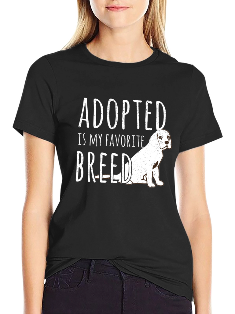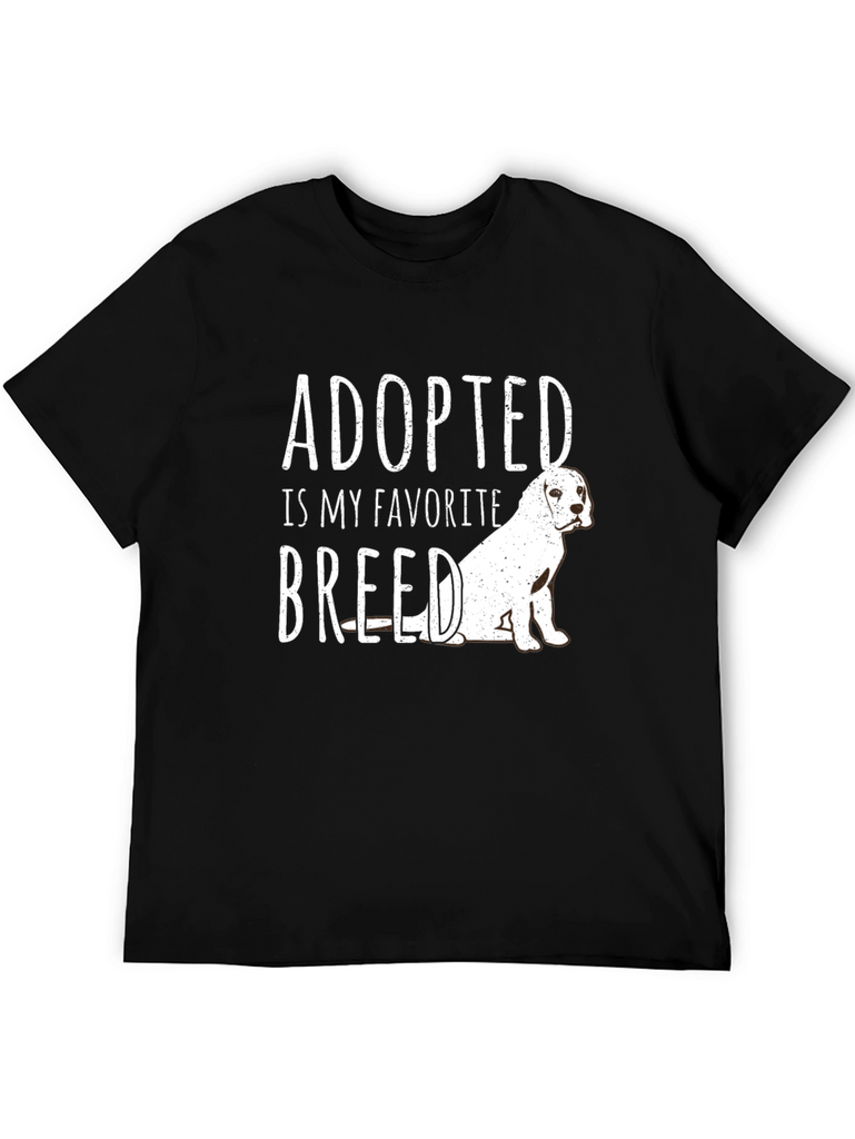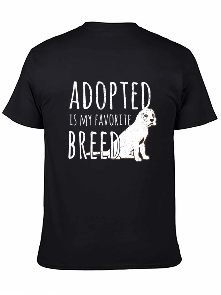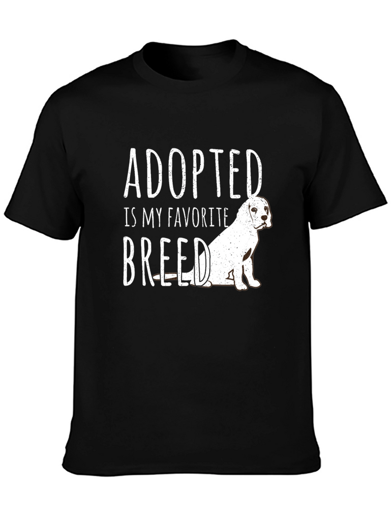 Show your love for rescued dogs with this stylish black t-shirt. It features the text "Adopted is my favorite breed" with an image of an adorable adopted dog. Made from a comfortable fabric, this shirt is perfect for everyday wear, dog walks, or showcasing your support for pet adoption. The classic fit and crew neck make it a versatile addition to any wardrobe. A great conversation starter for animal lovers and a perfect gift for dog rescuers and adopters. Wear it with pride and spread awareness about the wonderful benefits of adopting.