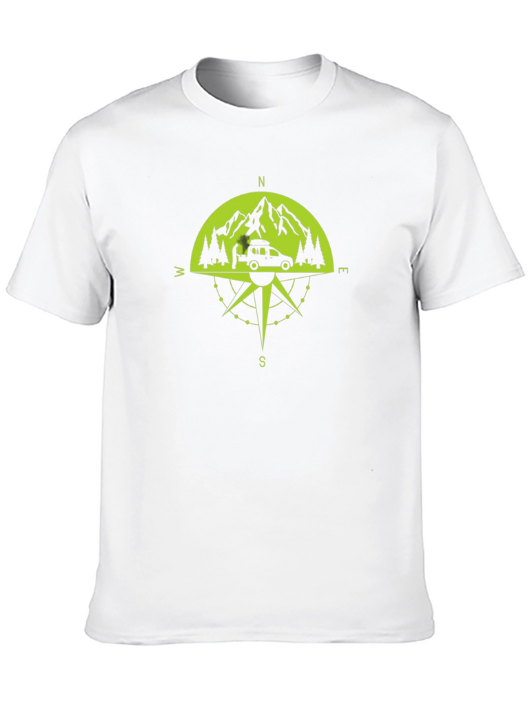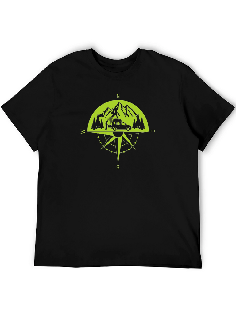 Embark on your next adventure with this stylish black t-shirt. Featuring a unique compass design incorporating mountains, trees, and a campervan, this shirt is perfect for outdoor enthusiasts. The graphic is rendered in a vibrant green hue, creating a striking contrast against the black fabric. Made from a comfortable, breathable material, this tee is ideal for everyday wear or your next camping trip. Show off your love for the great outdoors with this eye-catching and versatile t-shirt. Whether you're hiking, exploring, or just relaxing, this shirt is a must-have addition to your wardrobe.