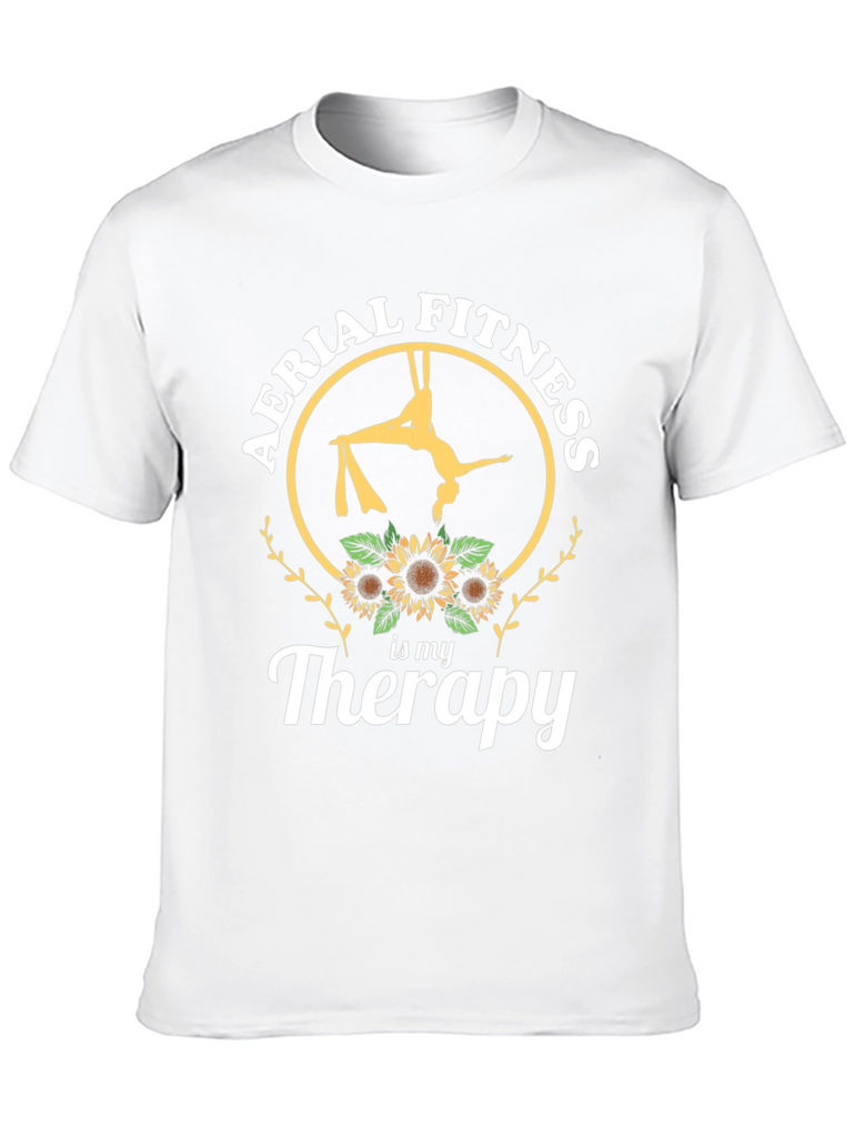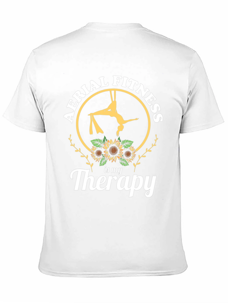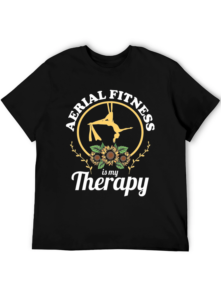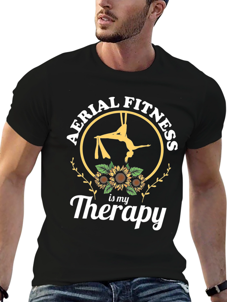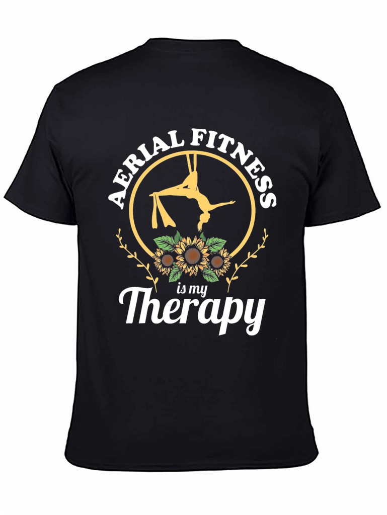Embrace your passion with this striking black t-shirt featuring a unique design. The graphic showcases an aerialist performing on silks inside a circular frame, adorned with the phrase "Aerial Fitness" at the top. Sunflowers decorate the bottom, followed by "is my Therapy" in a stylish script. Made from comfortable materials, this tee is perfect for expressing your love for aerial arts and fitness. Wear it to the gym, studio, or as a casual statement piece. It's an ideal gift for aerial enthusiasts seeking both comfort and style.