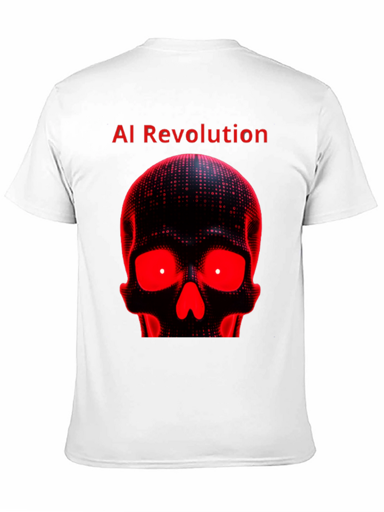 Embrace the future with this striking black t-shirt featuring a bold "AI Revolution" design. The shirt showcases a digitally styled skull with glowing red eyes, making a powerful statement. Made from a comfortable, breathable fabric, this tee is perfect for everyday wear. The unique graphic print ensures you'll stand out from the crowd. Ideal for tech enthusiasts, gamers, or anyone passionate about artificial intelligence. Rock this edgy design at your next event or casual outing and let your style speak volumes.